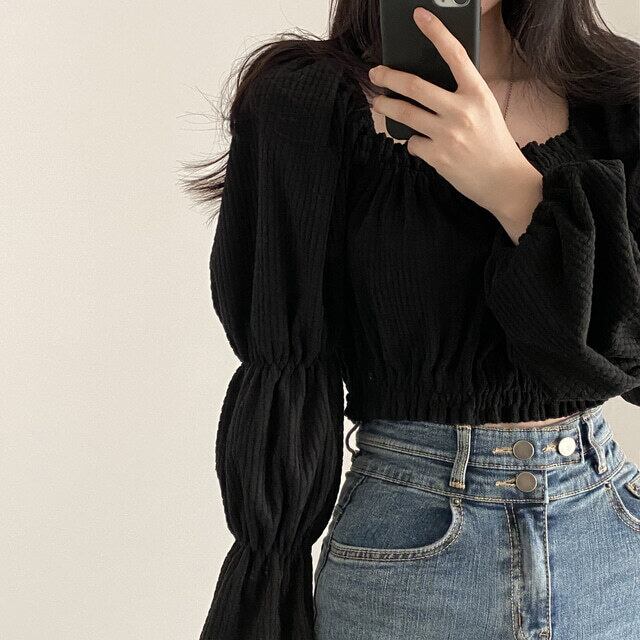 コーデュロイトップス オフショル ショート スクエアネック パフスリーブ 長袖 シンプル レトロ 韓国ファッション 2color