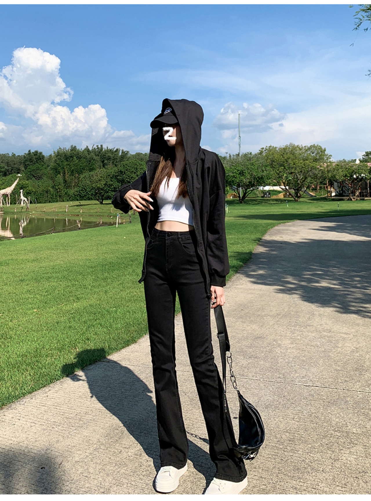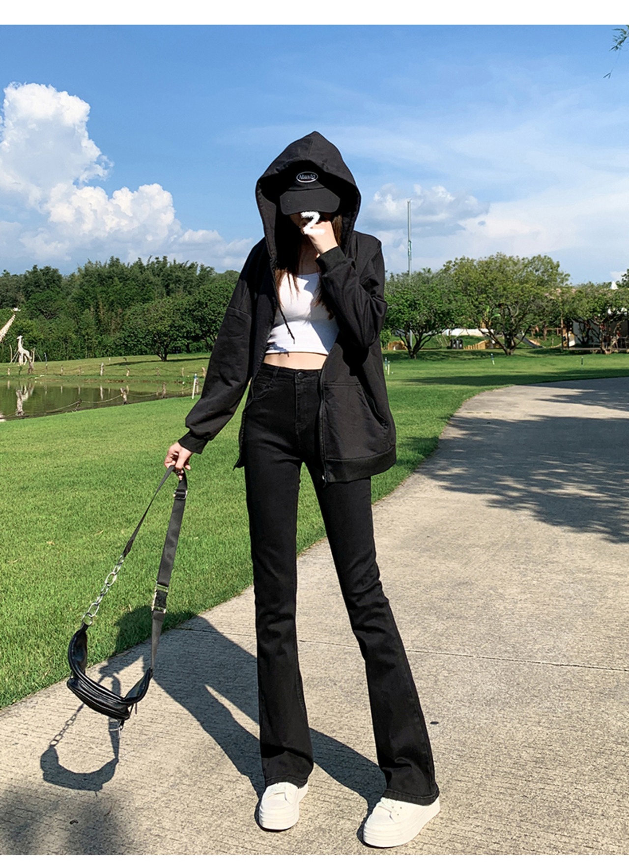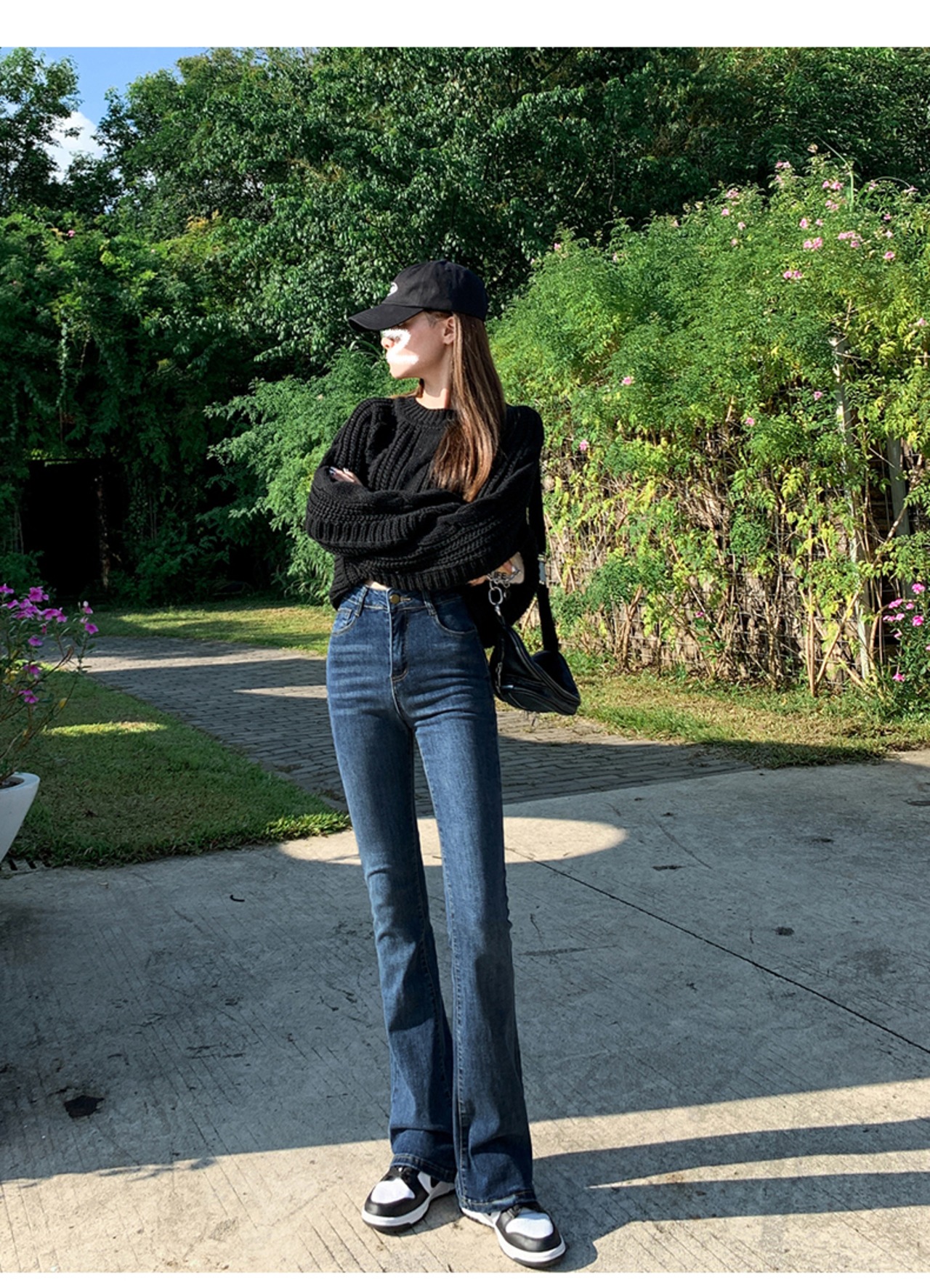 おしゃれな形のスリットマイクロフレアジーンズ。