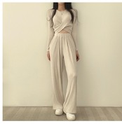 トップス&パンツ 韓国ファッション ワイドレッグ スラックス ショートニット ハイウエストパンツ
