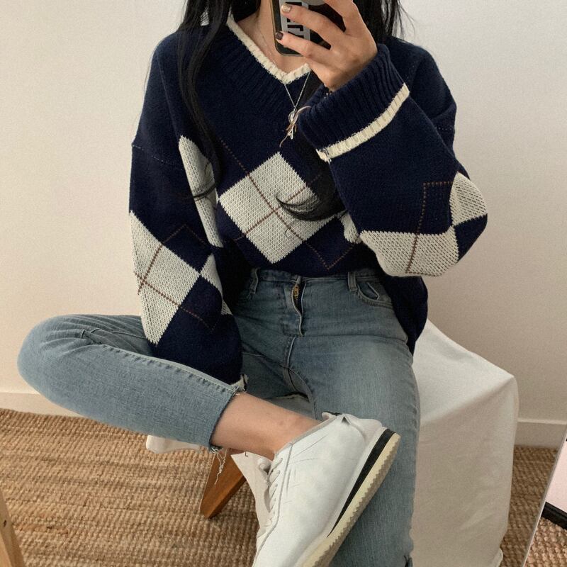 ニット セーター カジュアル トップス Vネック レディース 長袖 大人可愛い 韓国ファッション 柄 冬ニット 可愛い ダイヤモンド柄