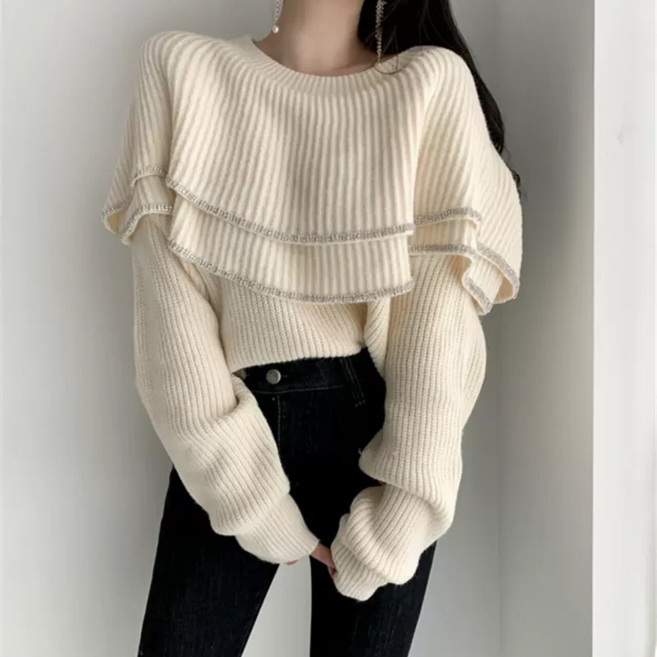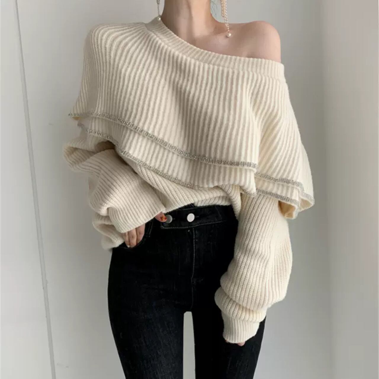 ニット レディース オフショル 肩だし ラウンドネック フリル 可愛い フェミニン オーバーサイズ ショート丈 長袖 ゆったり おしゃれ 大人っぽい