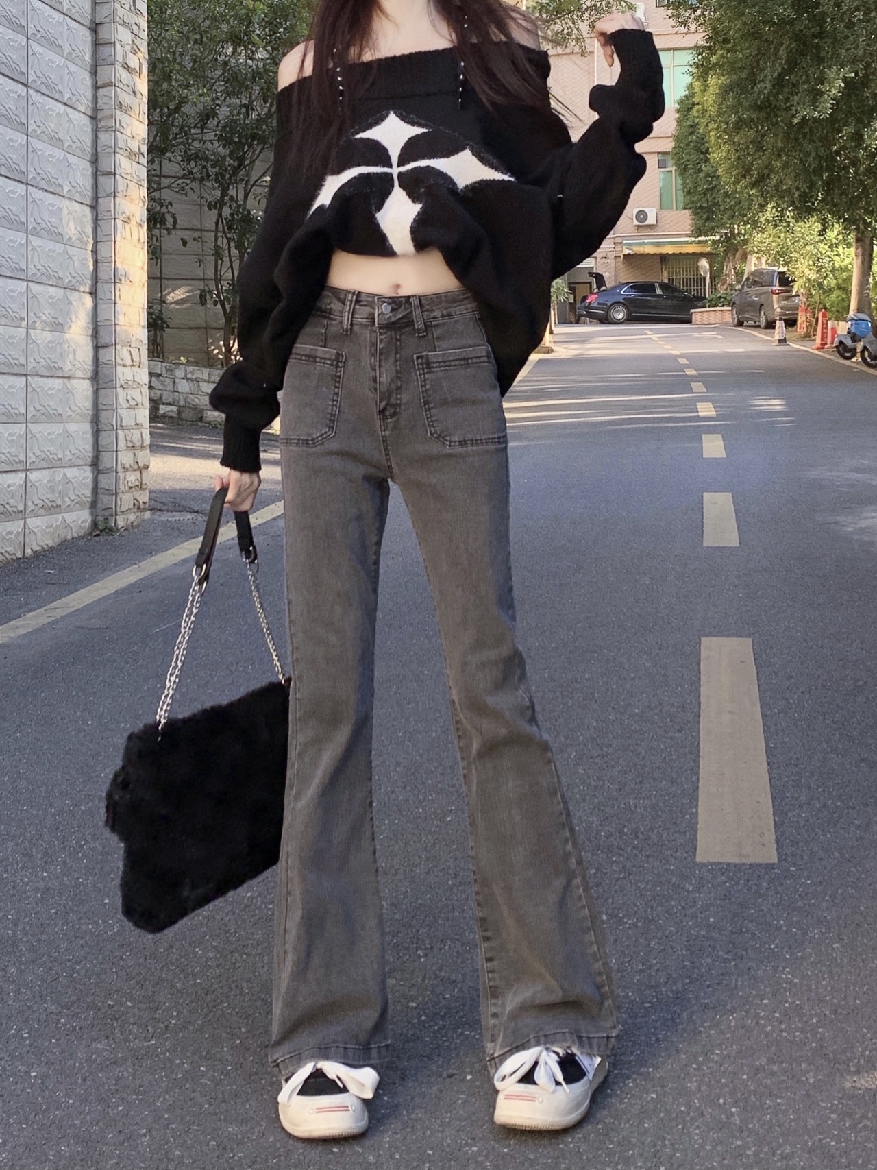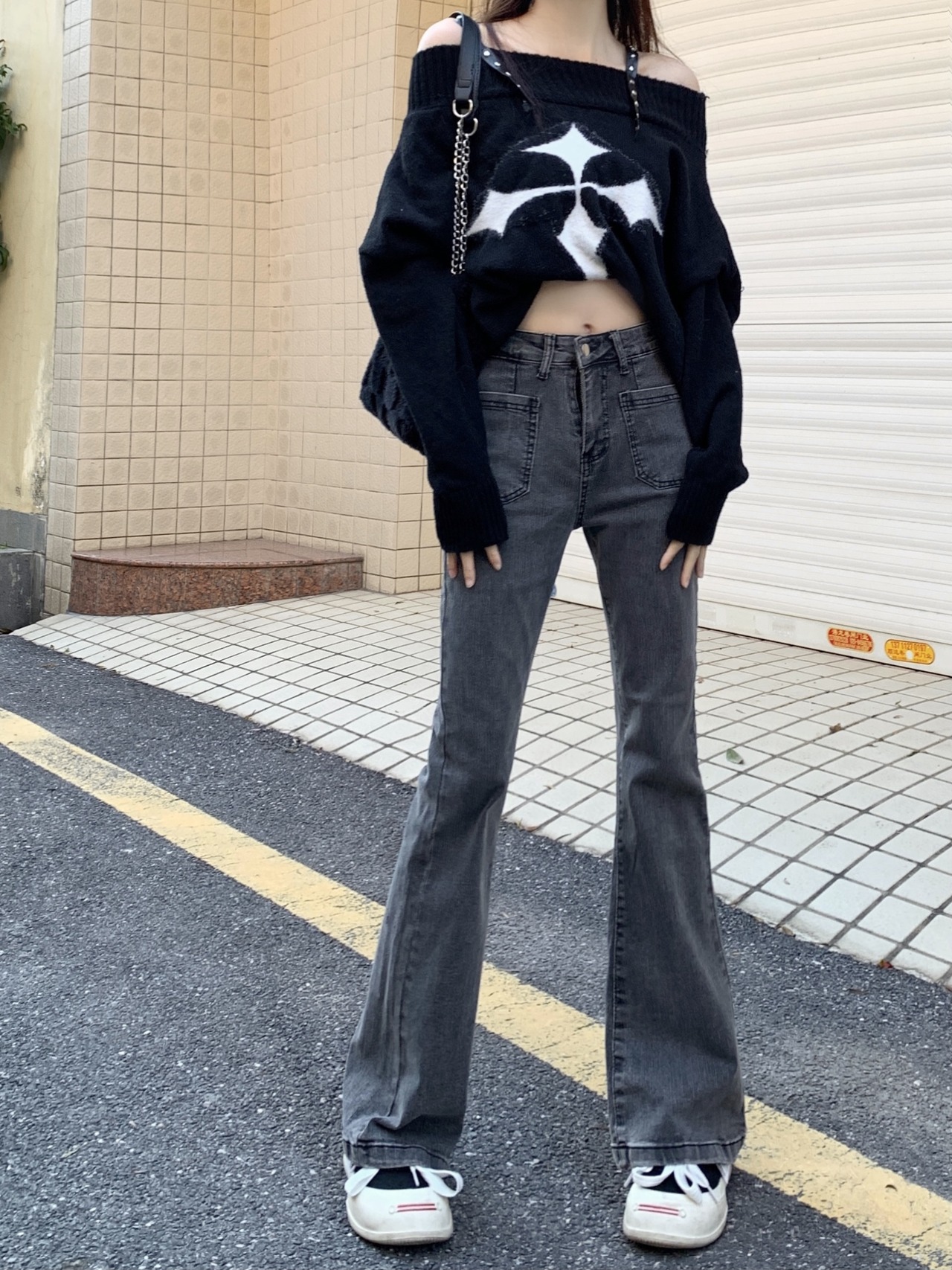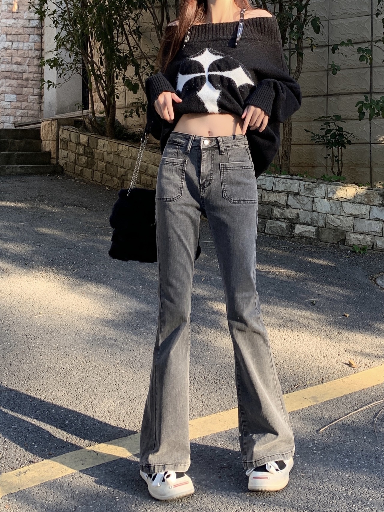 どんなトップスにも合わせやすいグレージーンズ。
