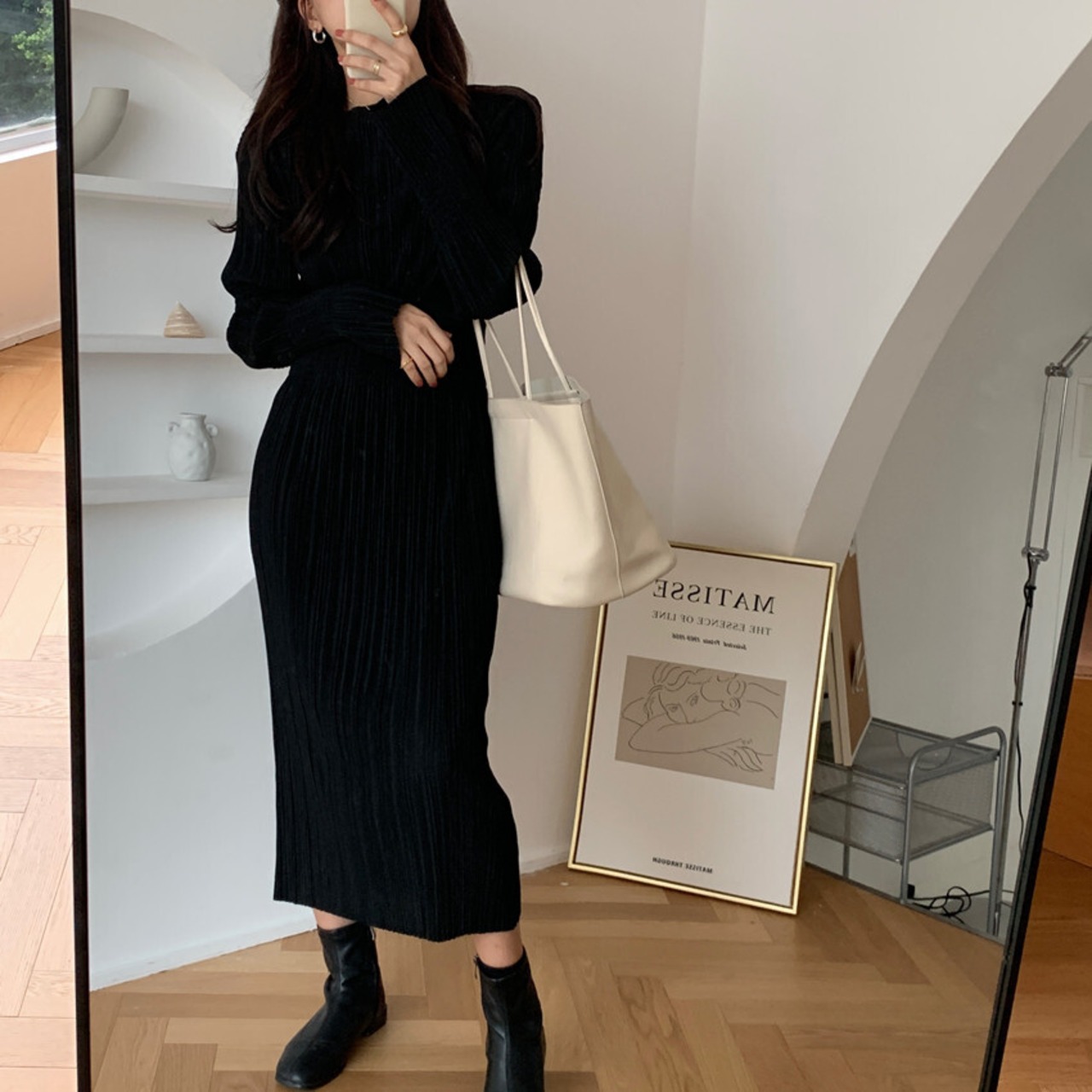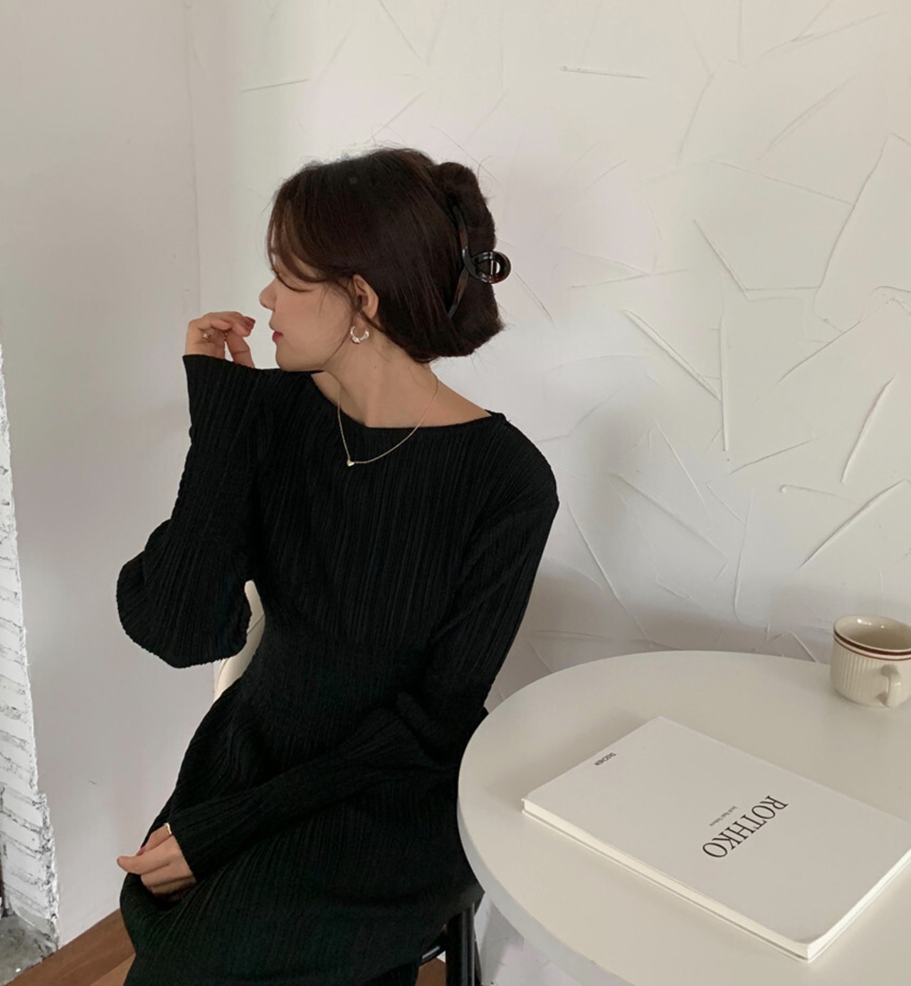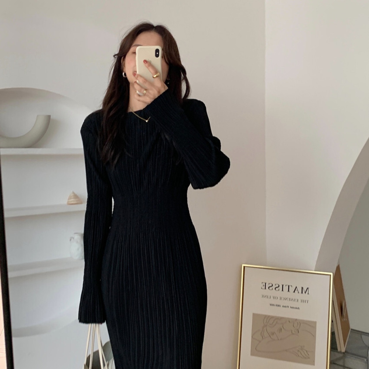 ウンド ネック 長袖 ウエスト バッグ ヒップ 長袖ドレス リトル ブラック ドレス 韓国ファッション ハイウエスト 大人