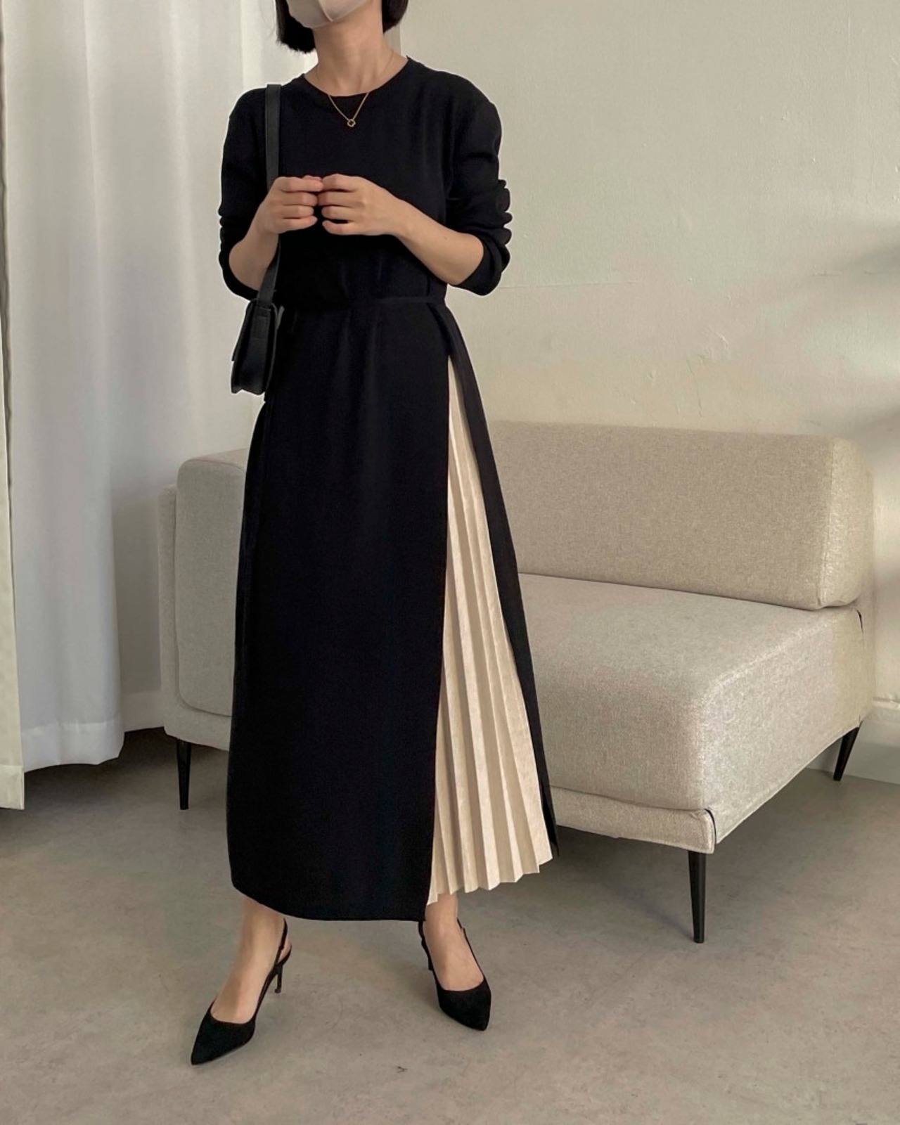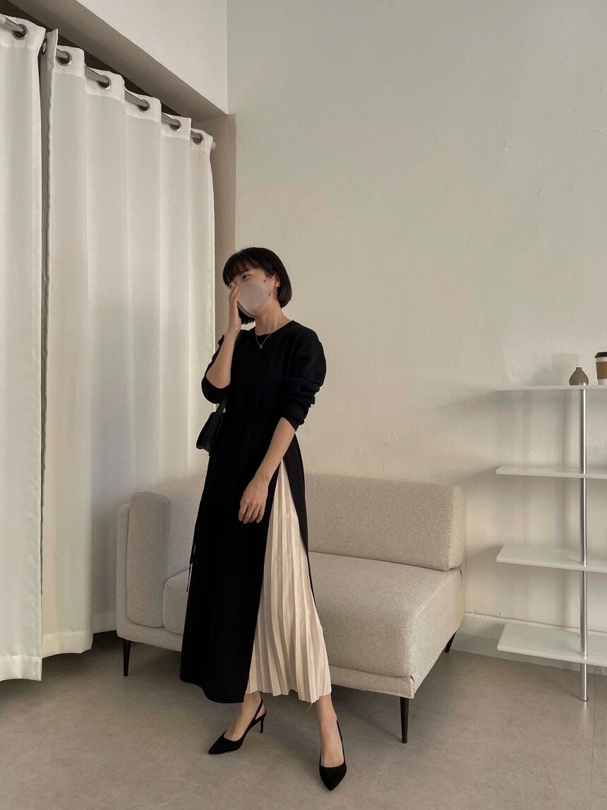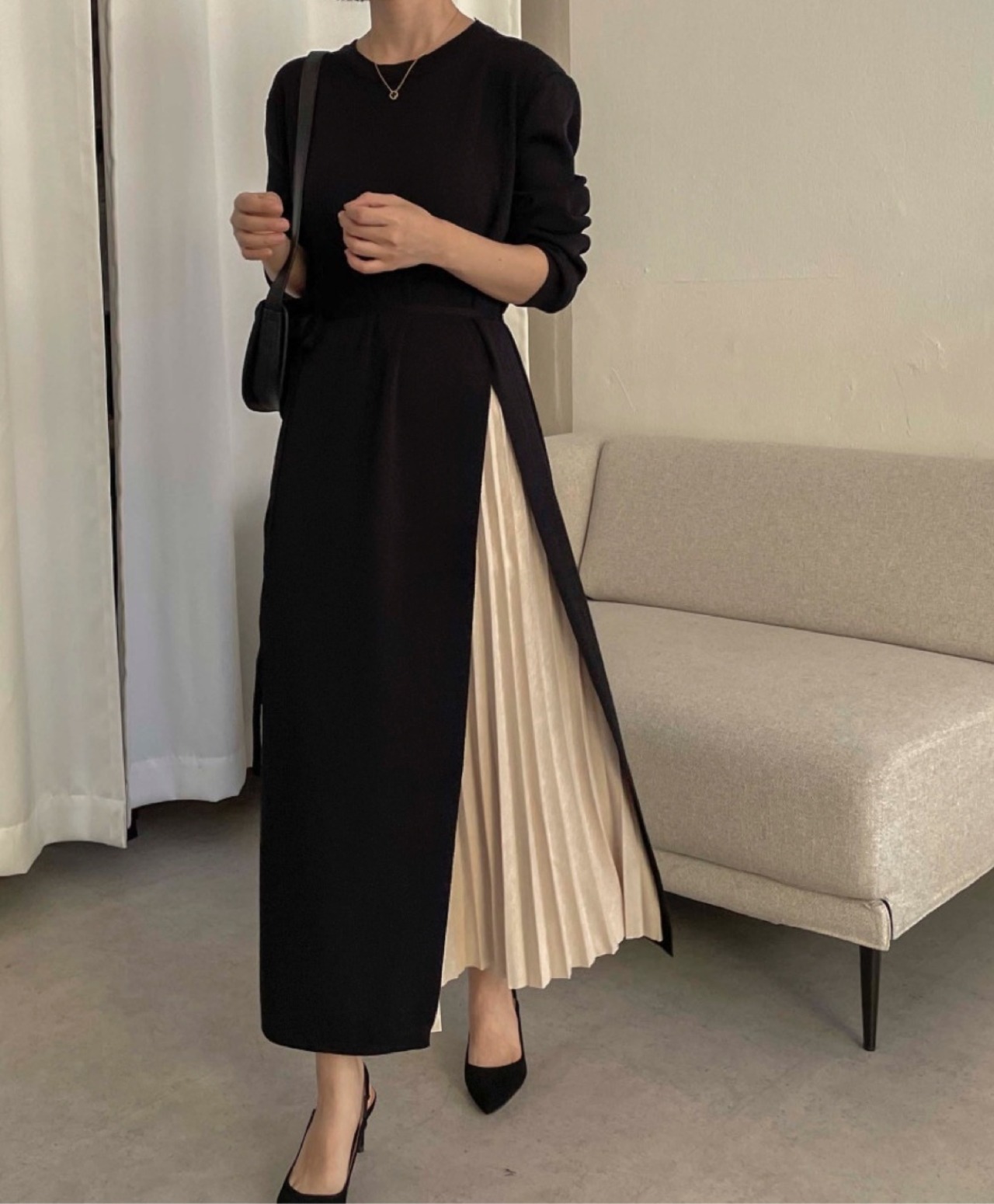 エレガント エスト ミッドレングス ドレス ステッチ プリーツ フェイク ツーピース レディース レギュラー トップス 大人可愛い 大人カジュアル 無地 シンプル 可愛い