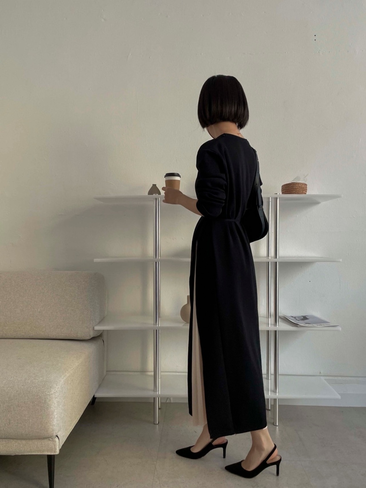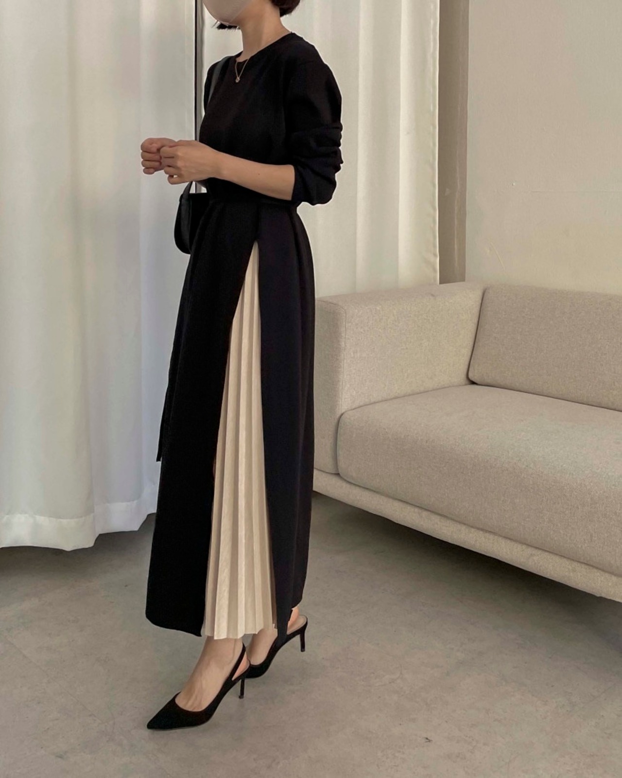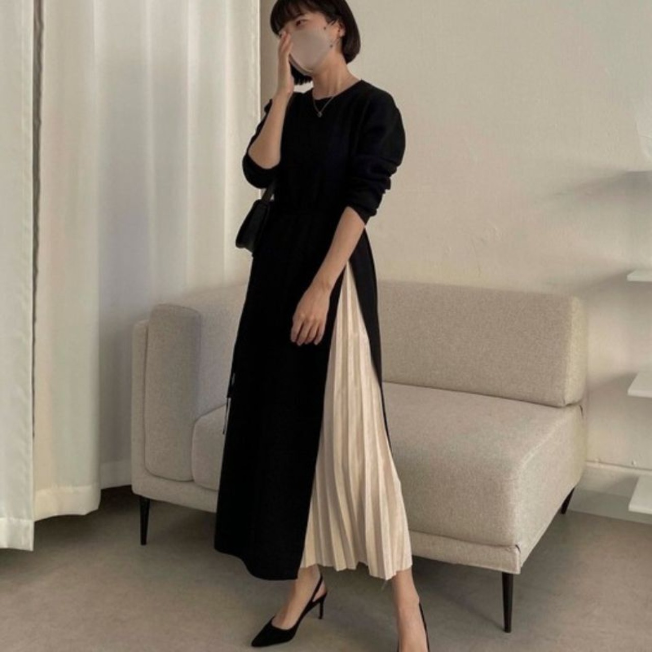 エレガント エスト ミッドレングス ドレス ステッチ プリーツ フェイク ツーピース レディース レギュラー トップス 大人可愛い 大人カジュアル 無地 シンプル 可愛い