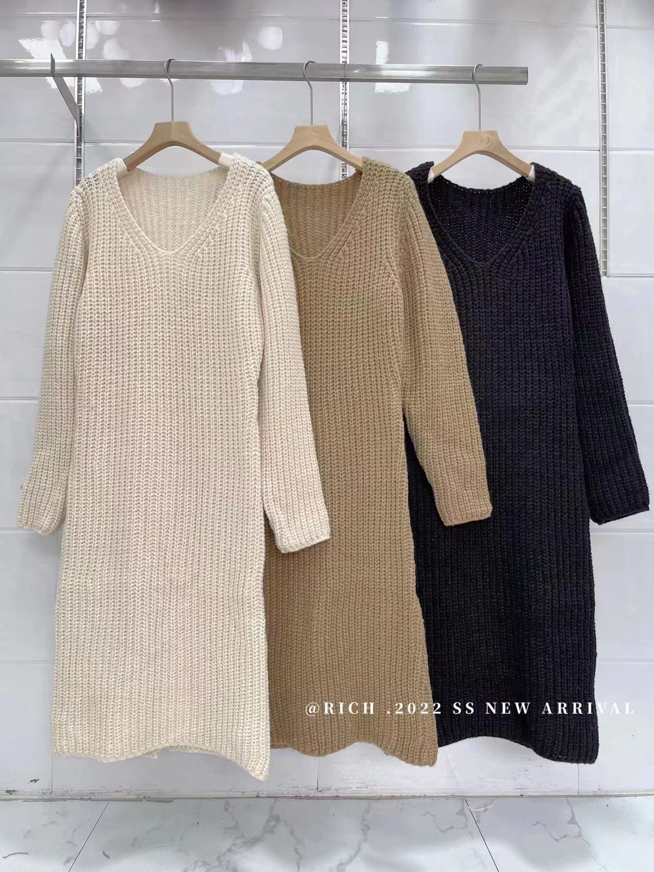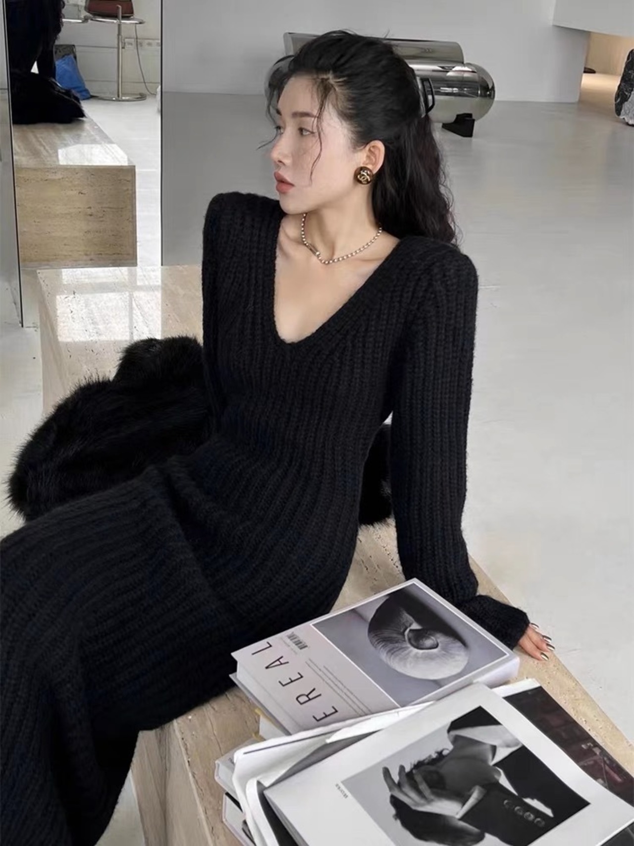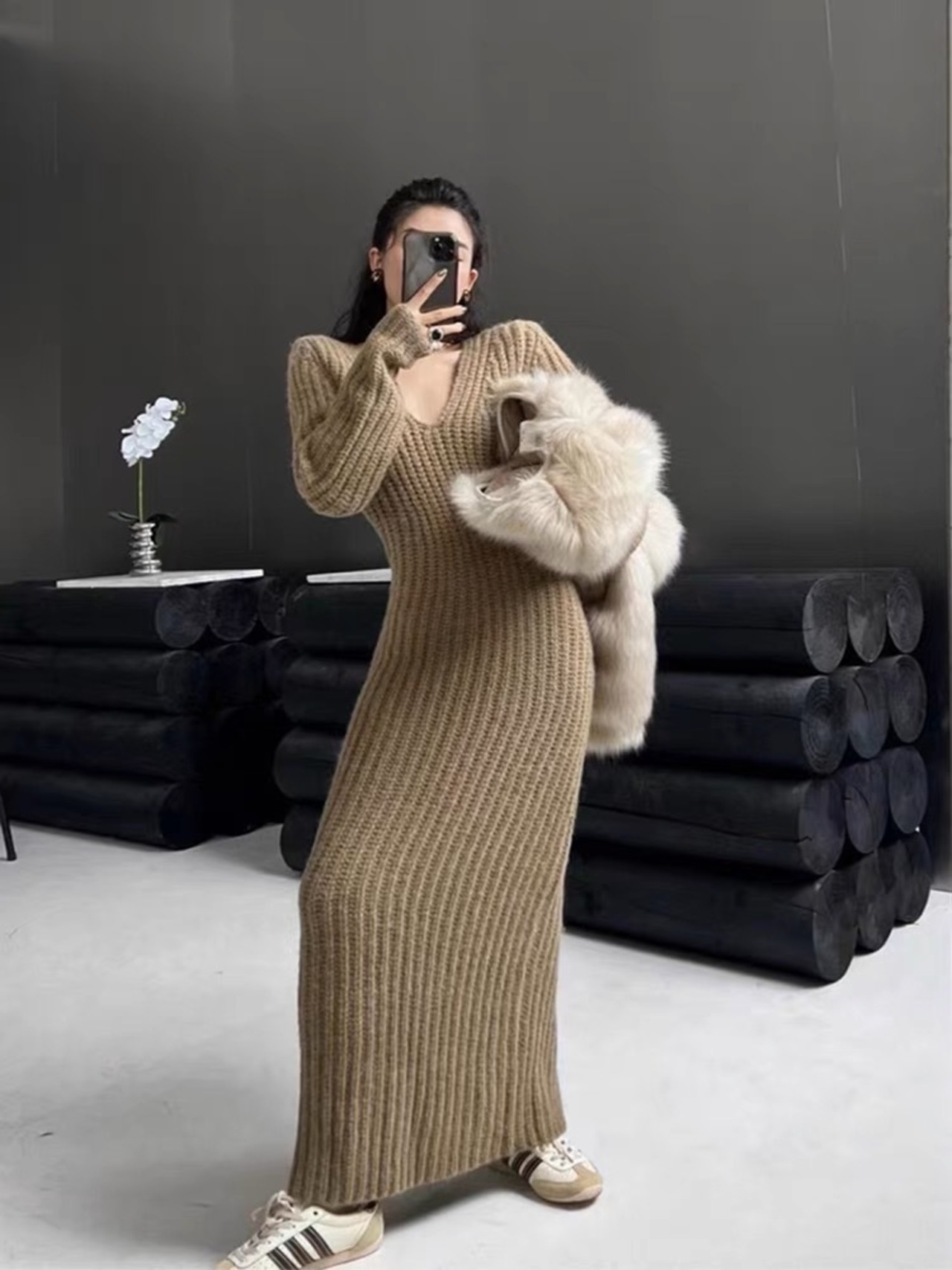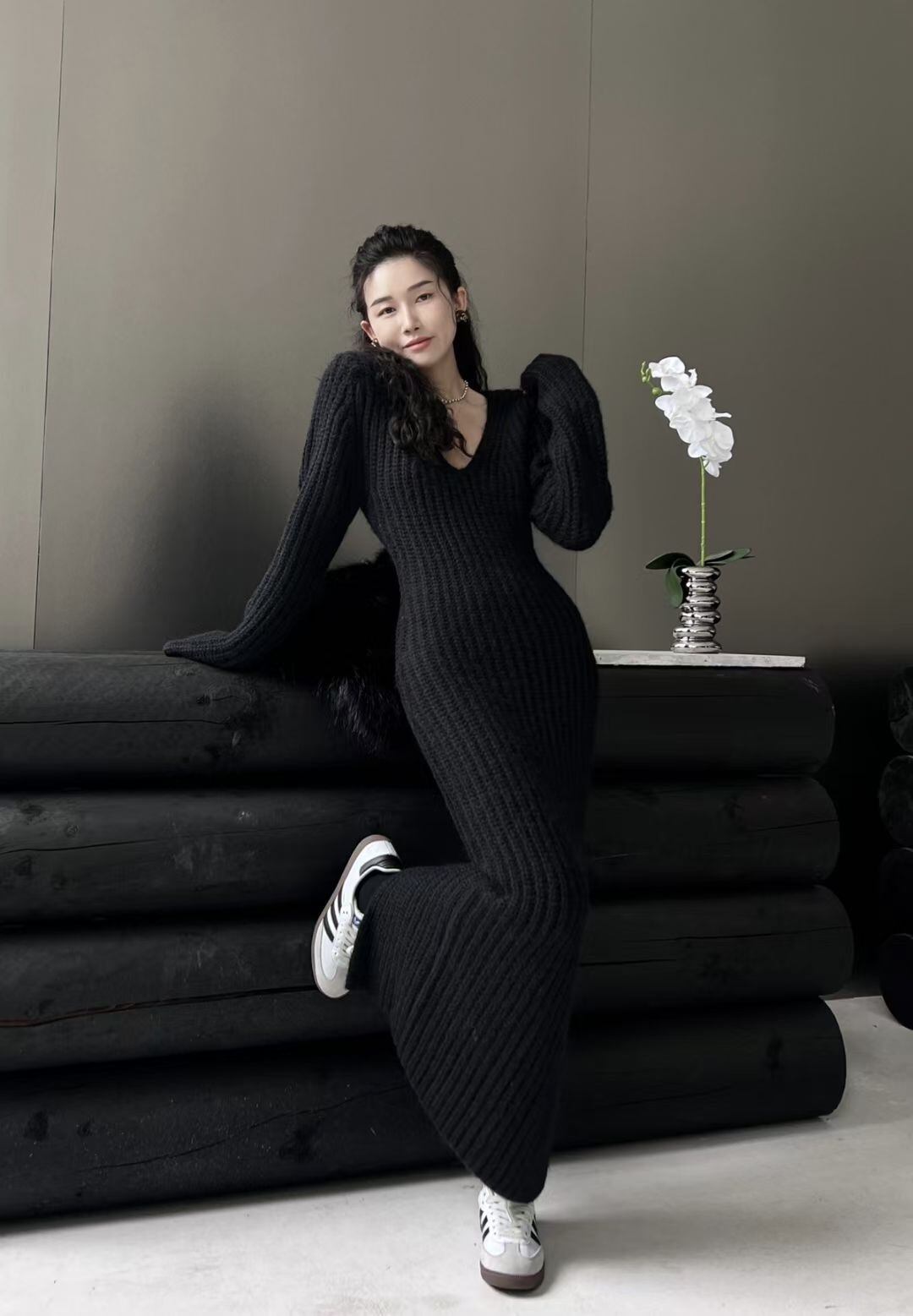 V ネック ピット ストリップ 長袖ニット バッグ ヒップ ドレス ロング スカート ワンピース レディース トップス 韓国ファッション 大人可愛い 大人カジュアル シンプル 可愛い