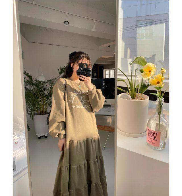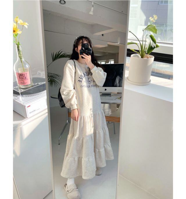 長袖セーター ドレス ラウンド ネック ワンピース 韓国ファッション レディース 可愛い シンプル 無地 ロング丈 おしゃれ
