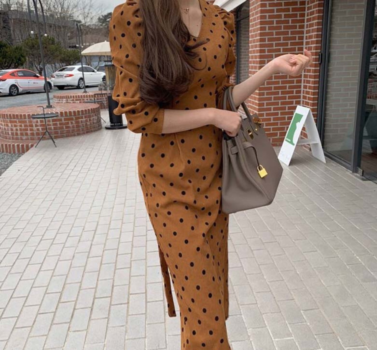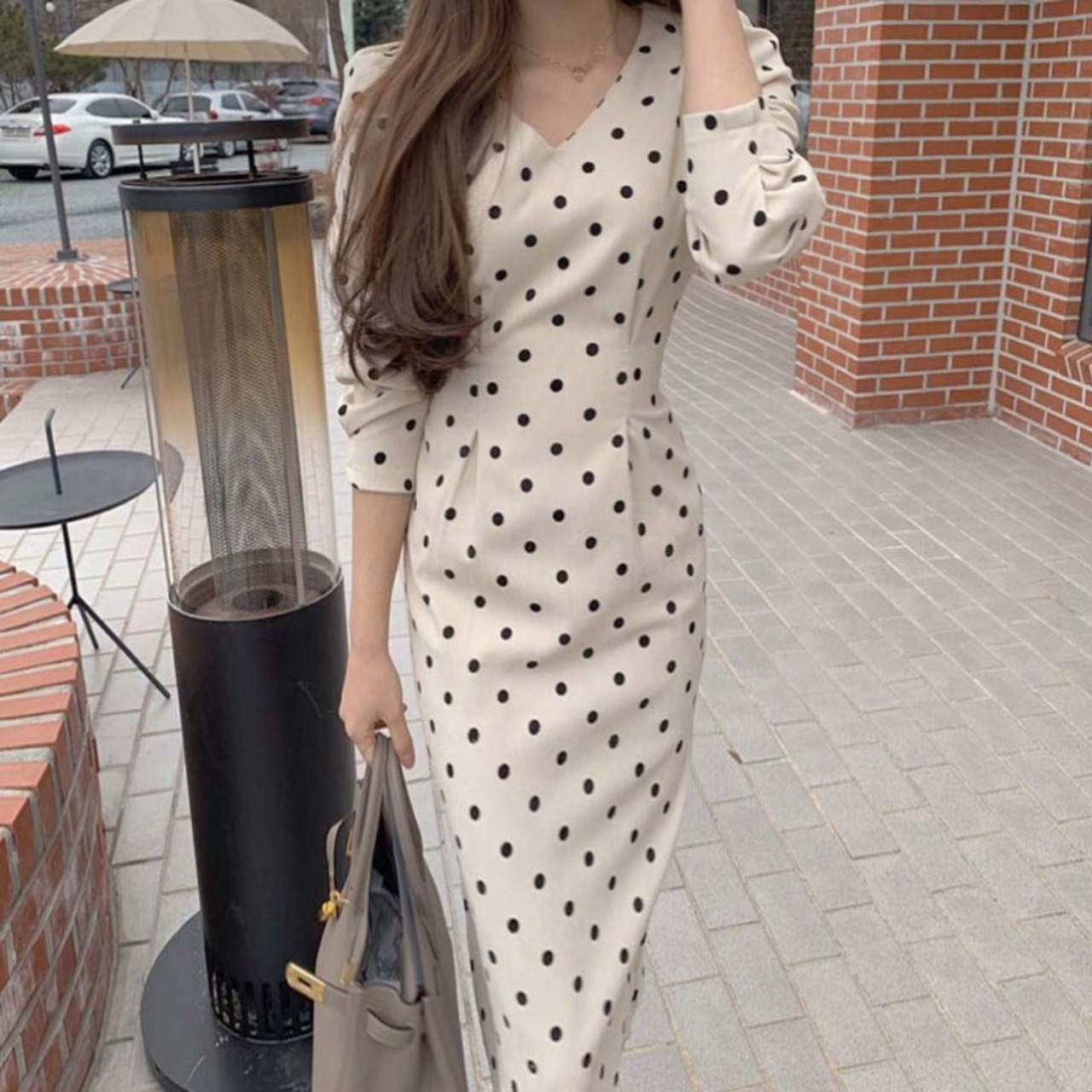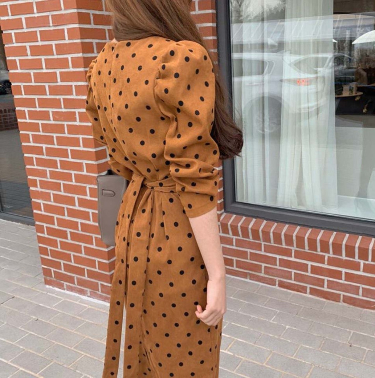 エレガント Vネック プリーツ ストラップ ウエスト 膝 ワンピース 長袖ウェーブ ポイント ドレス 韓国ファッション レディース 可愛い シンプル 無地 ロング丈 おしゃれ
