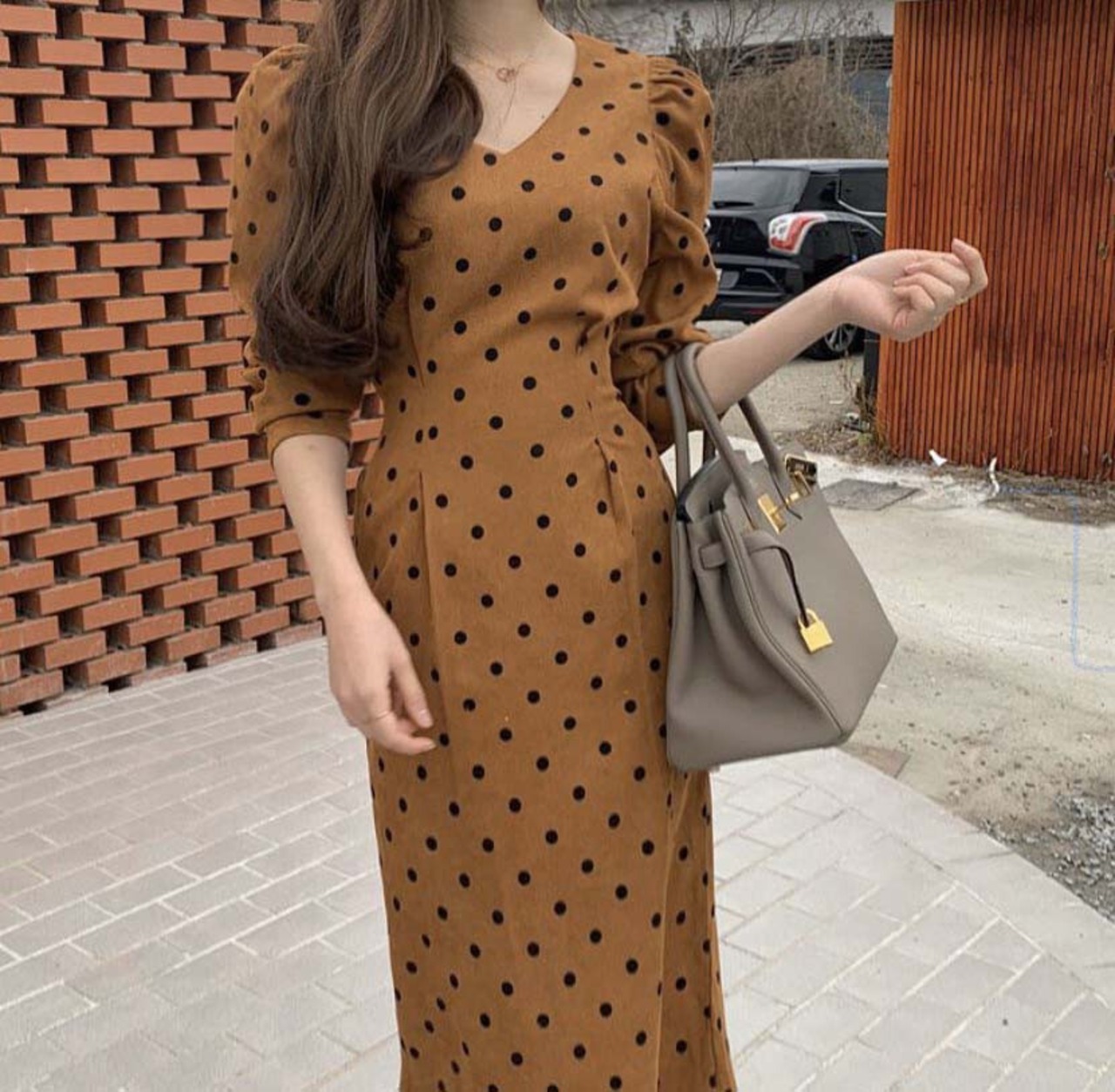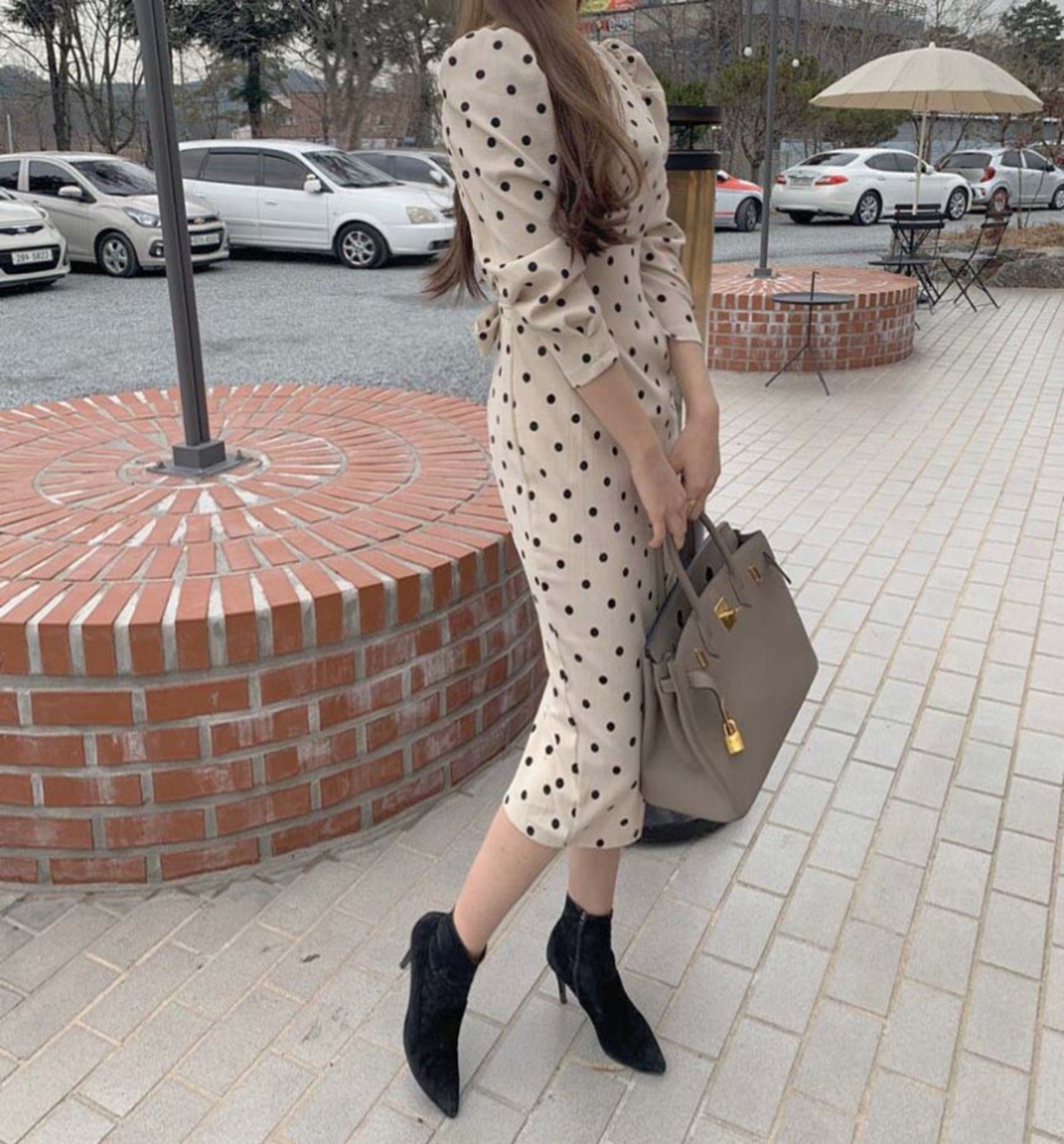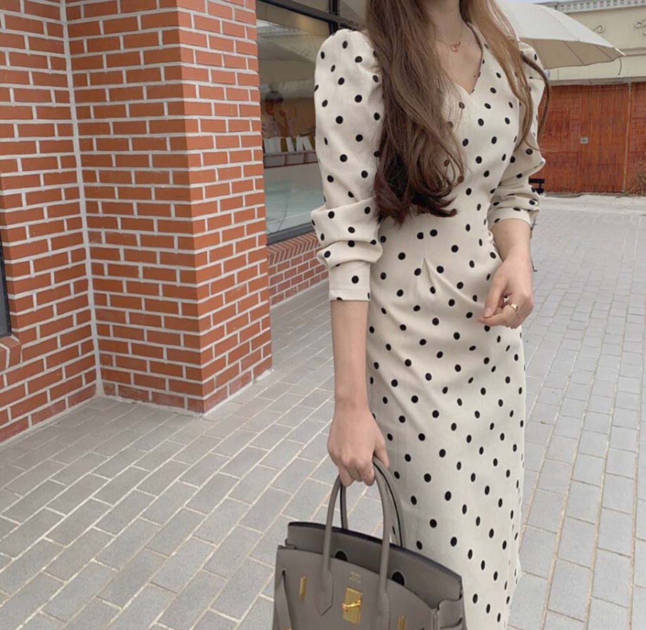 エレガント Vネック プリーツ ストラップ ウエスト 膝 ワンピース 長袖ウェーブ ポイント ドレス 韓国ファッション レディース 可愛い シンプル 無地 ロング丈 おしゃれ