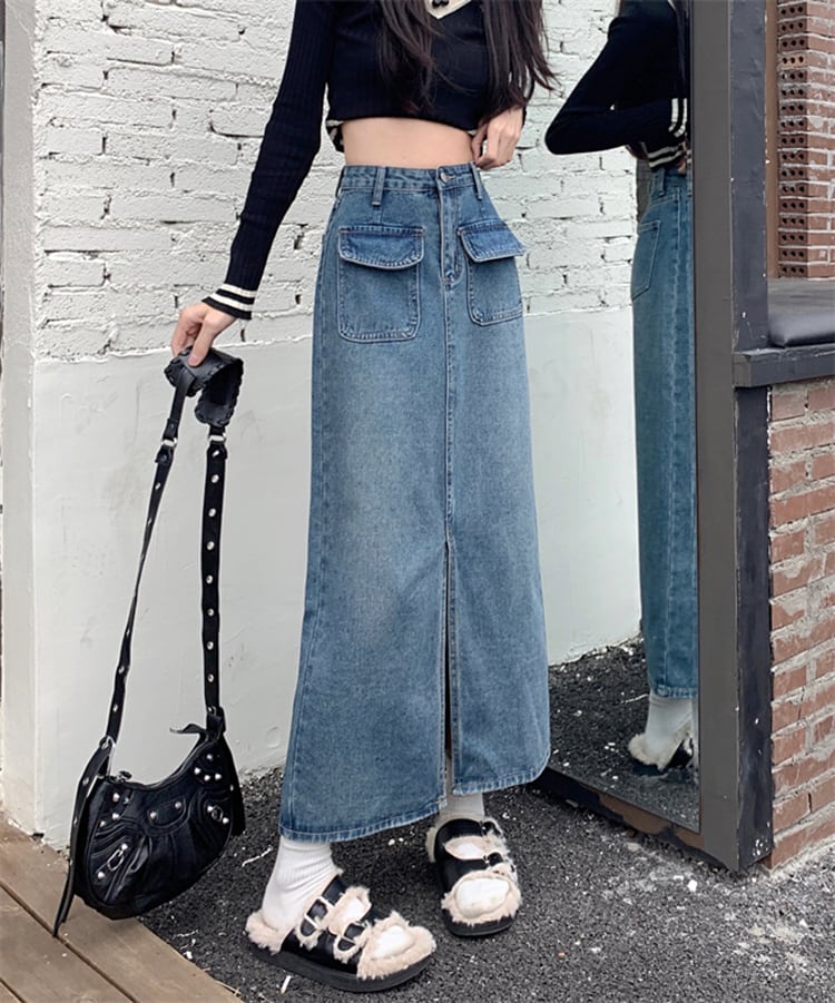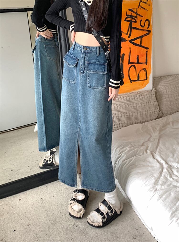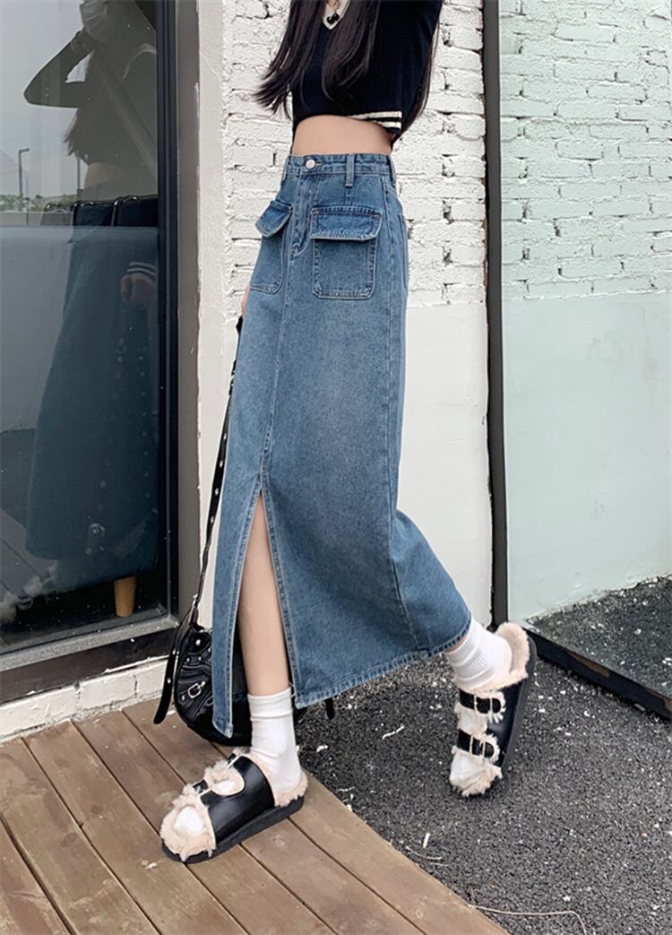 スリット デニム スカート女性 痩身スリム ミッドレングス ハイ ウエスト Aライン スカート カジュアル 大人可愛い ロングTシャツ
