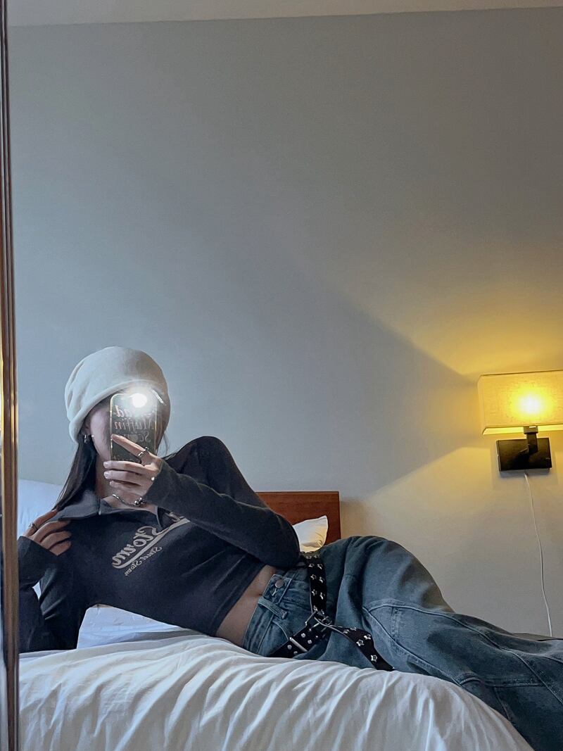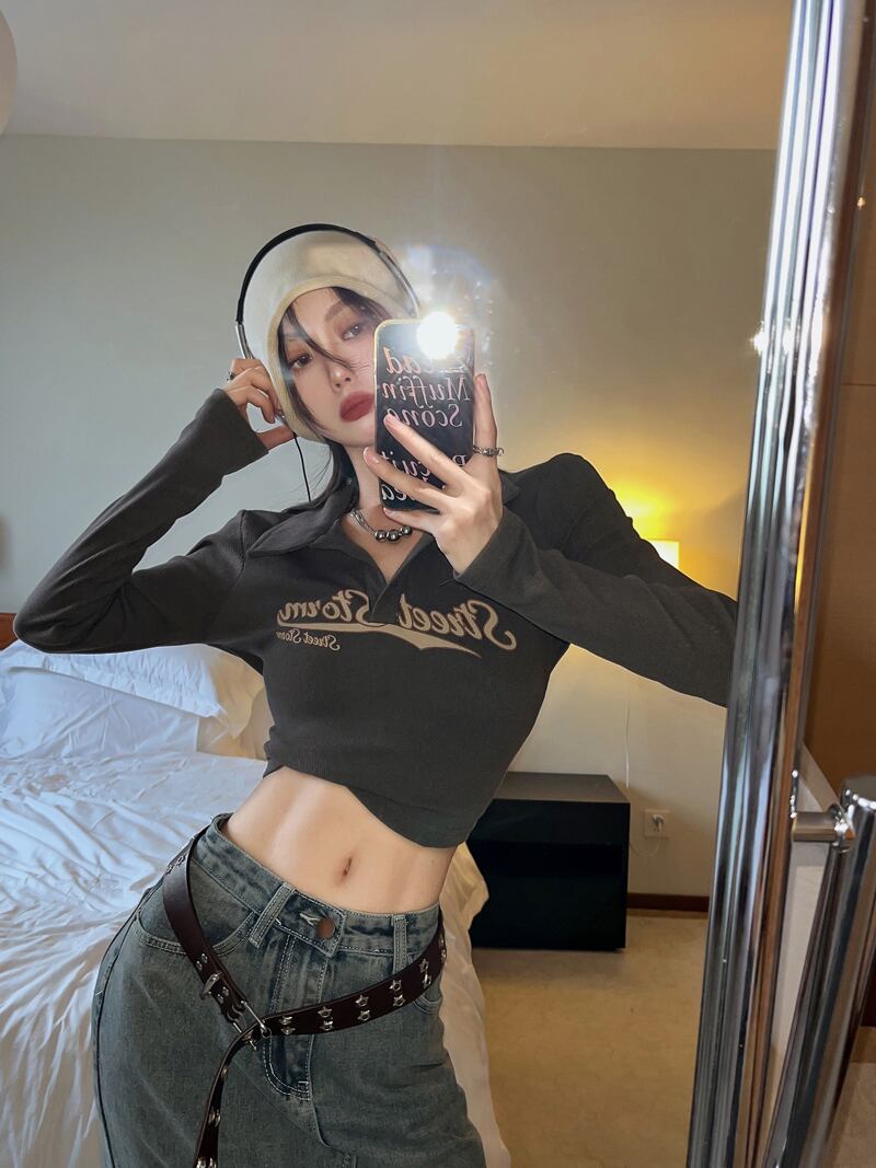 ロゴトップス 長袖 スリム フィット タイト トレンド シンプル 大人可愛い レトロ 韓国ファッション 4color S-M