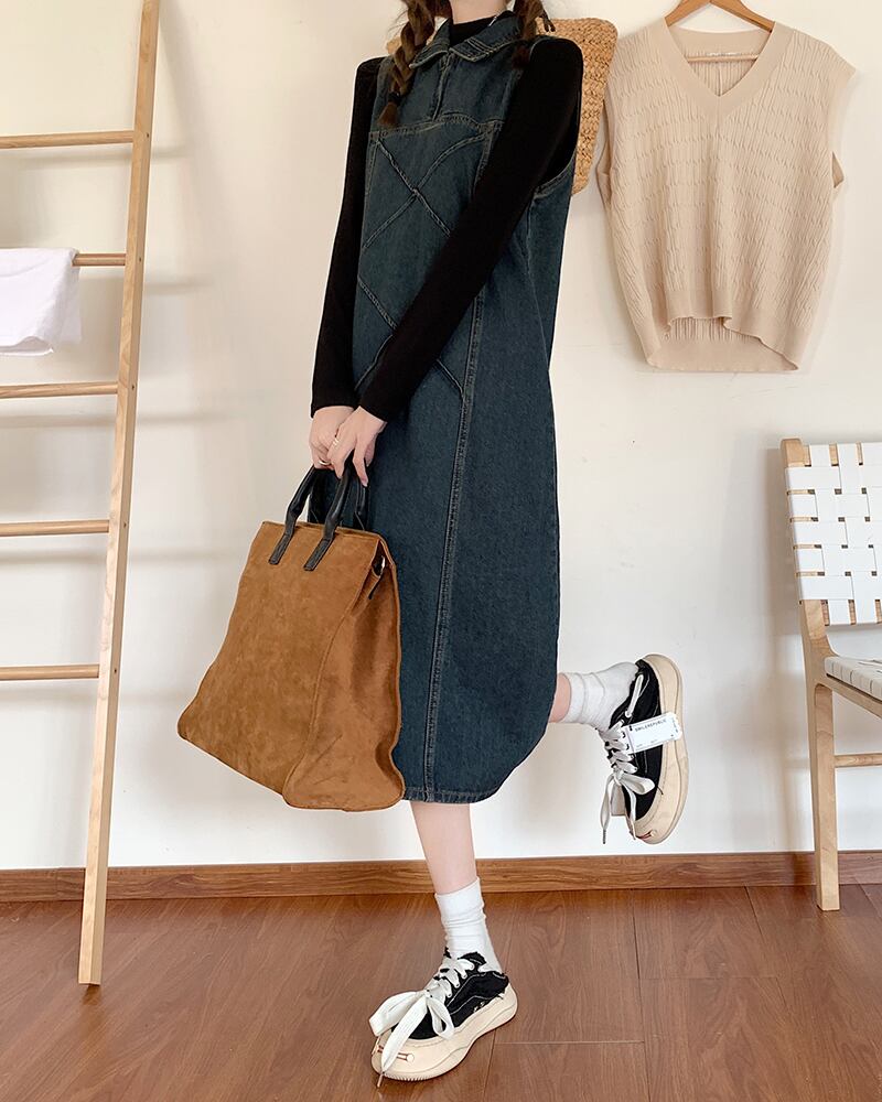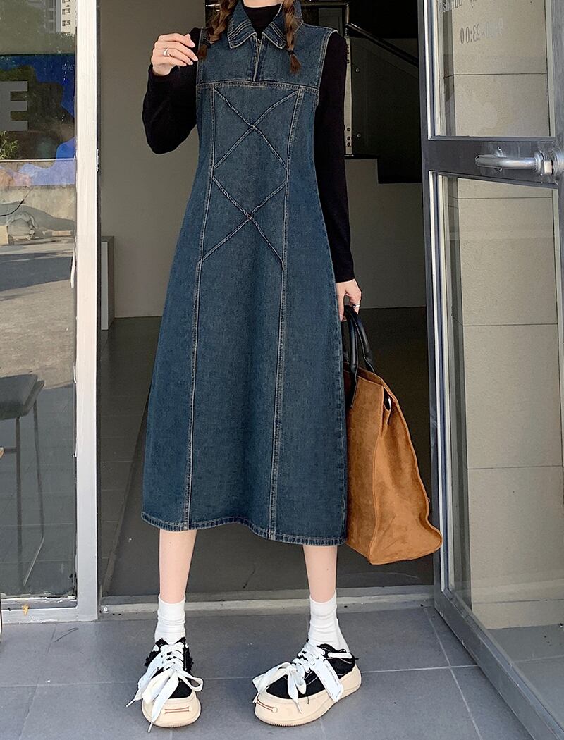 レトロ デニム ワンピ レディース シンプル ポロ襟 ミドル丈 スリム デザイン ノースリーブスカート 無地 襟無 冬ファッション おとなっぽい