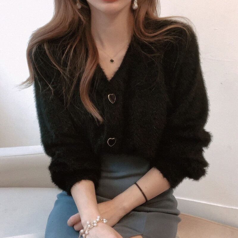 ハートボタンカーデ カーディガン Vネック ニット 着回し 大人可愛い シンプル レトロ 韓国ファッション 2color