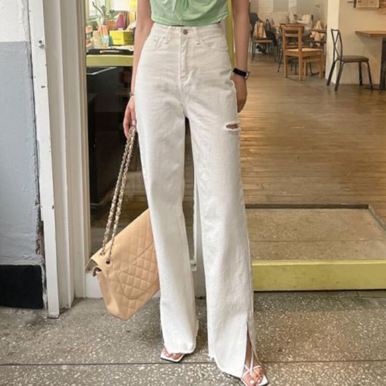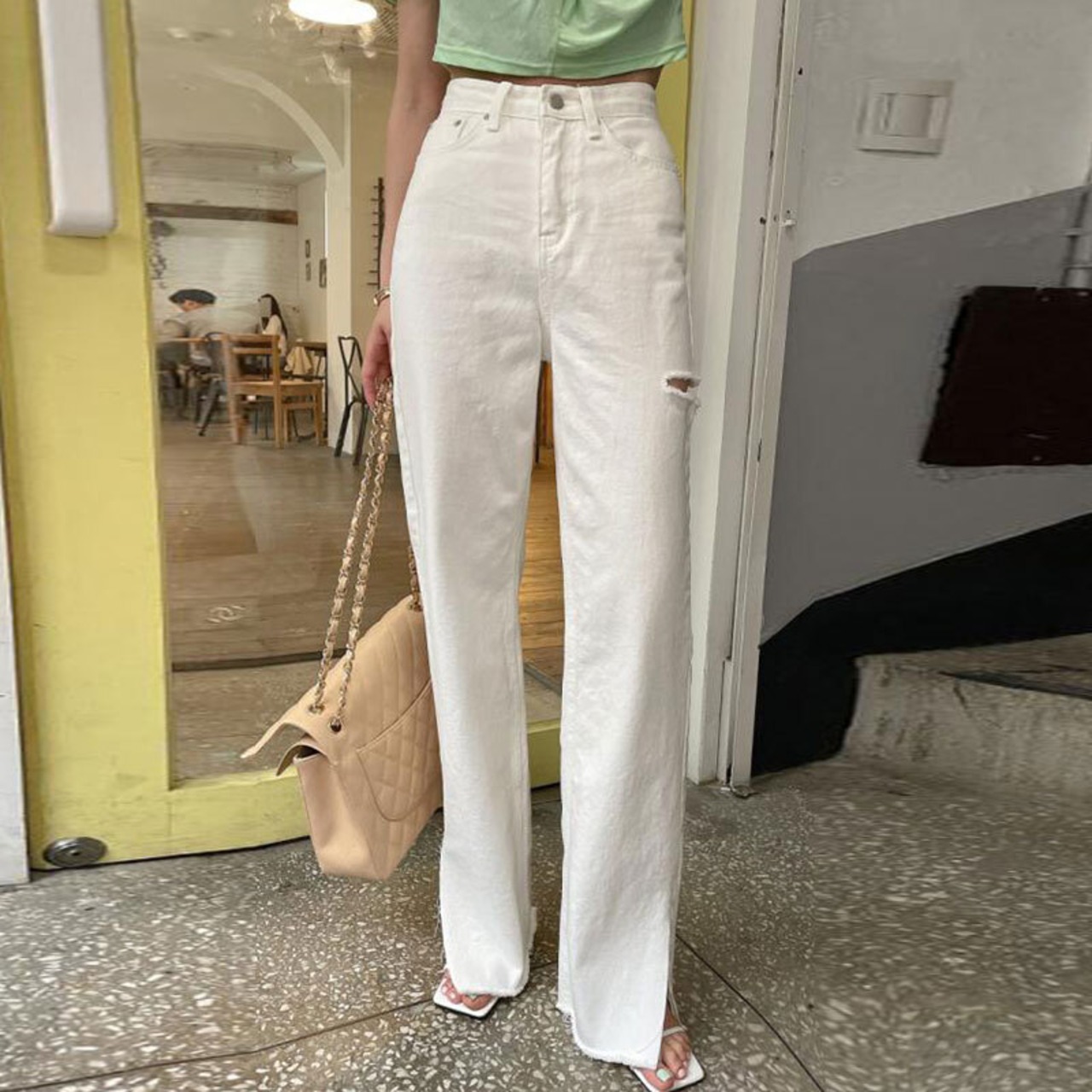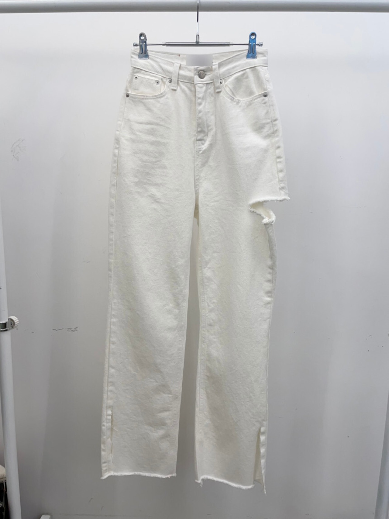 ダメージデニム ボトム スリットデニム カラーデニム ダメージ ワントーン シンプル カジュアル 着回し 韓国ファッション S-L