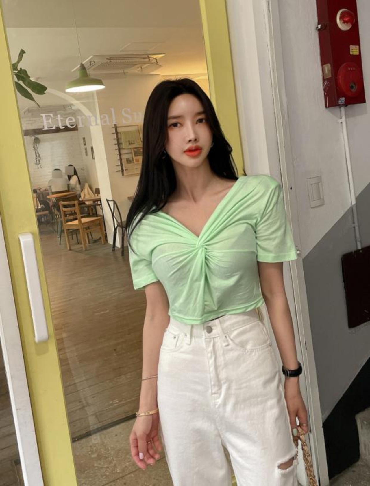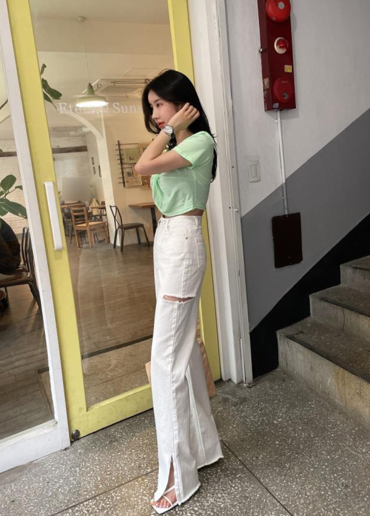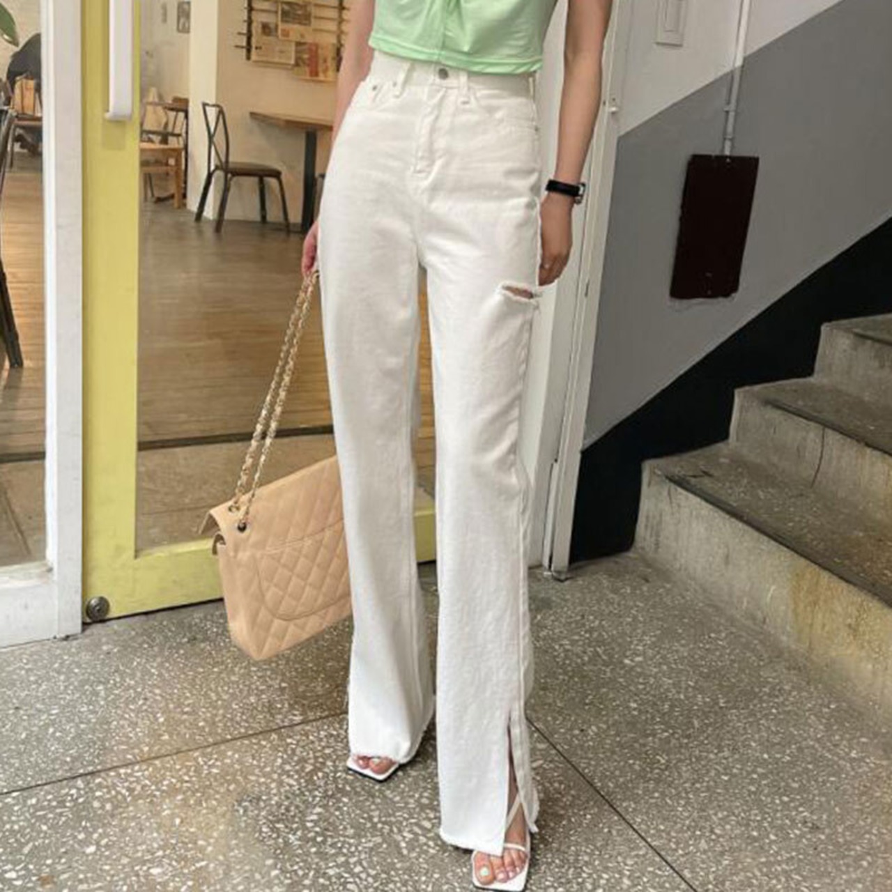 ダメージデニム ボトム スリットデニム カラーデニム ダメージ ワントーン シンプル カジュアル 着回し 韓国ファッション S-L