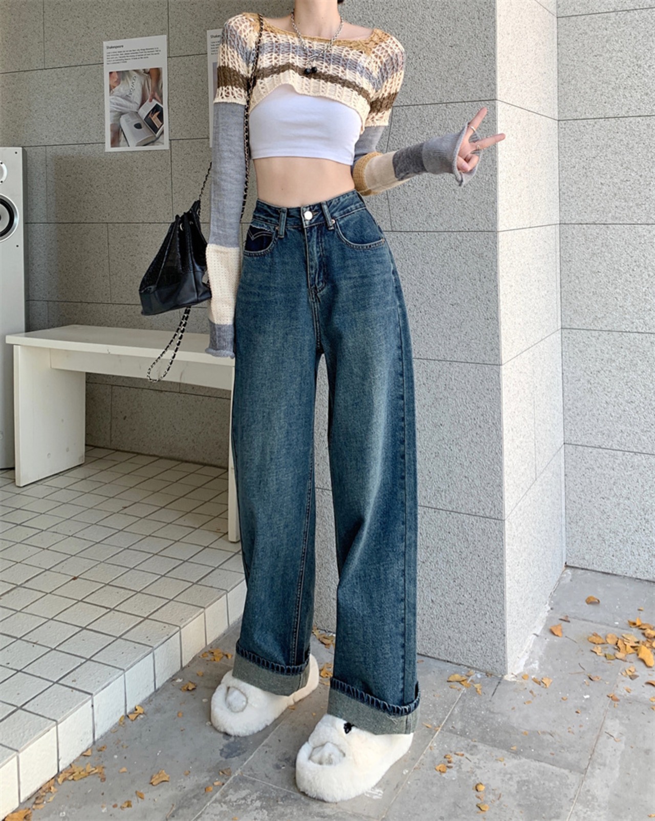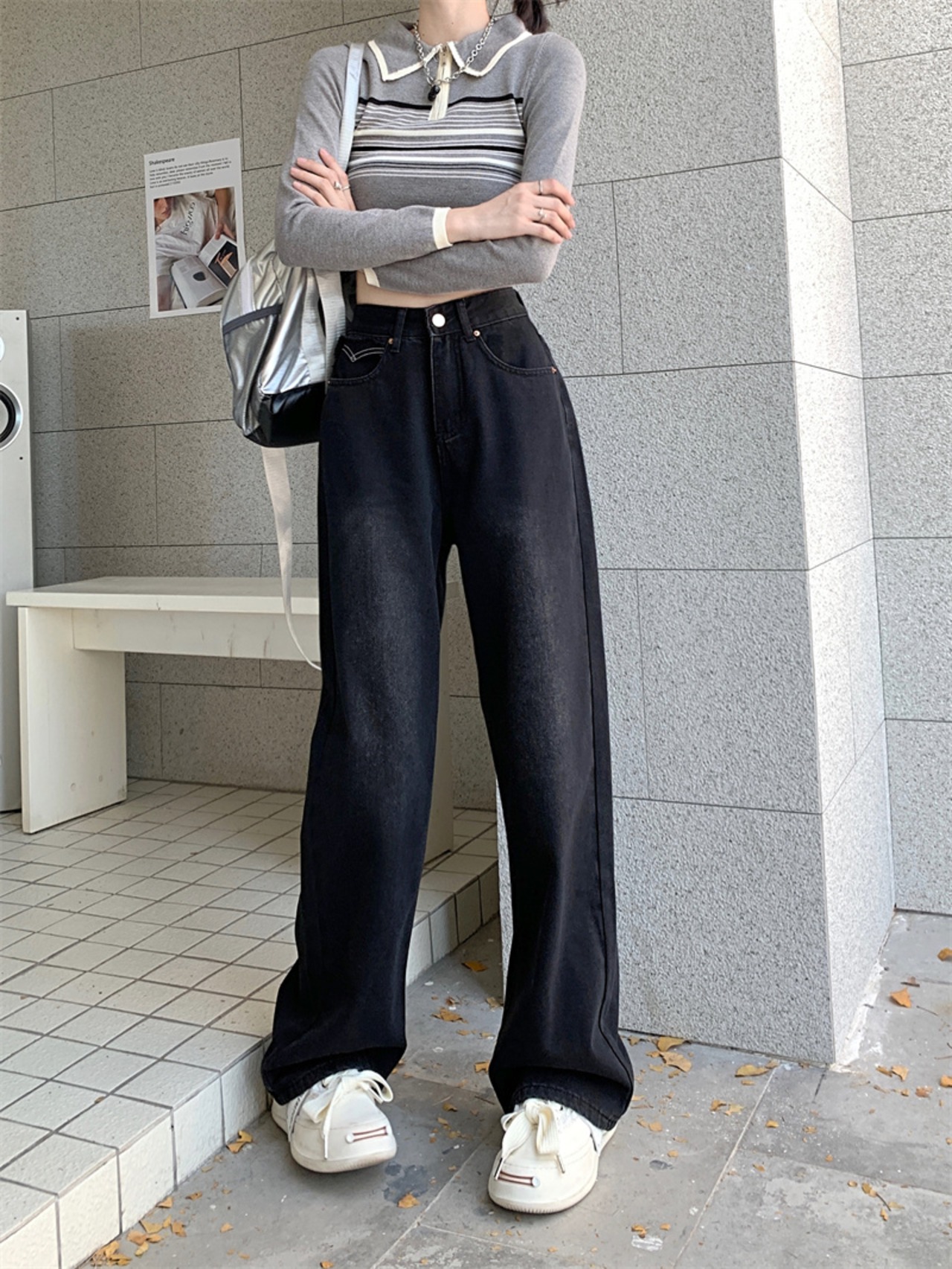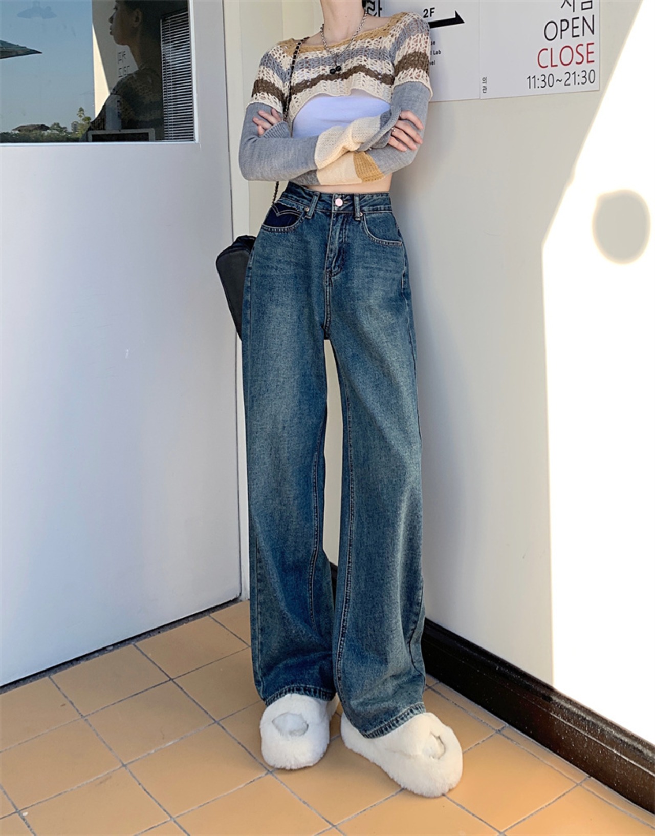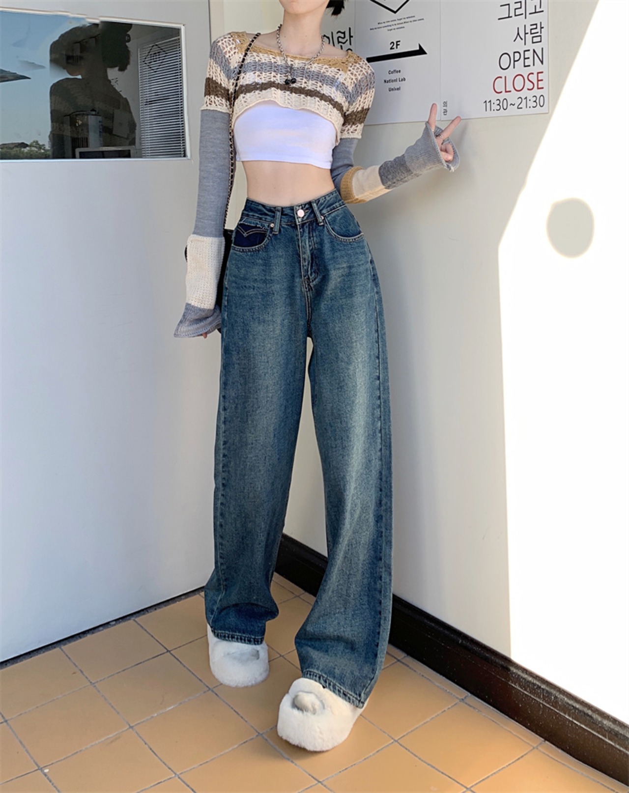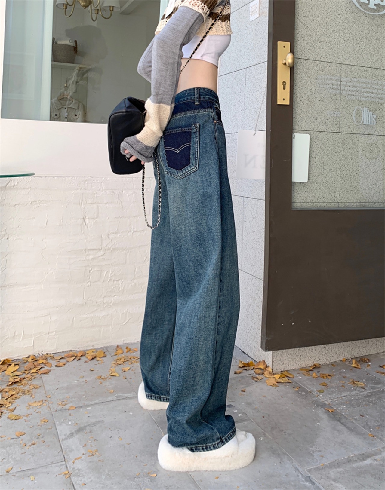 ハイウエスト ワイドレッグ ジーンズ 韓国ファッション スタイル ポケット コントラスト カラー レトロ ルーズ ストレート ズボン シンプル ハイウエスト ファッション