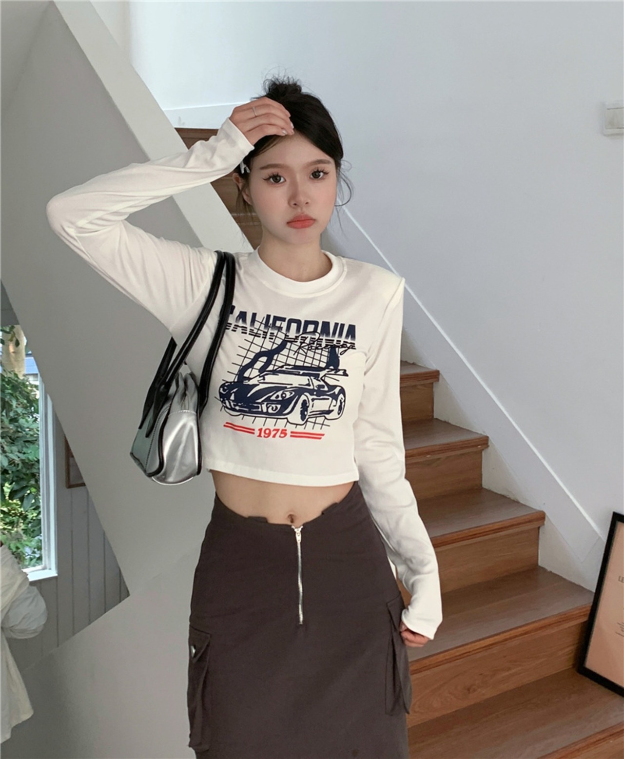 アメリカンプリント トップス ショート タイト カジュアル 大人可愛い 韓国ファッション 3color S-L