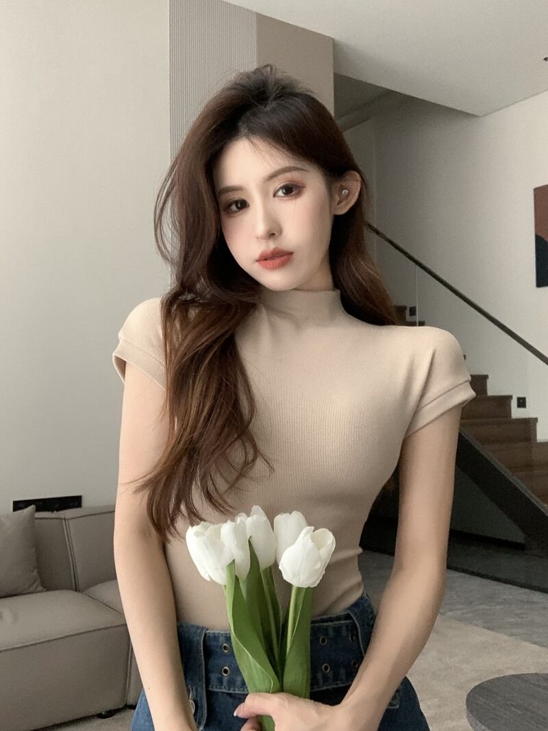 ハーフハイカラー ショート Tシャツ レディース 可愛い トップ サマーニューフレンチボトムシャツブラック半袖タイトフィット 大人可愛い 無地 ひらひら 大人っぽい 夏ファッション
