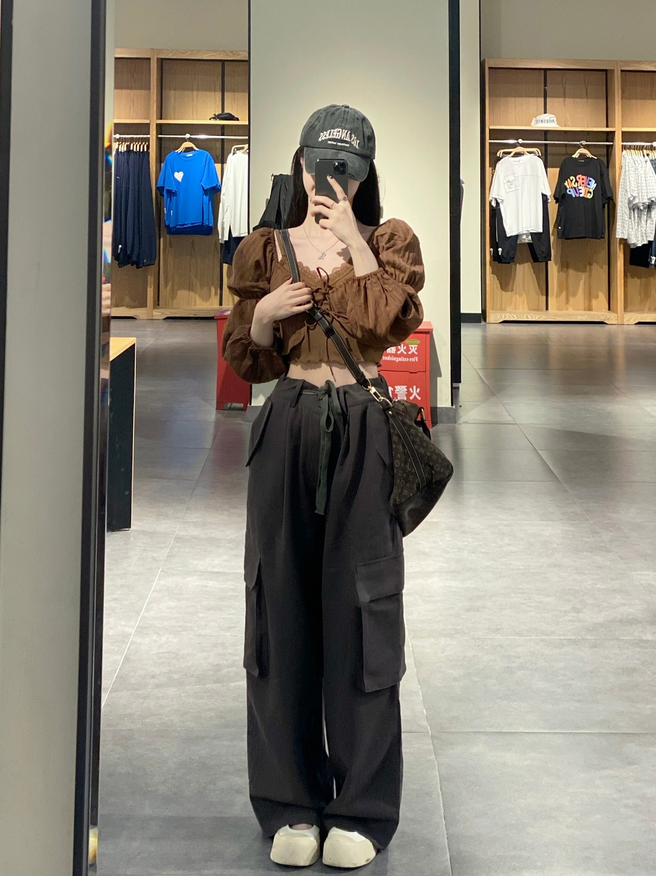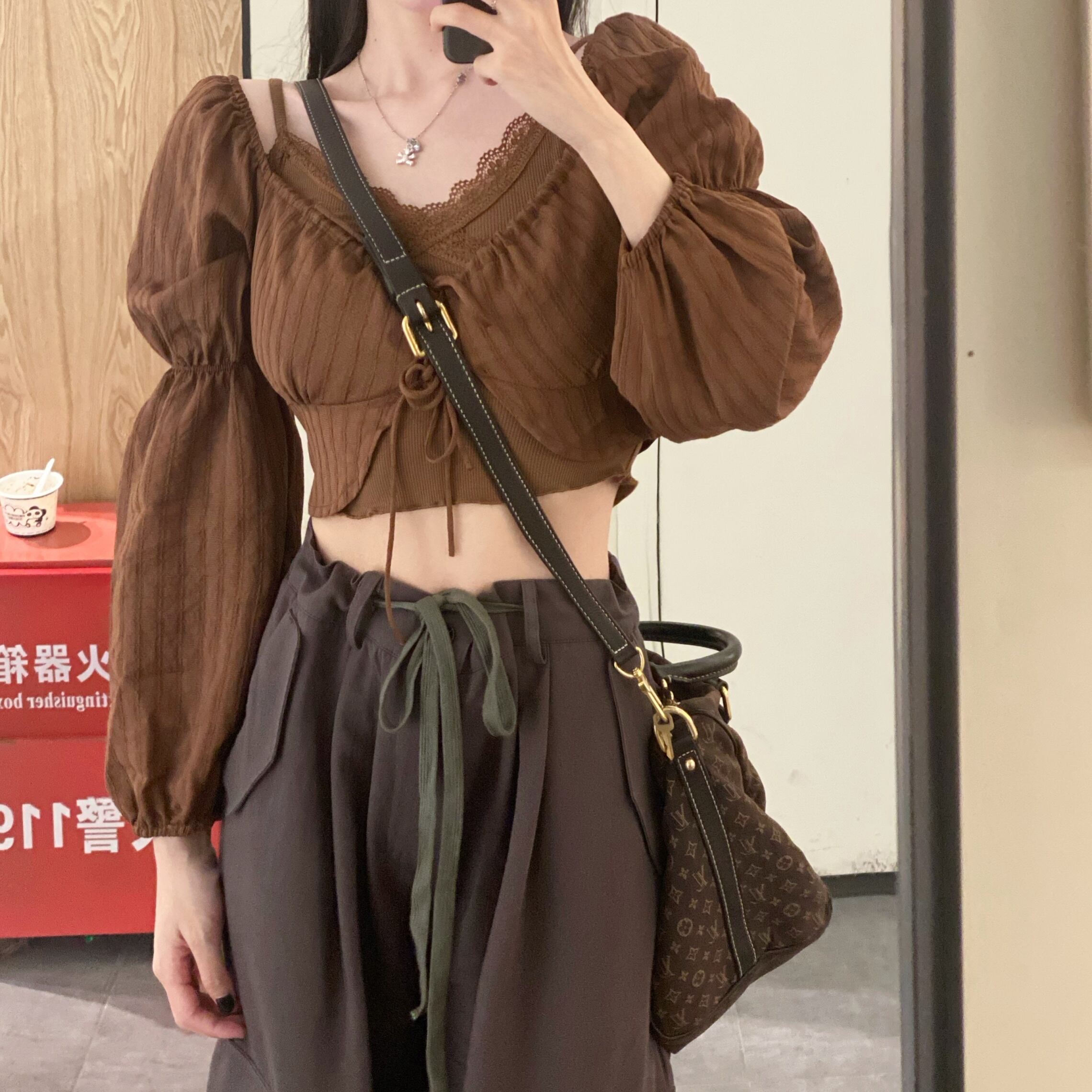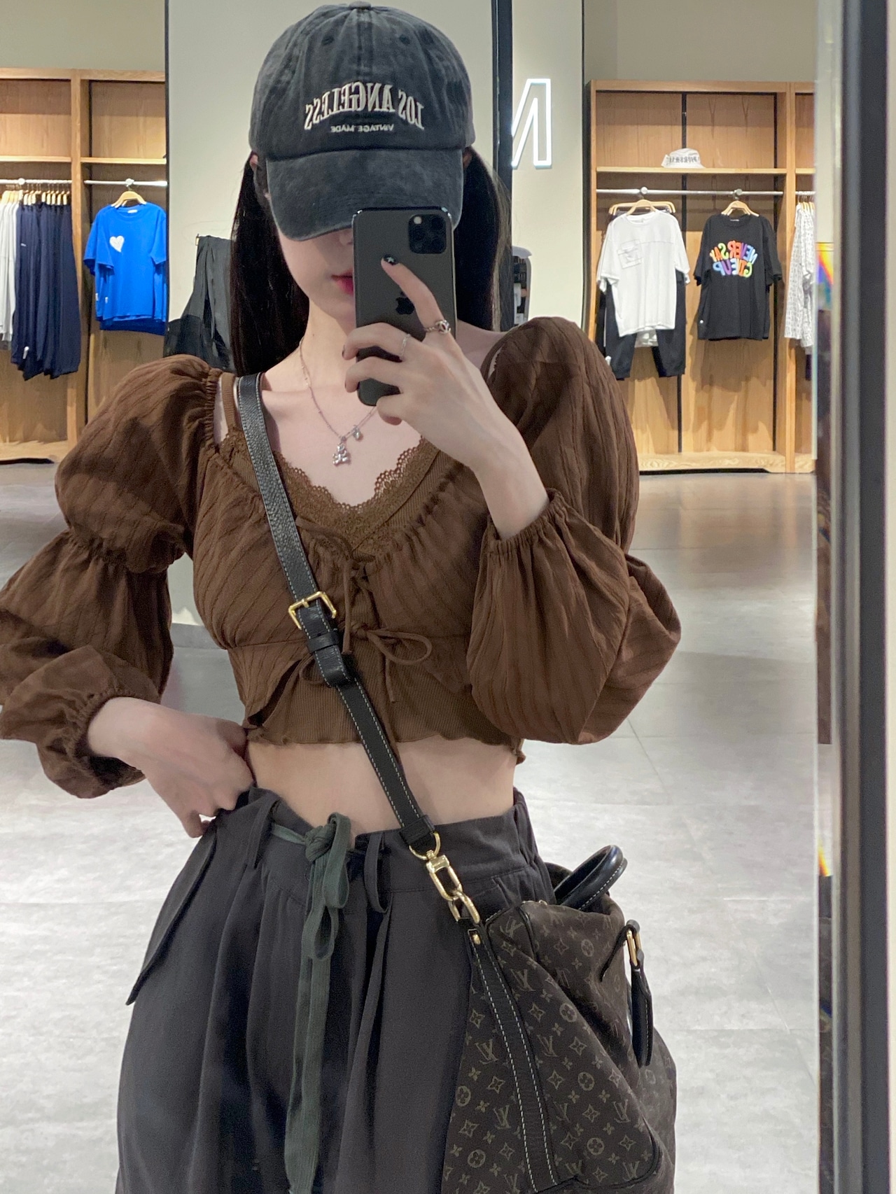 キャミソール レトロ パフスリーブ スクエアカラー ブラウン シャツ レディース 大人可愛い 大人カジュアル シンプル 無地 フレンチ ショート 長袖 デザイン トップ