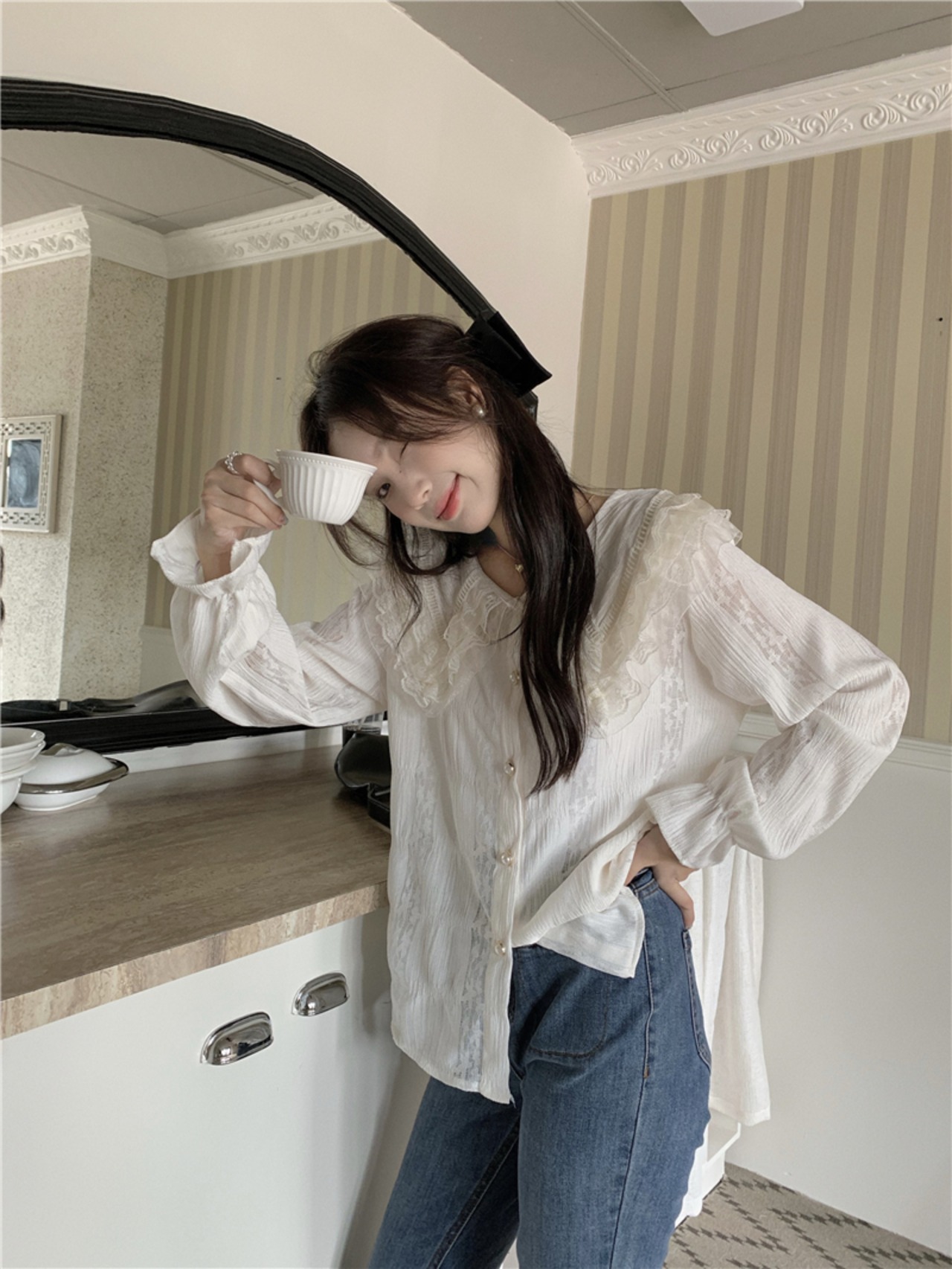 レースブラウス シャツ 長袖 フリル フェミニン ガーリー 大人可愛い レトロ 韓国ファッション