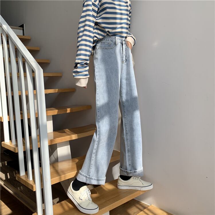 ジーンズ デニムパンツ ハイウエスト ボトム ストレート 着回し シンプル カジュアル 韓国ファッション S-XL