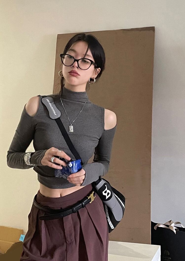 オープンショルダー トップス タイト カットアウト 長袖 カジュアル レトロ 韓国ファッション 2color