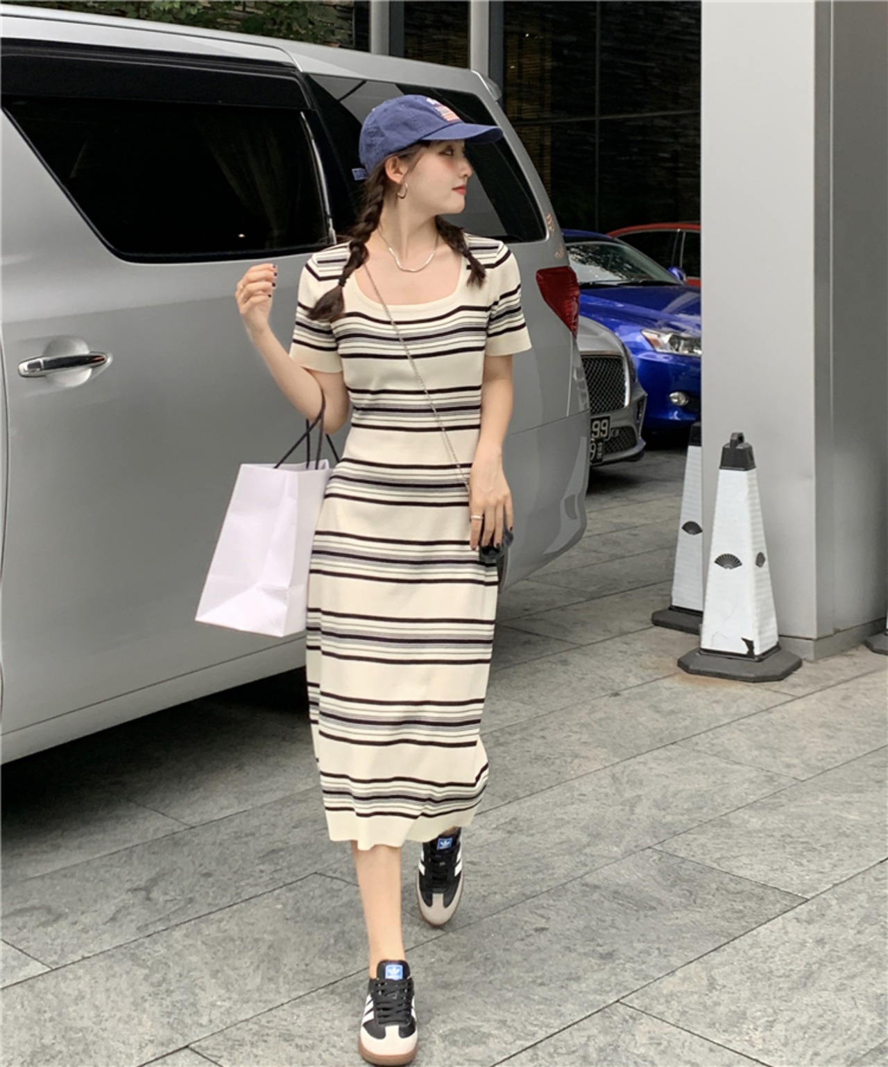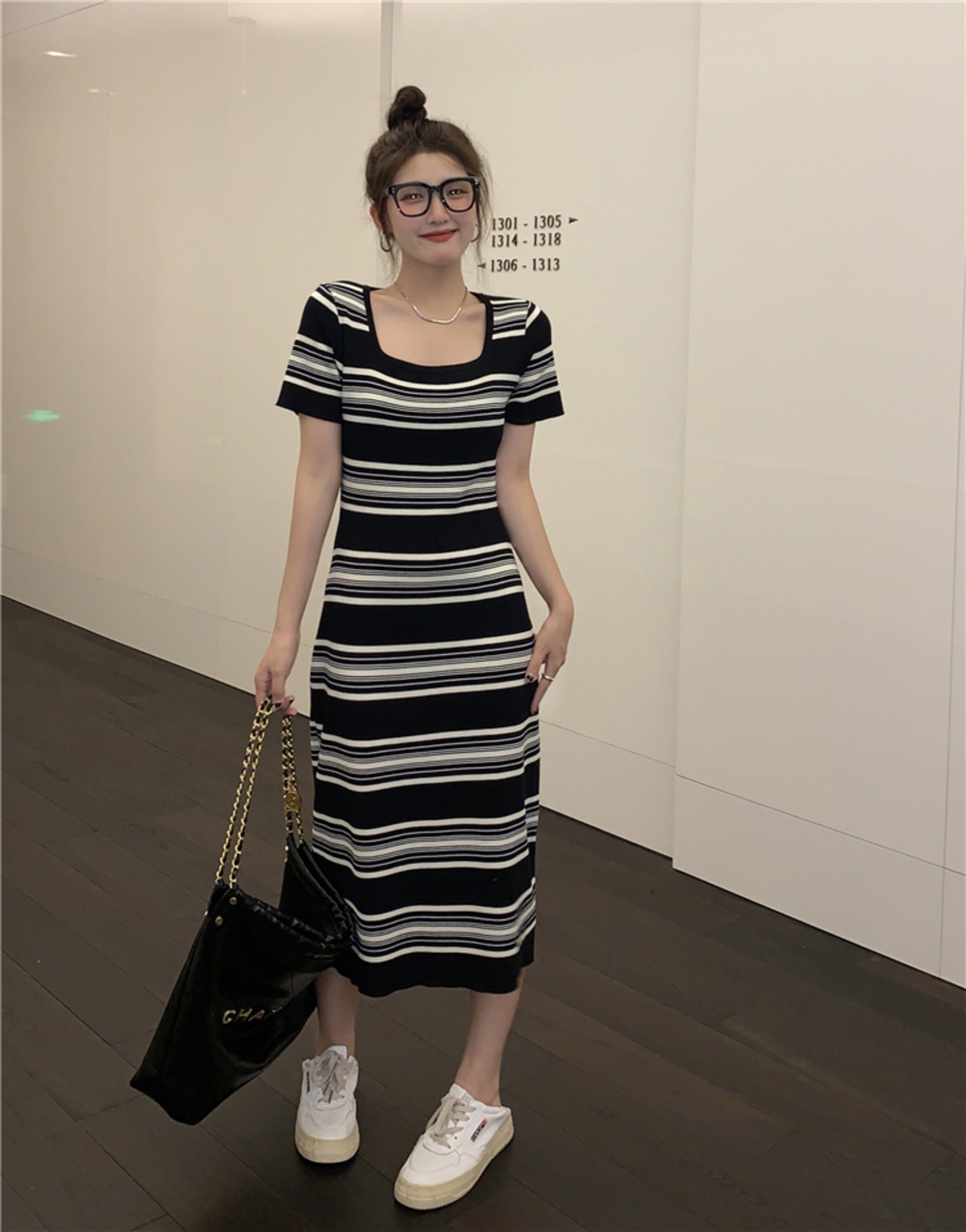 ボーダーストライプワンピース ワンピ ロング ボーダー 半袖 シンプル カジュアル レトロ 韓国ファッション 2color