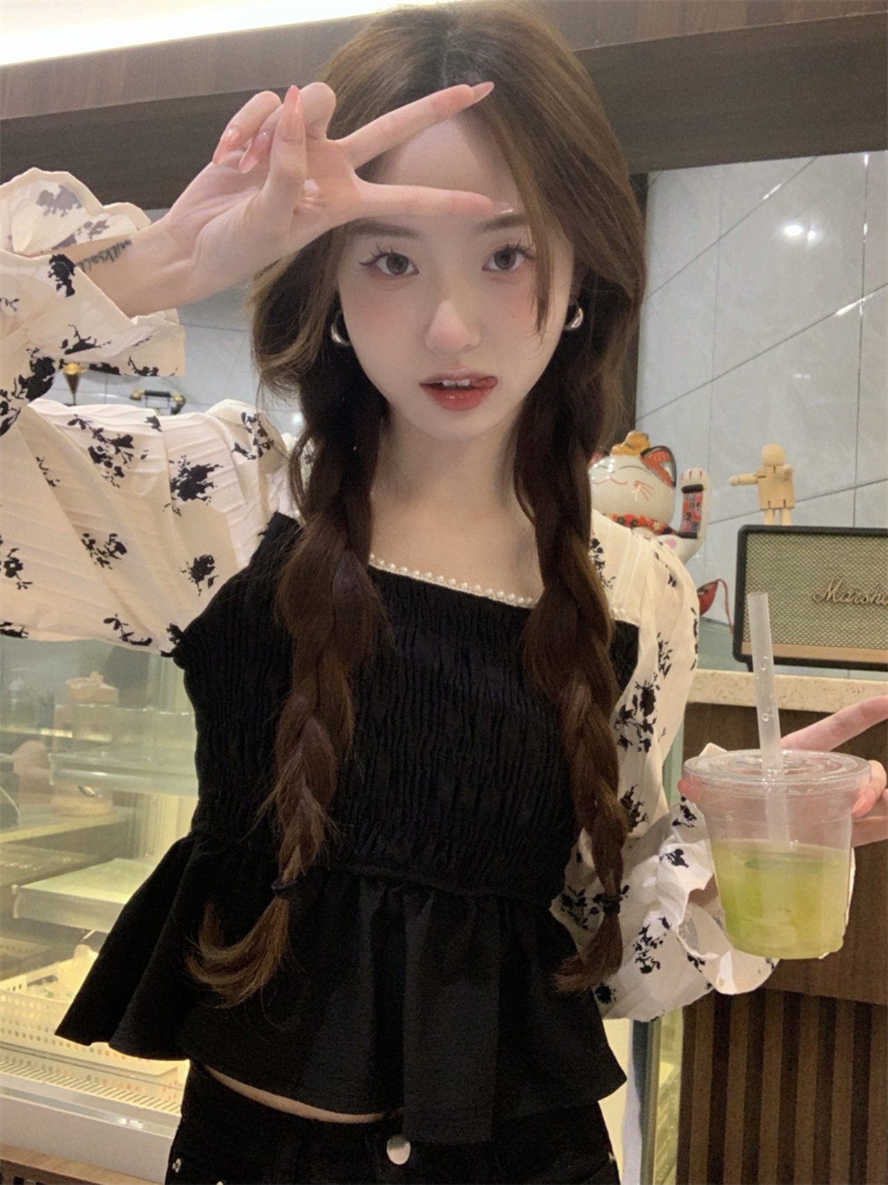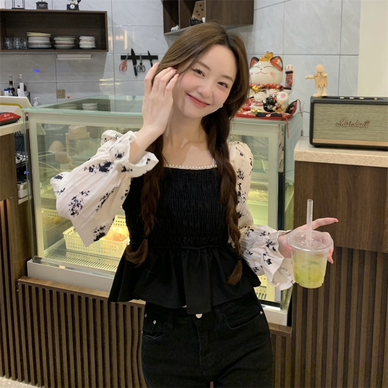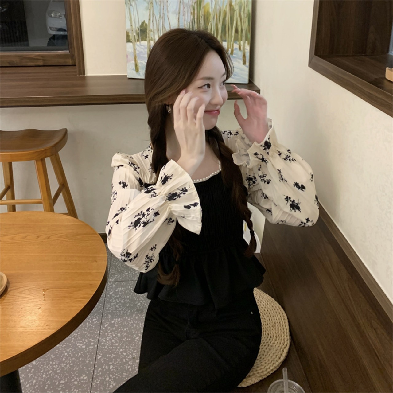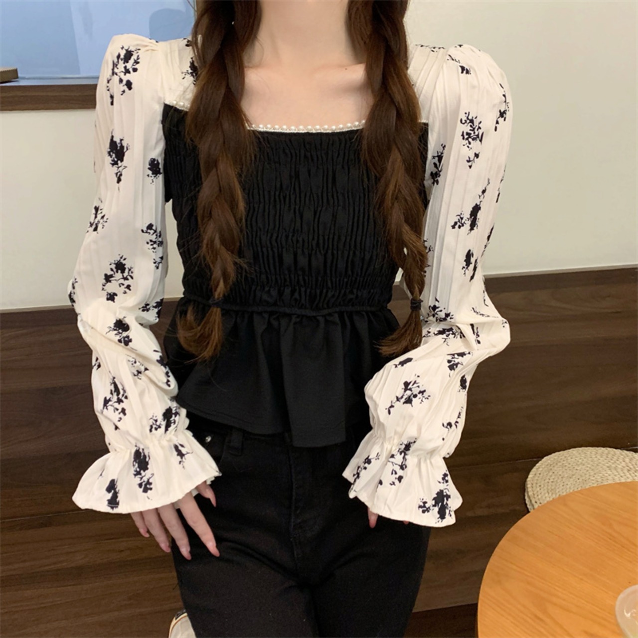 フレンチレトロ 配 色長袖 シフォンシャツ レディース ビーズ 花柄 ショート トップ レディース 大人カジュアル 可愛い