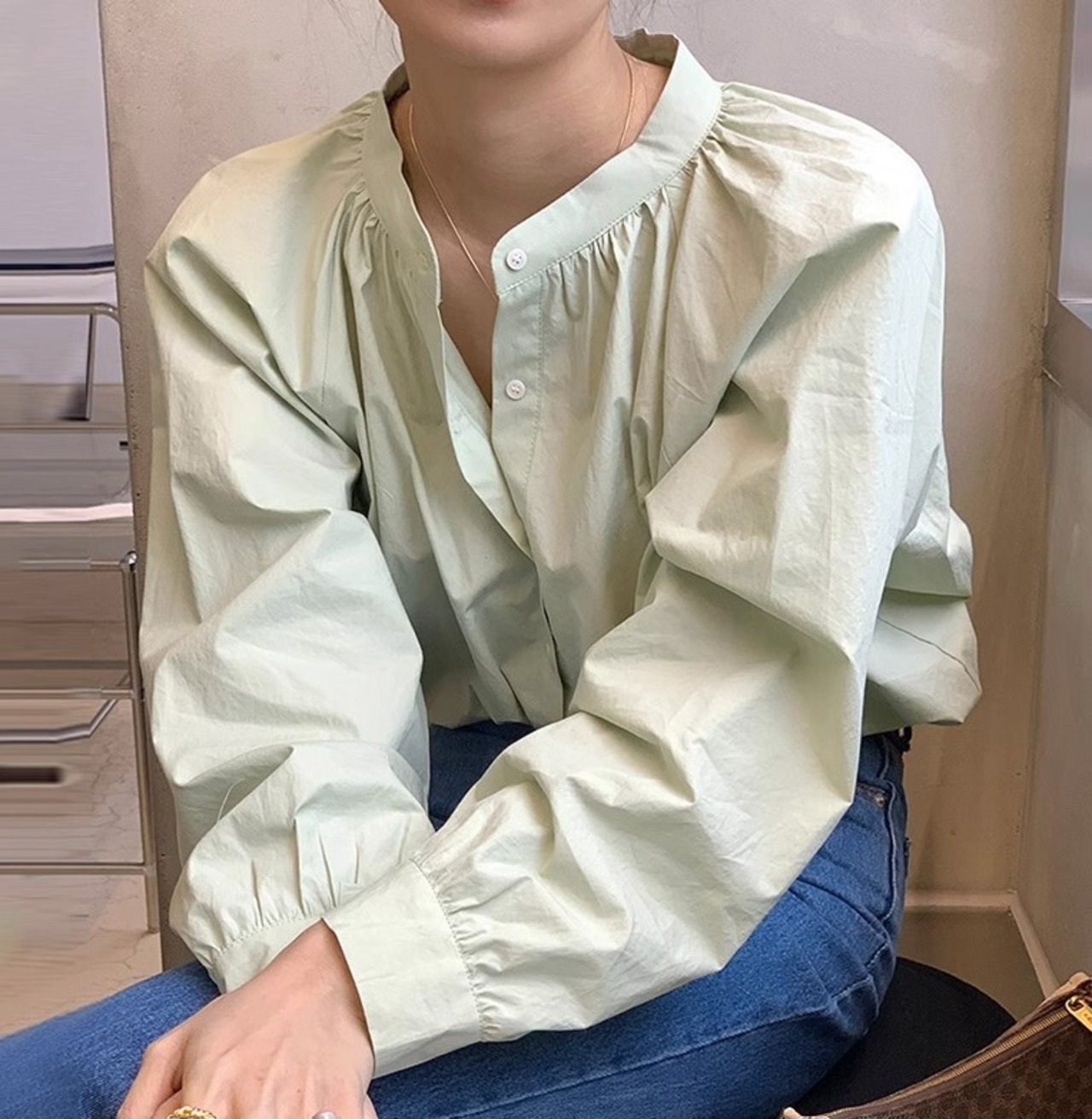 長袖シャツ 韓国ファッション シック シンプル ラウンドネック ライトグリーン スキンルーズソリッドカラー オールマッチ シングルブレストトップ カジュアル 大人 可愛い