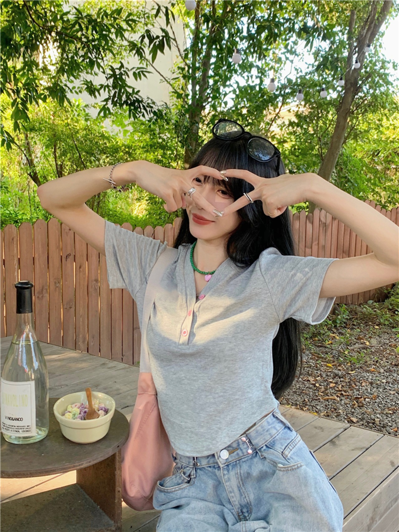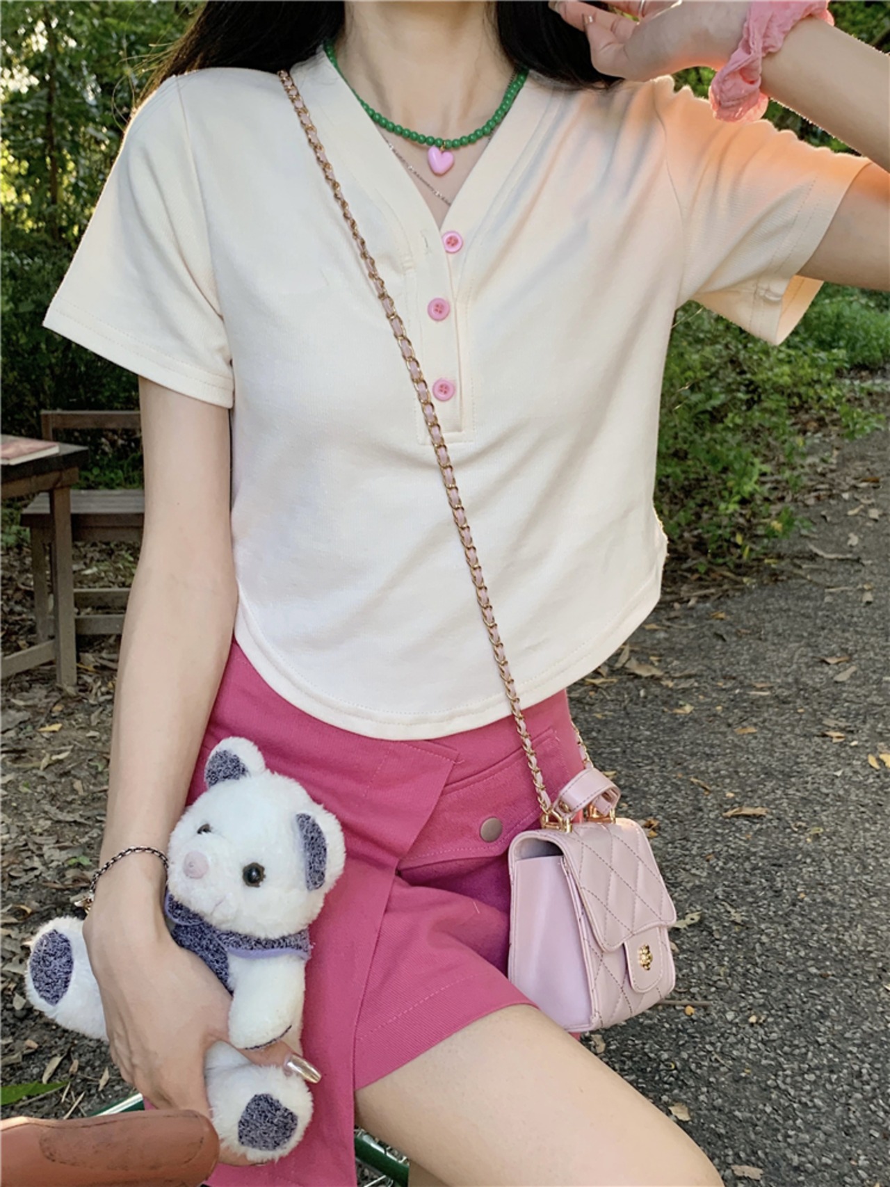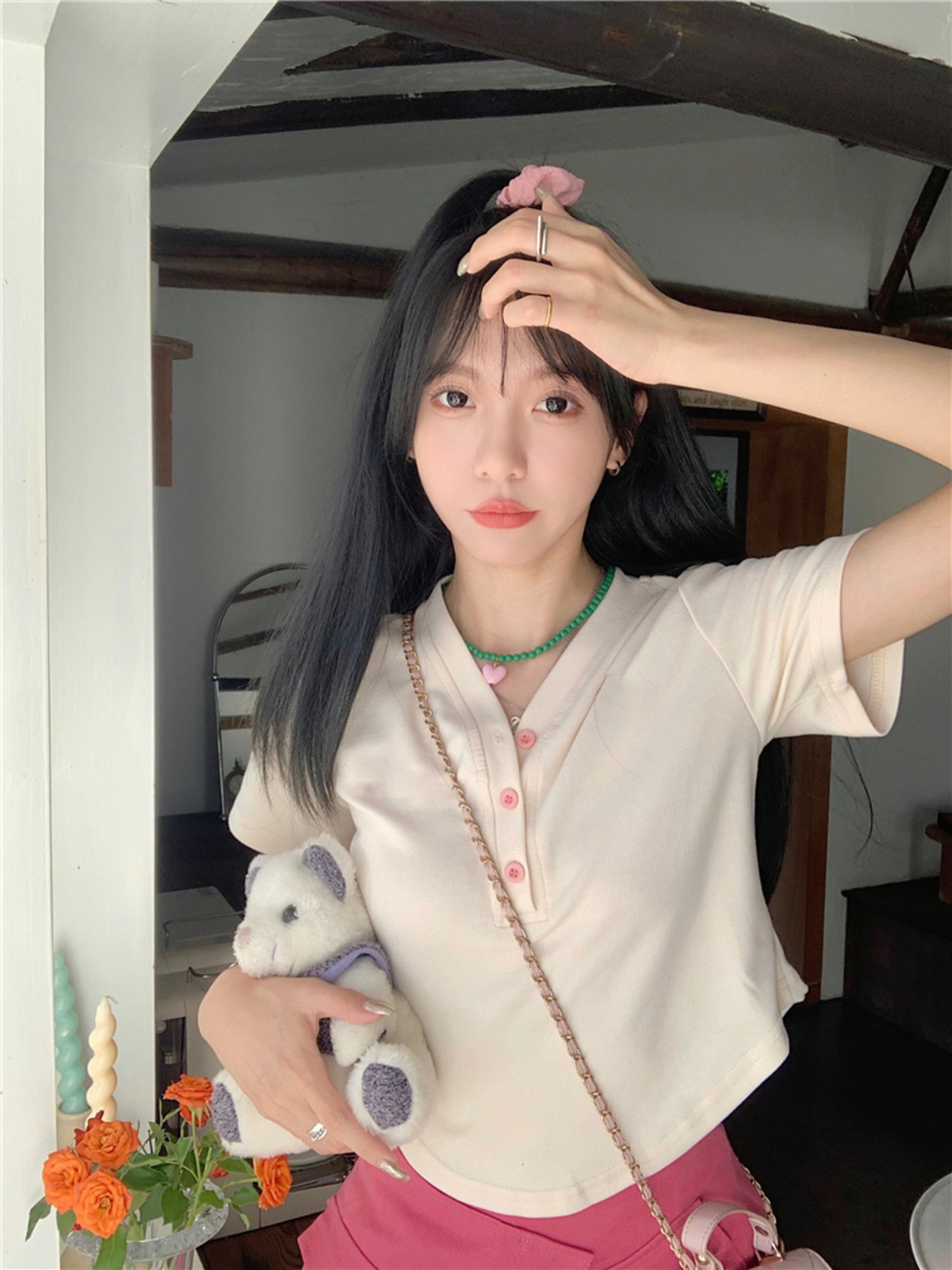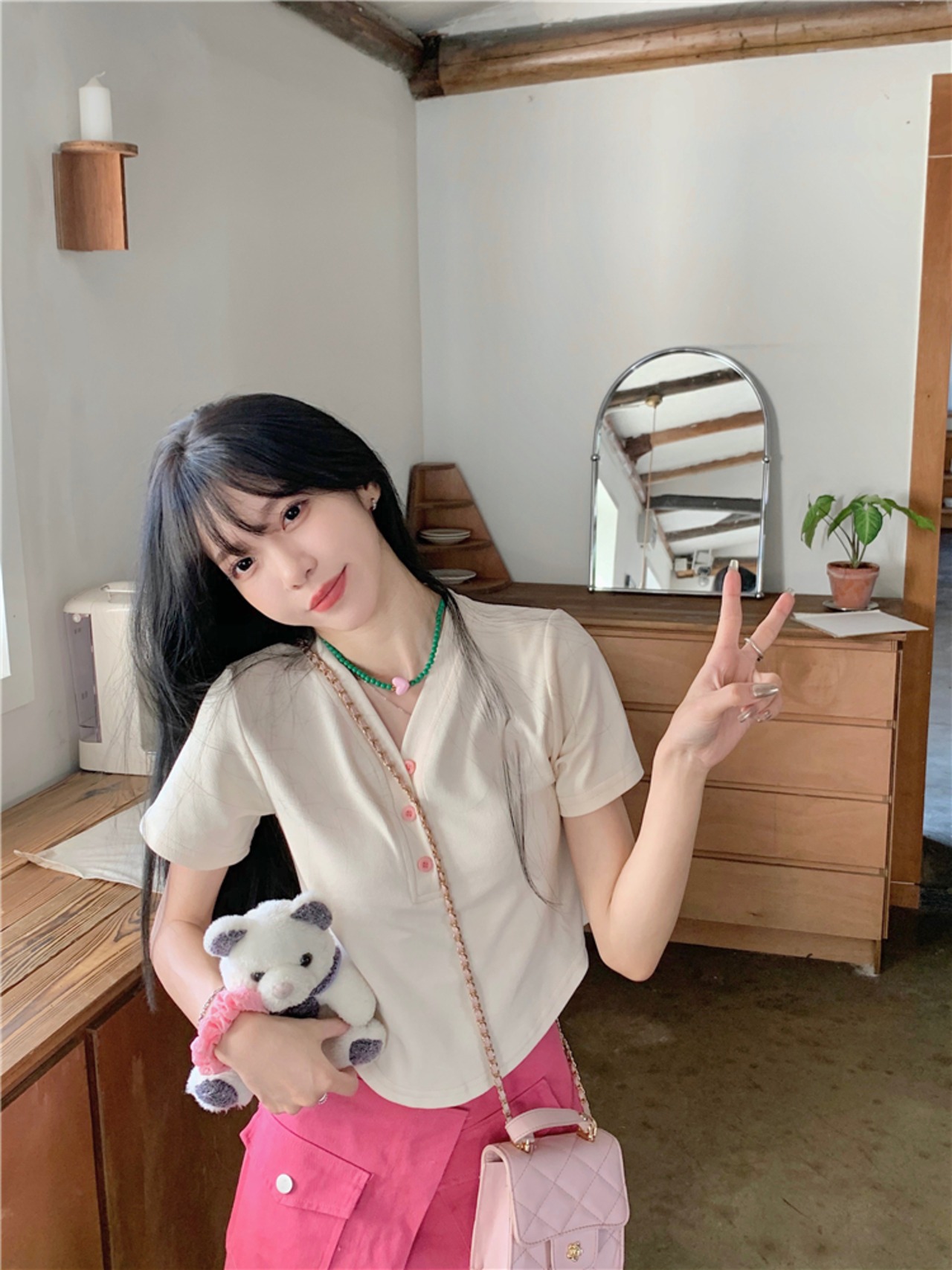 ポロトップス Vネックトップス トップス 半袖 ショート 刺繍 カジュアル 大人可愛い 韓国ファッション 2color S-L