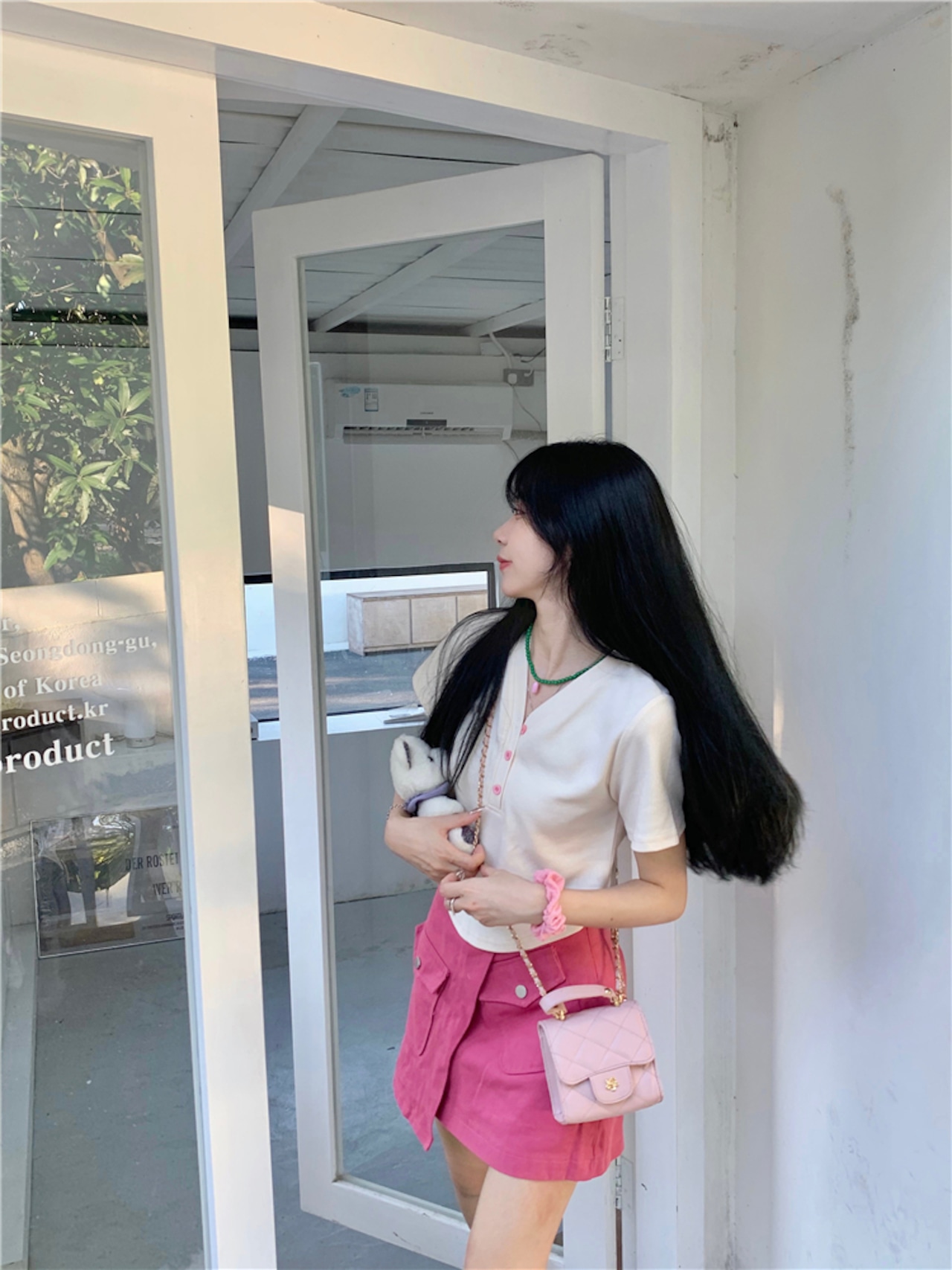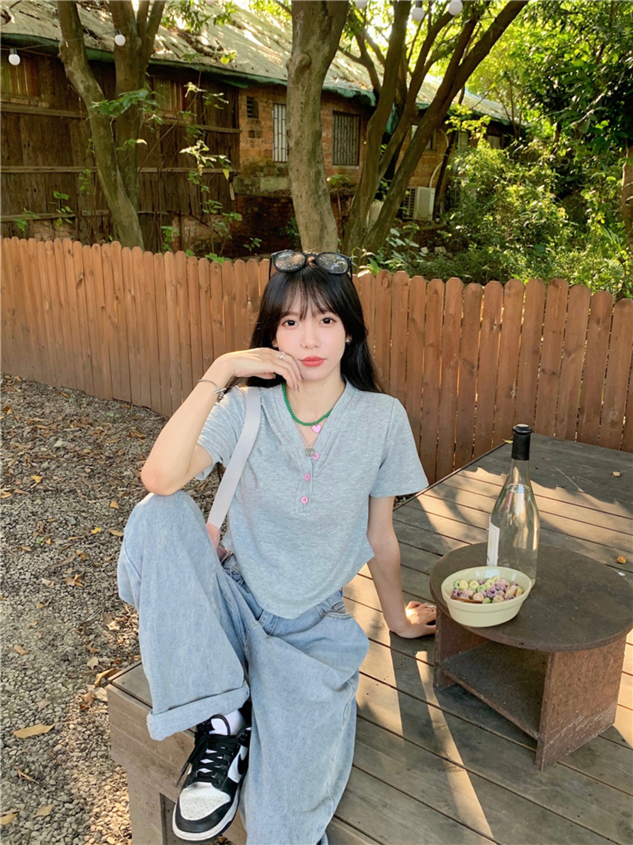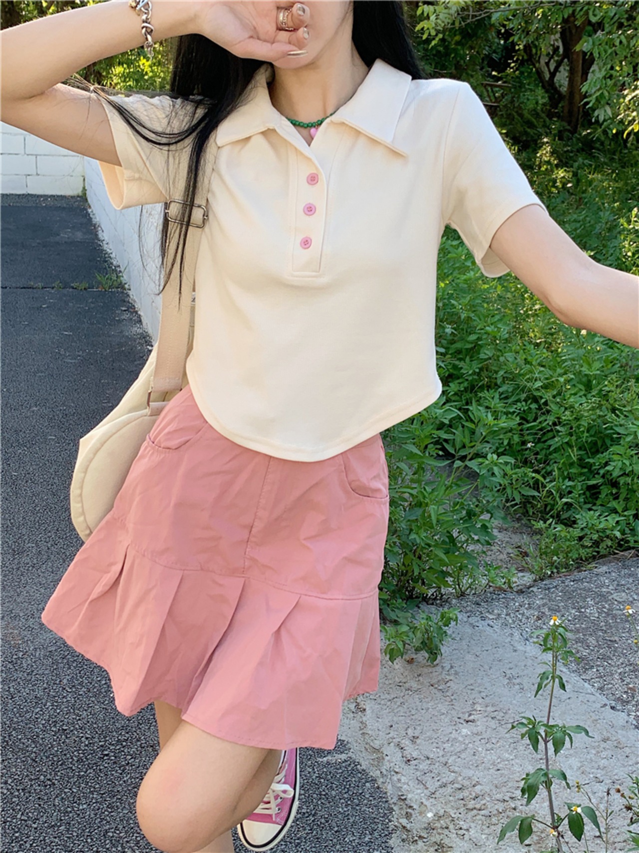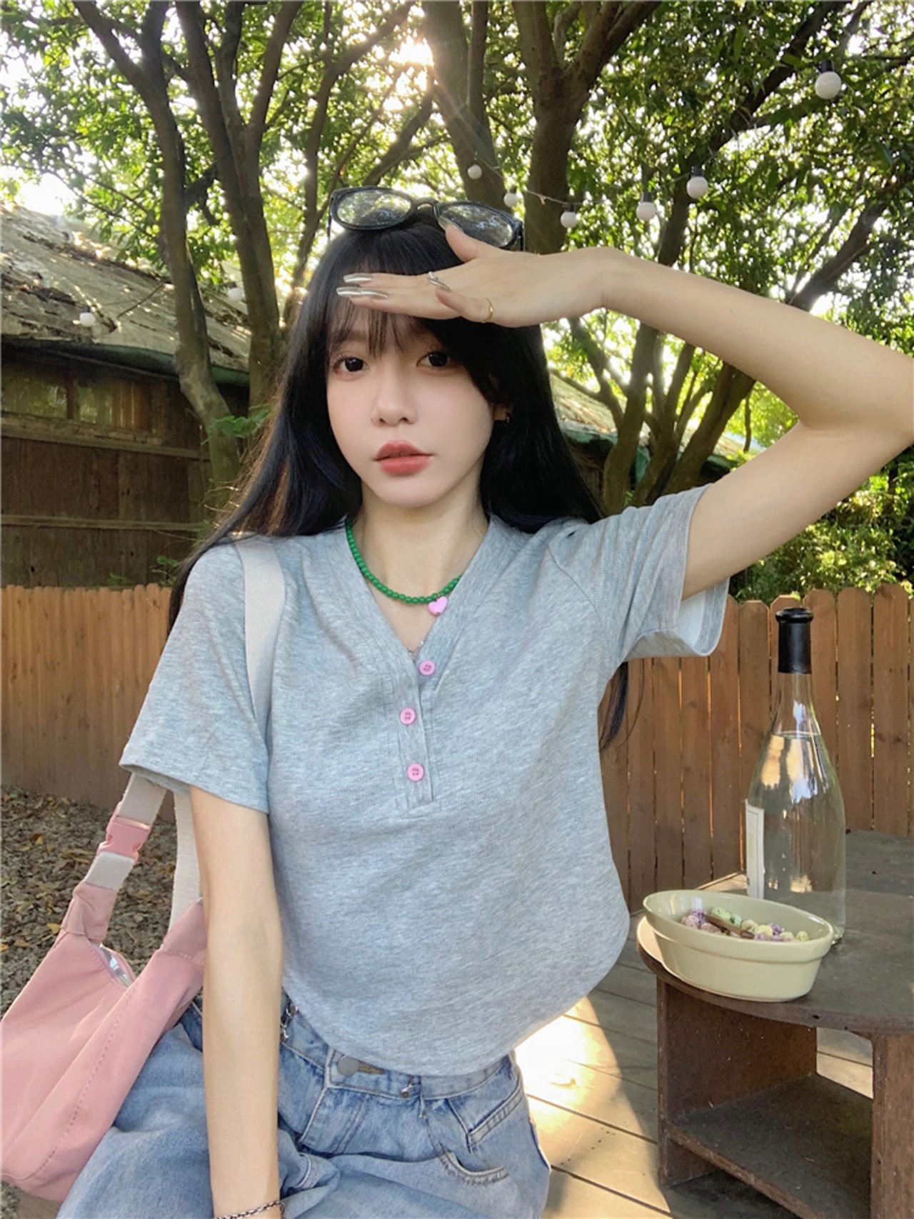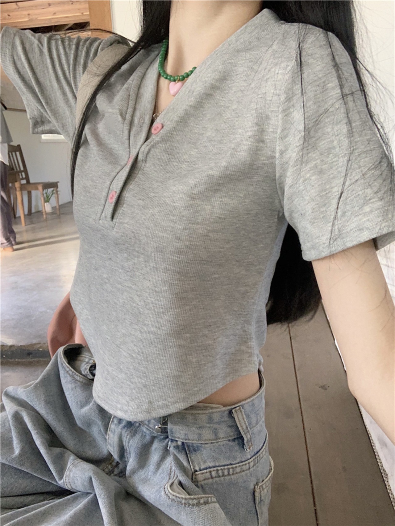ポロトップス Vネックトップス トップス 半袖 ショート 刺繍 カジュアル 大人可愛い 韓国ファッション 2color S-L