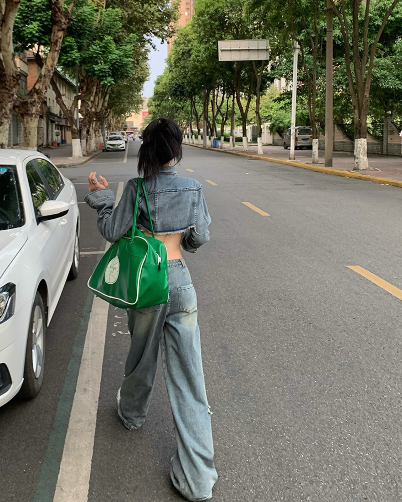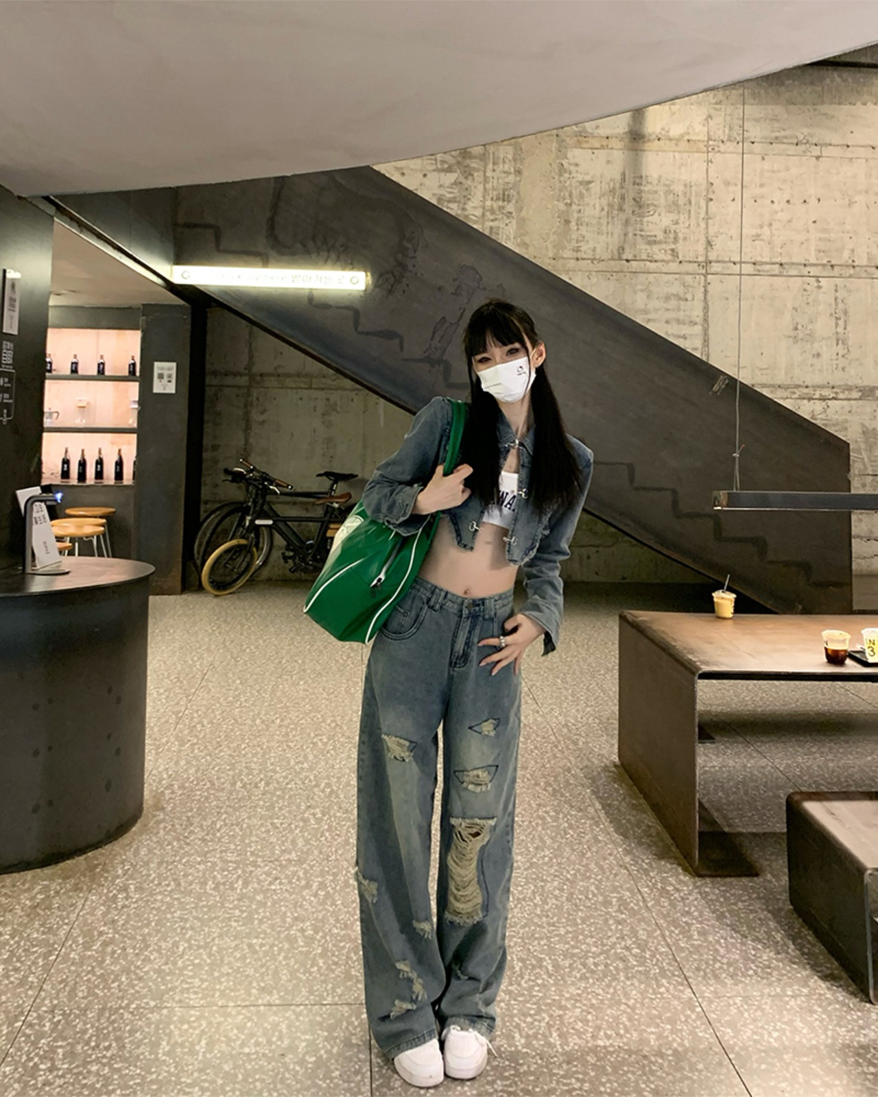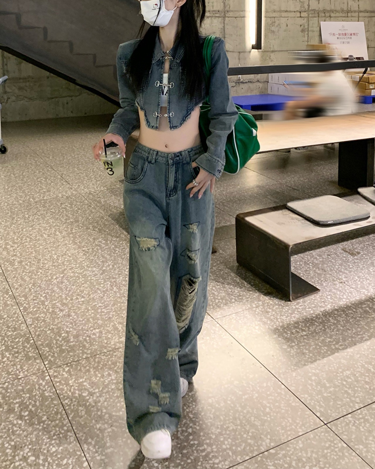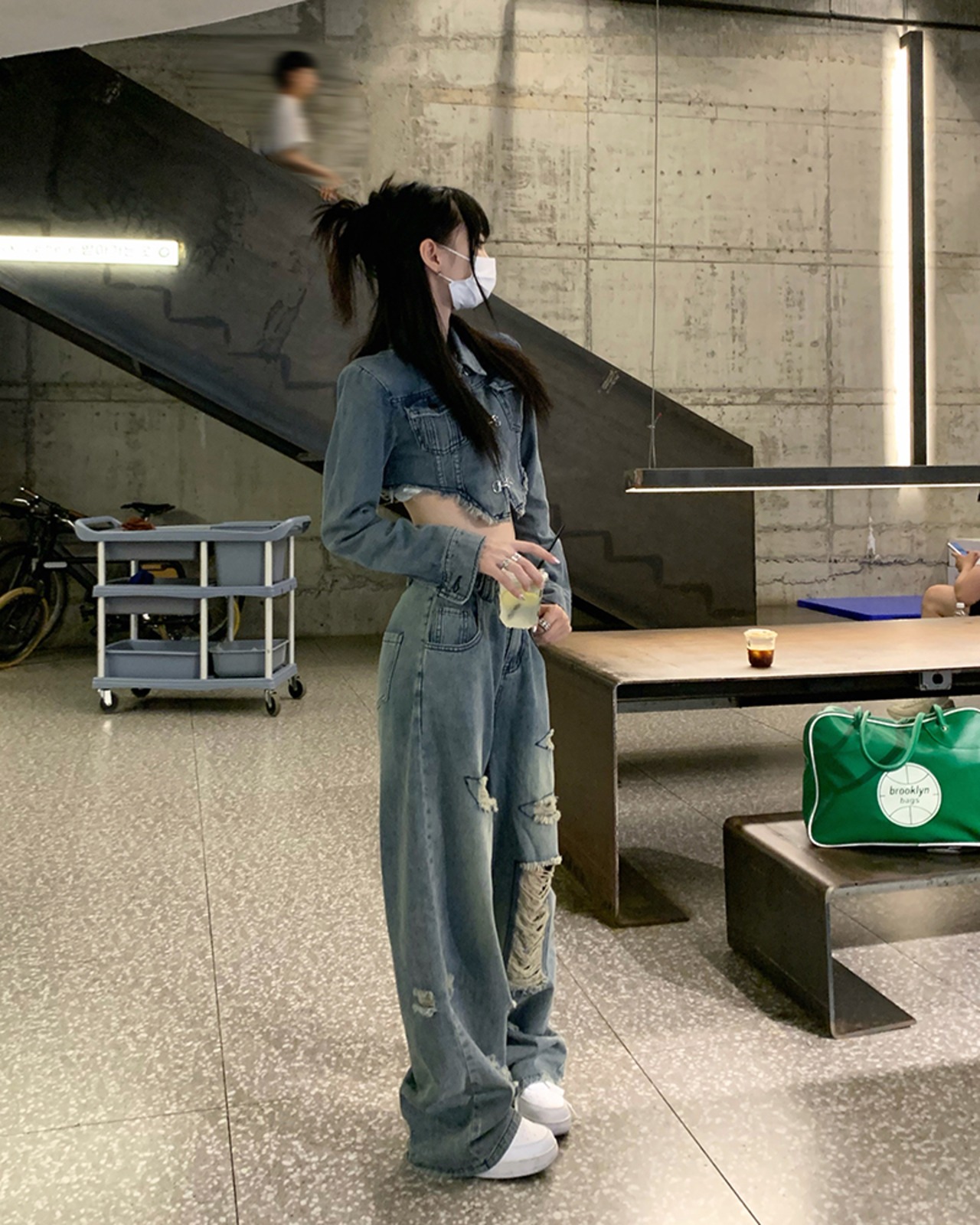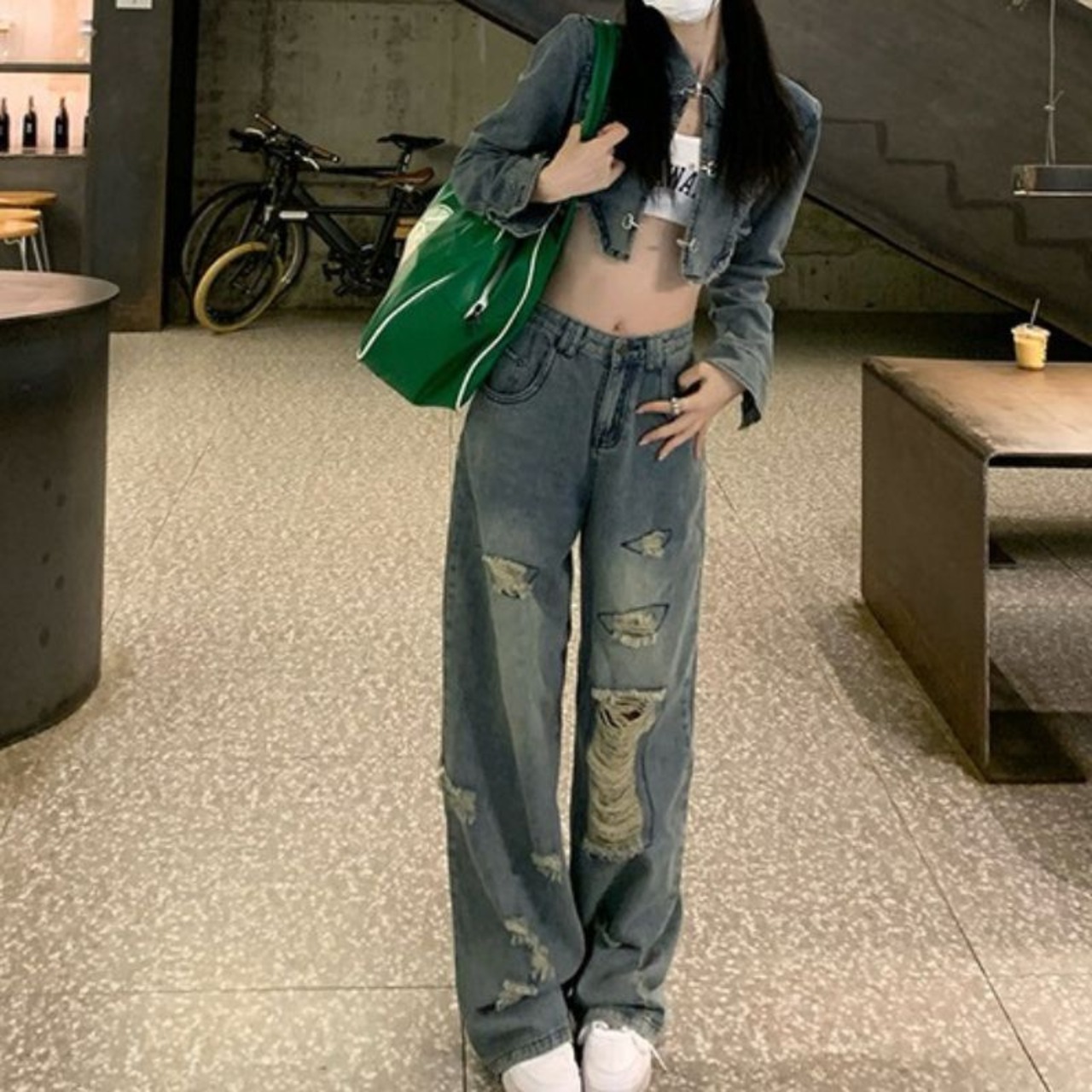 デニムセットアップ ツーピース 上下セット ダメージ ジャケット Gジャン ボトム パンツ カジュアル レトロ 韓国ファッション S-L