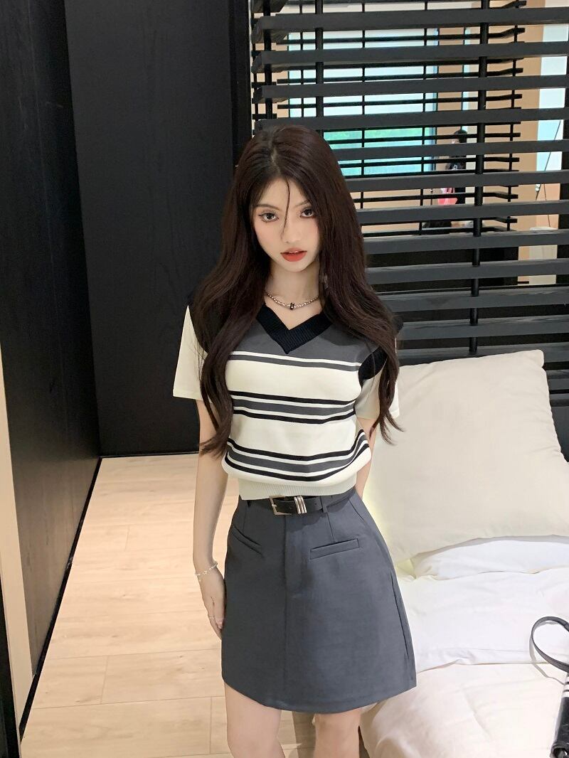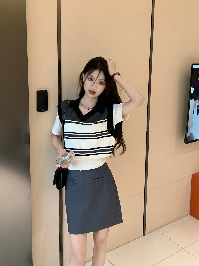 セットアップ ツーピース 上下セット ポロ Vネック ストライプ トップス ボトム スカート きれいめ レトロ 韓国ファッション S-L