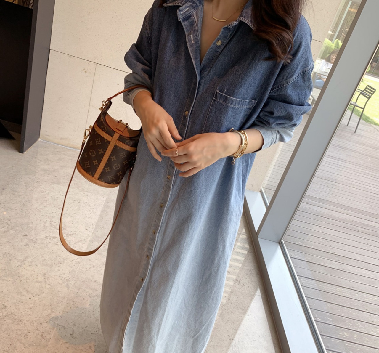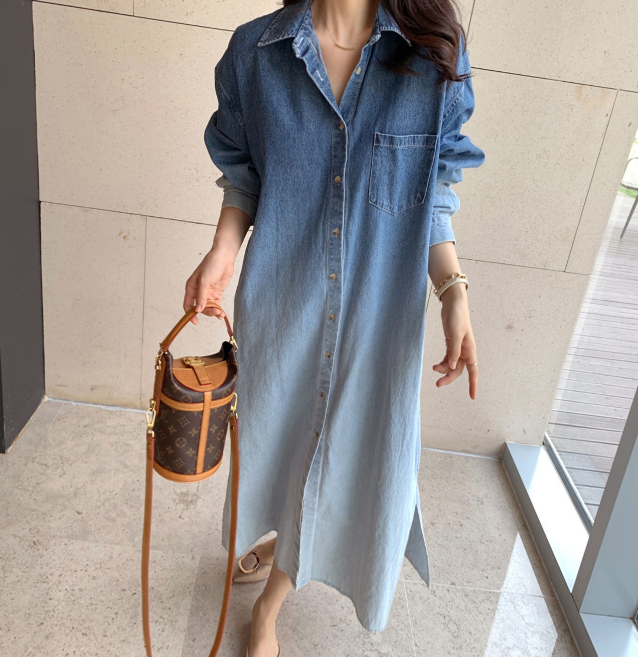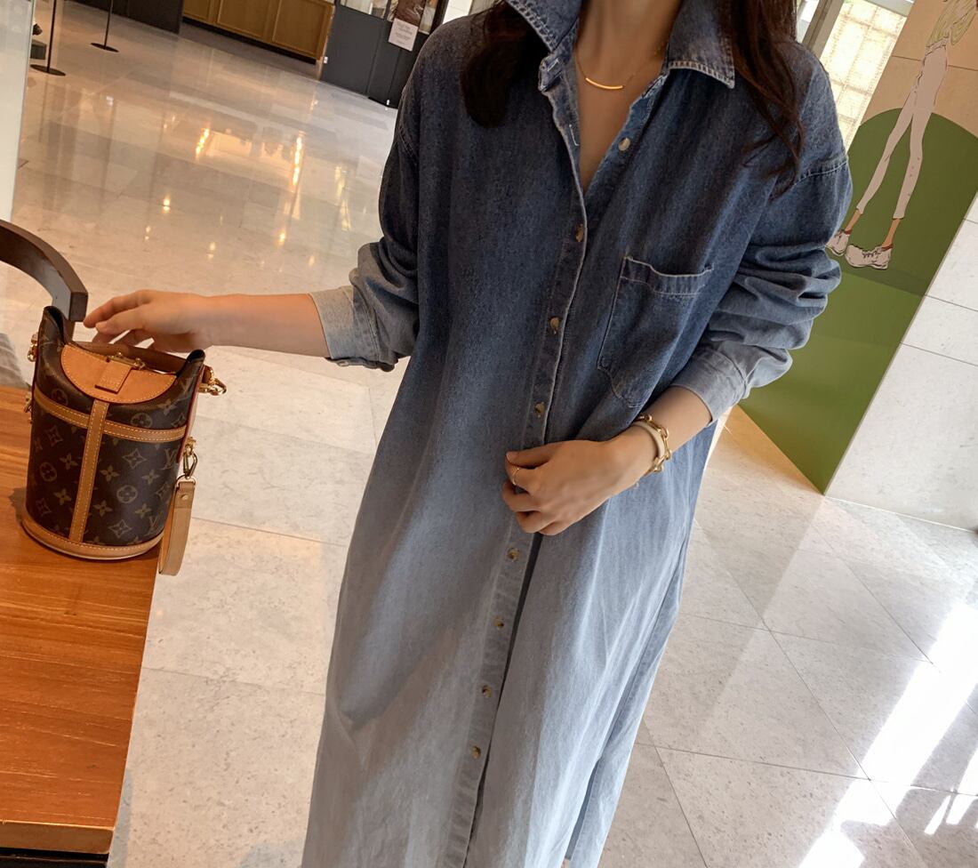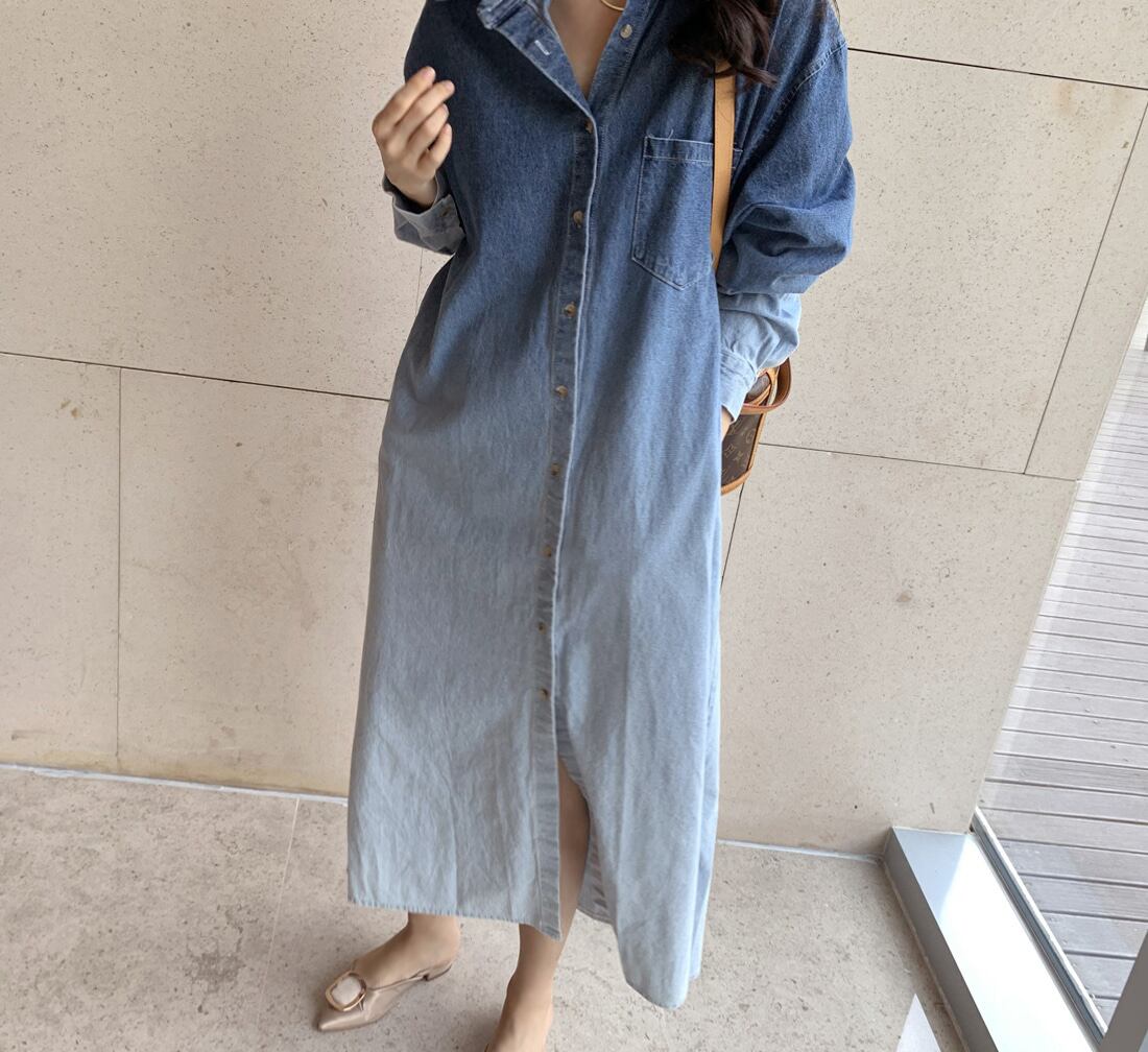 長袖 デニム ドレス シック フレンチ ニッチラペル グラデーション スマッジ デザインシングルブレストルーズ 韓国ファッション レディース シンプル きれいめ