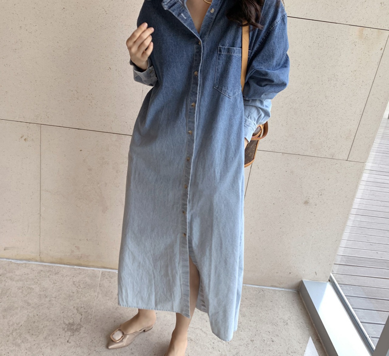 きれいなシルエットを描く長袖 デニム ドレス 。