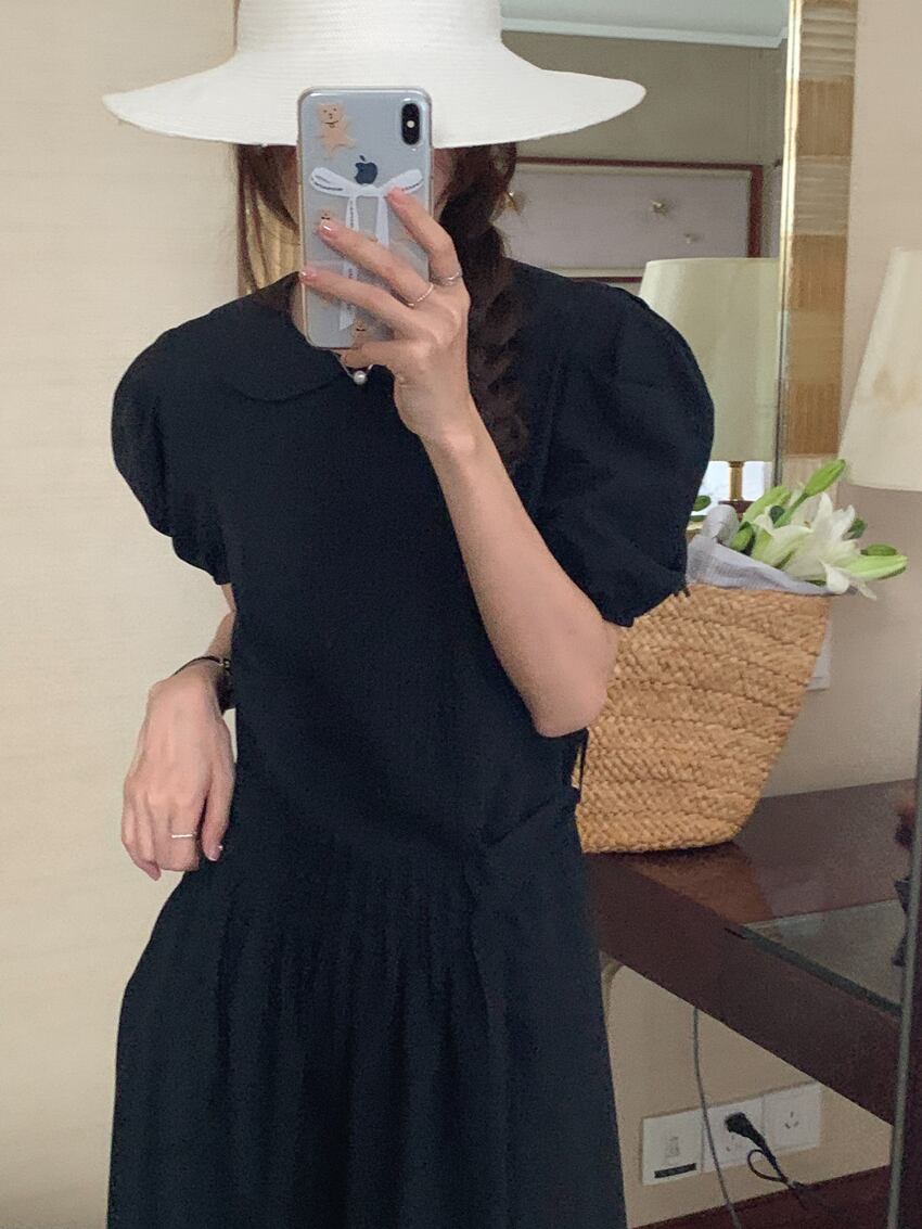 ワンピース パフスリーブドレス シック 夏 襟 プリーツデザインセンス タイウエスト スリム レディース 韓国ファッション レディース シンプル きれいめ