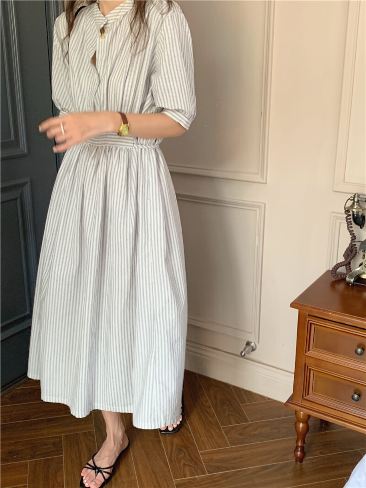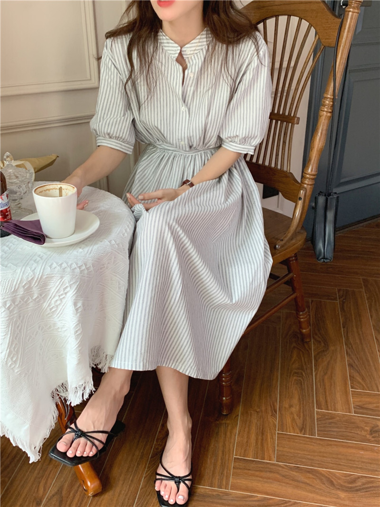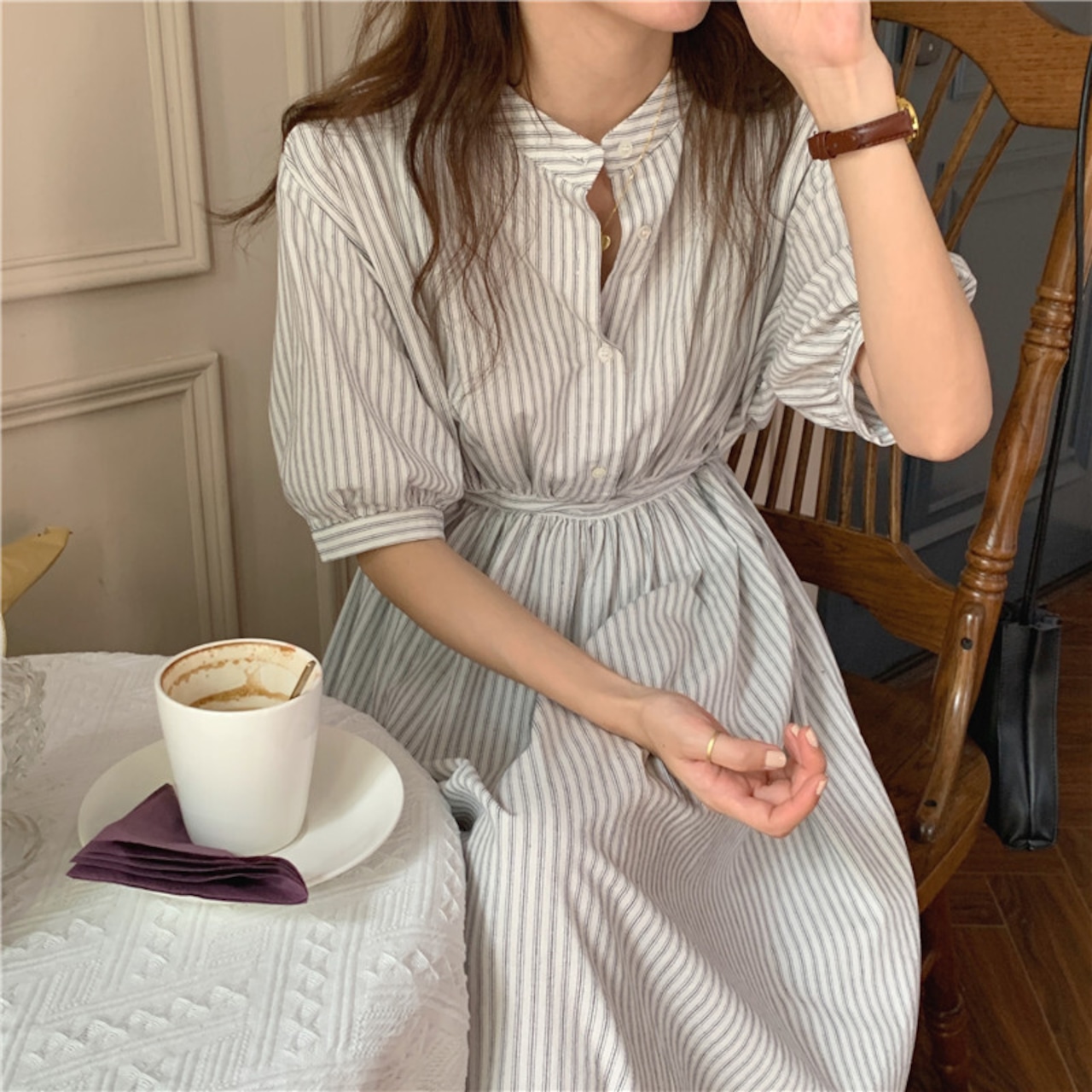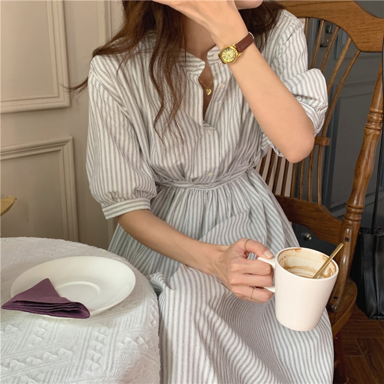 ワンピース ポイントパフスリーブドレス シック シンプル ラウンドネック 小胸ボタン アップストライプ ネクタイウエスト レディース 大人カジュアル 可愛い 韓国ファッション
