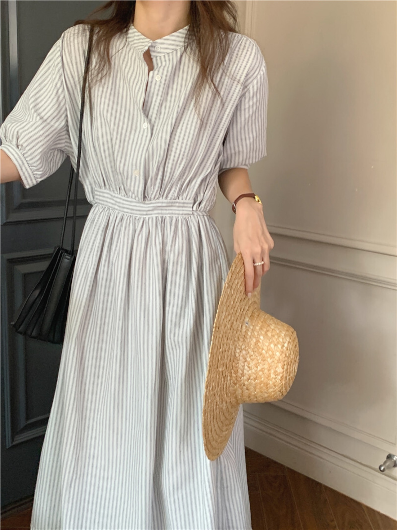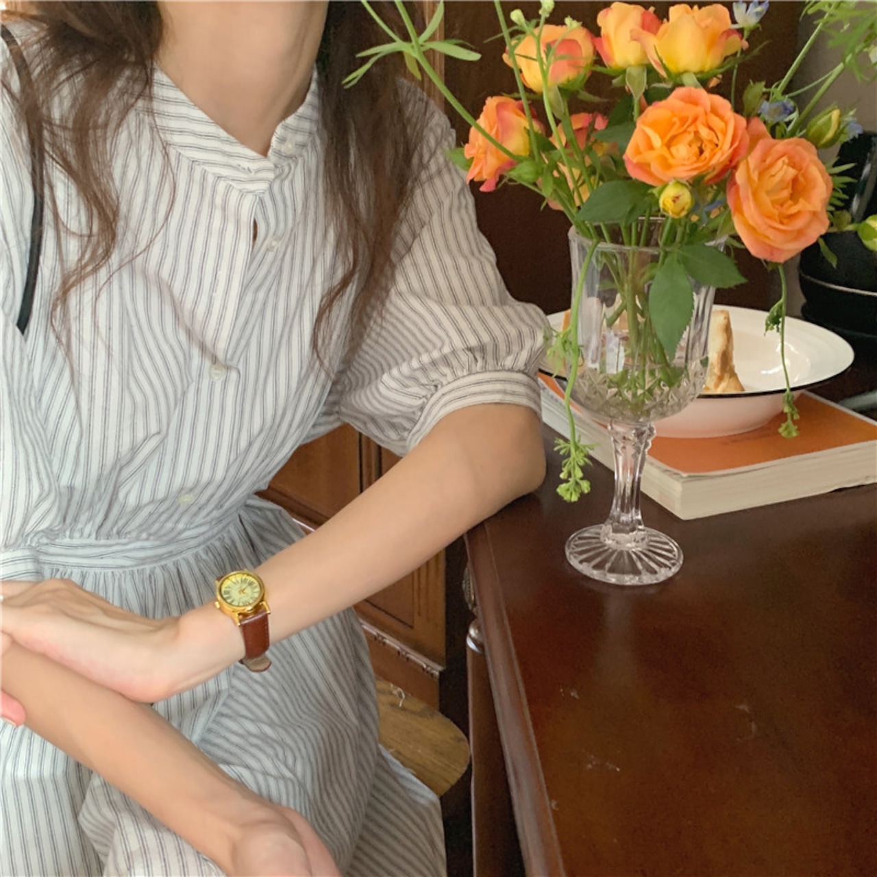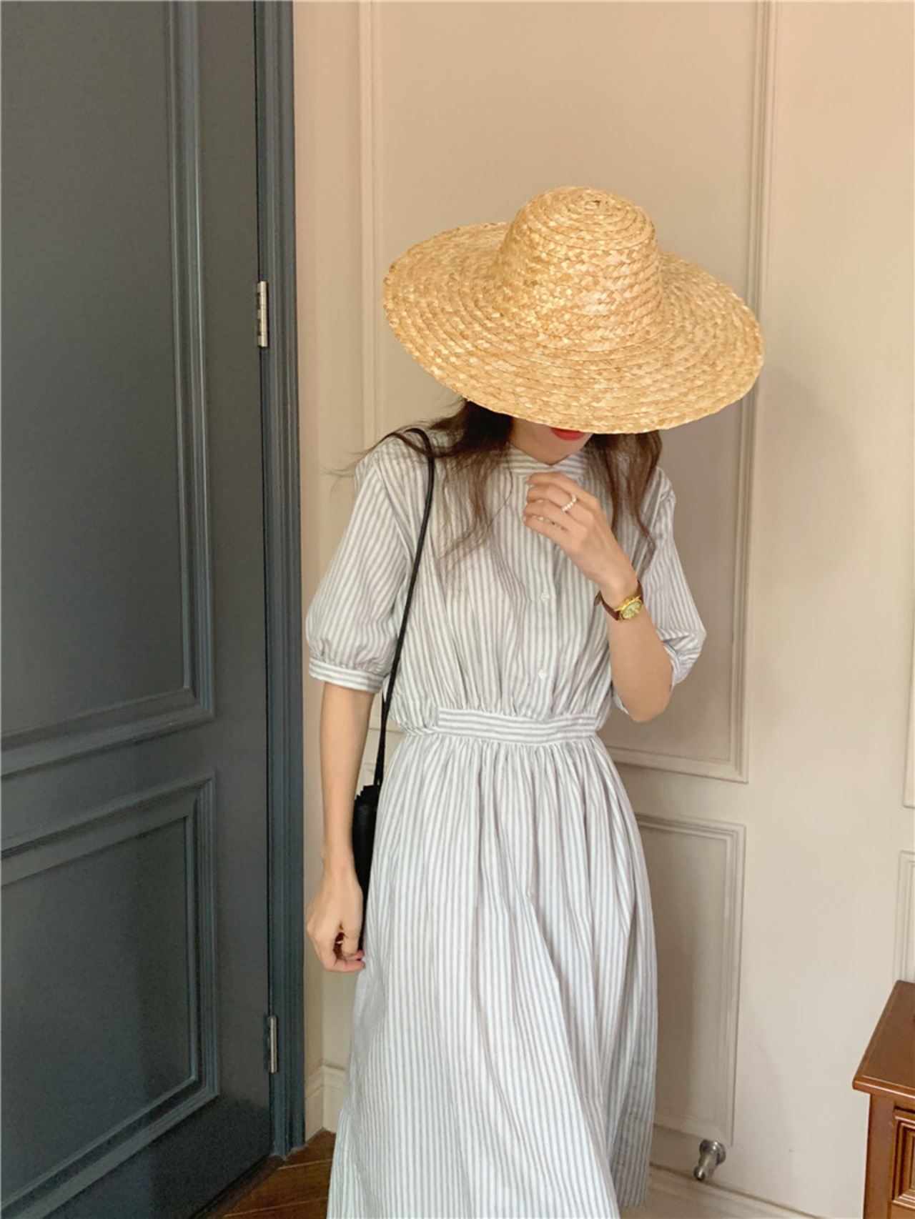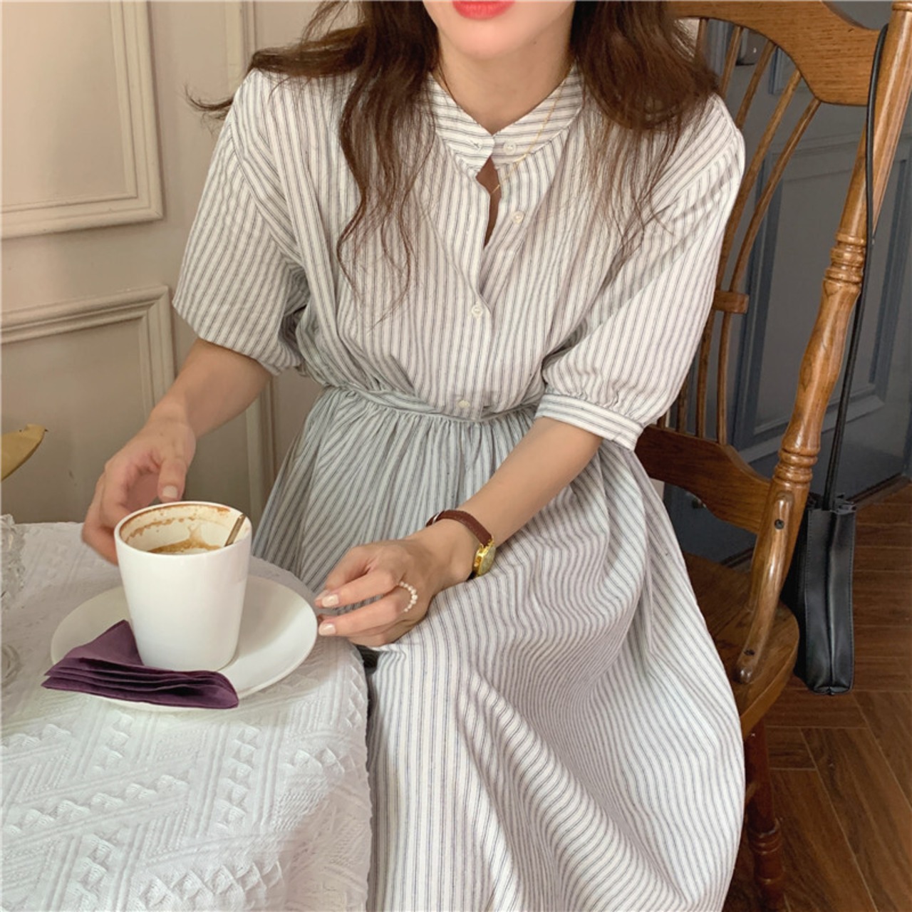 ワンピース ポイントパフスリーブドレス シック シンプル ラウンドネック 小胸ボタン アップストライプ ネクタイウエスト レディース 大人カジュアル 可愛い 韓国ファッション