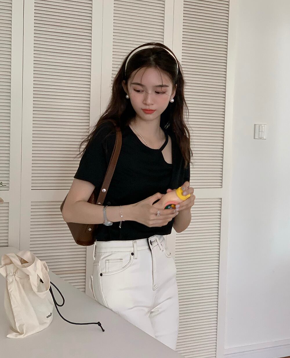 オープンデザイントップス タイト スリム トップス アシンメトリー シンプル カジュアル 可愛い レトロ 韓国ファッション 3color