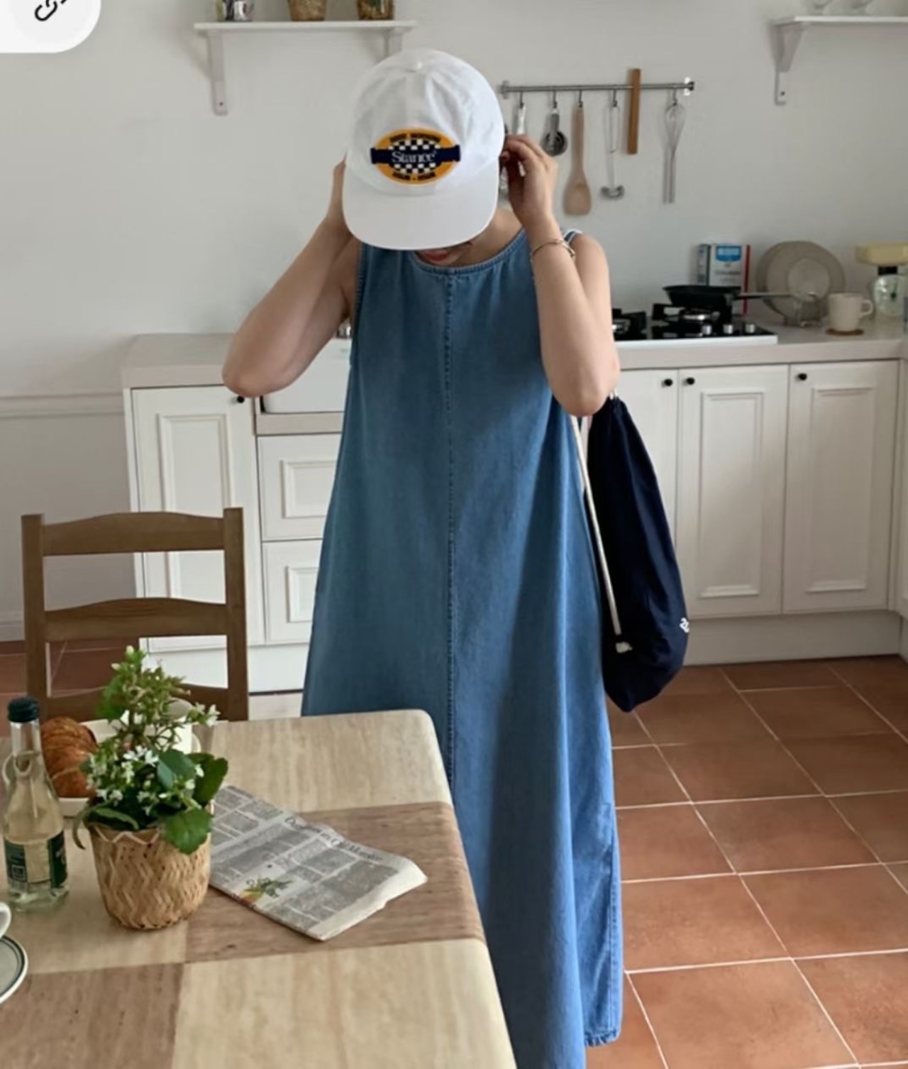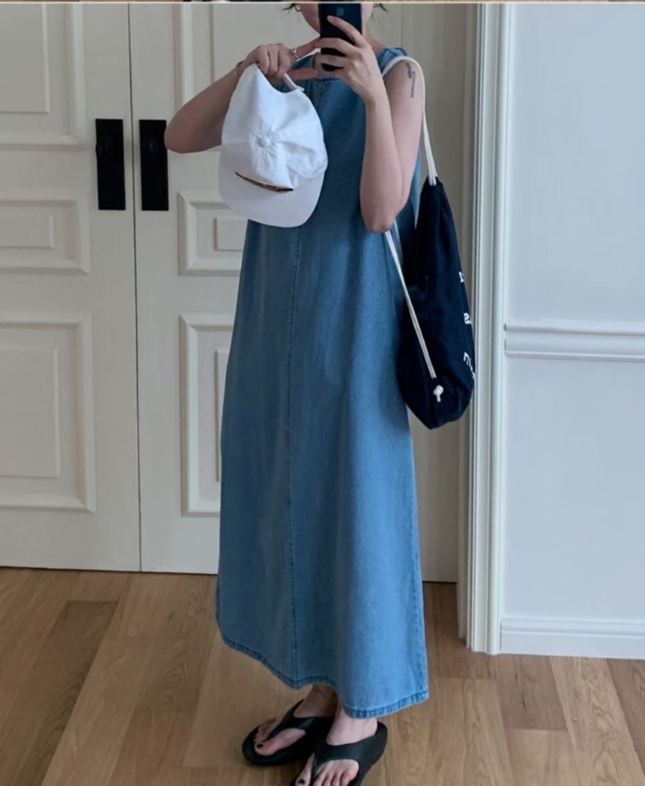 ワンピース シック 夏 ニッチ ラウンドネック 背中の開いたネクタイ 弓ルーズ デニムベストドレス レディース 韓国ファッション カジュアル 大人 可愛い
