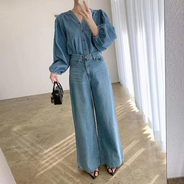 シック レトロ Vネック 長袖 デニムシャツ + ハイウエストカジュアルストレートレッグワイドレッグ パンツスーツ レディース 韓国ファッション カジュアル 大人 可愛い キレイ目