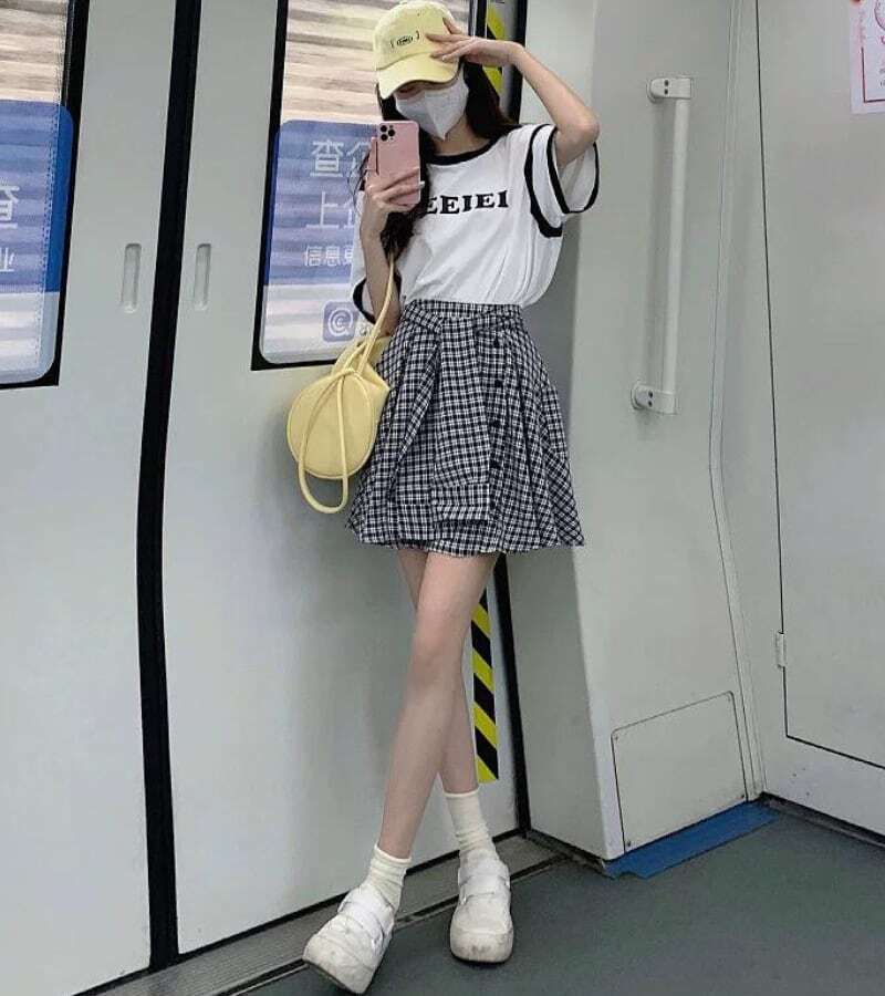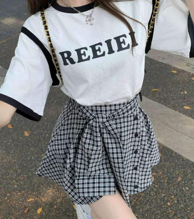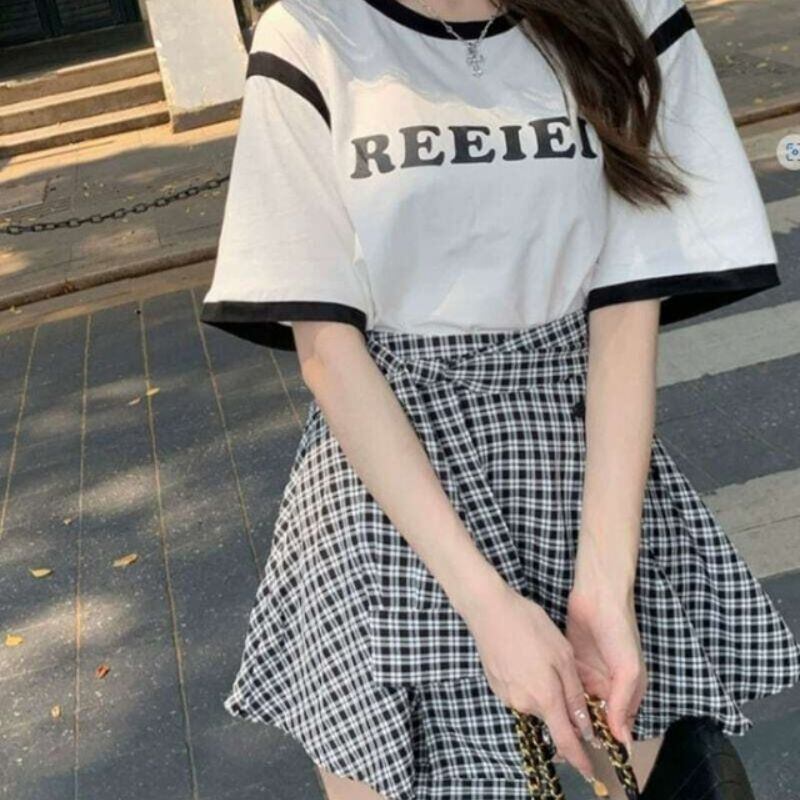 可愛すぎる2点セット♪ ロゴ 配色 Tシャツ チェック柄 スカート セットアップ トップス カットソー ゆったり フレアスカート ミニスカート 上下セット カジュアル 韓国っぽ 学生 リンガーTシャツ