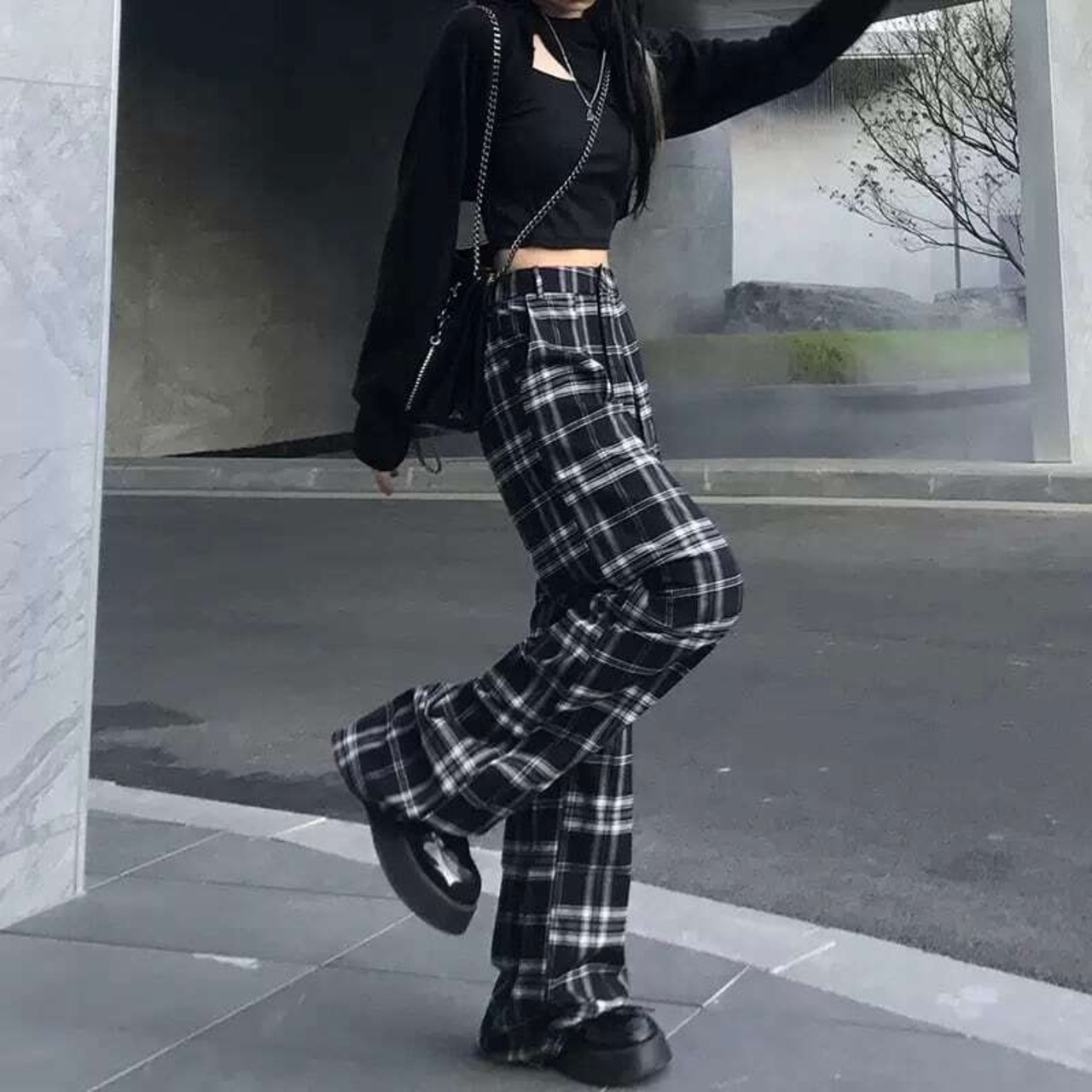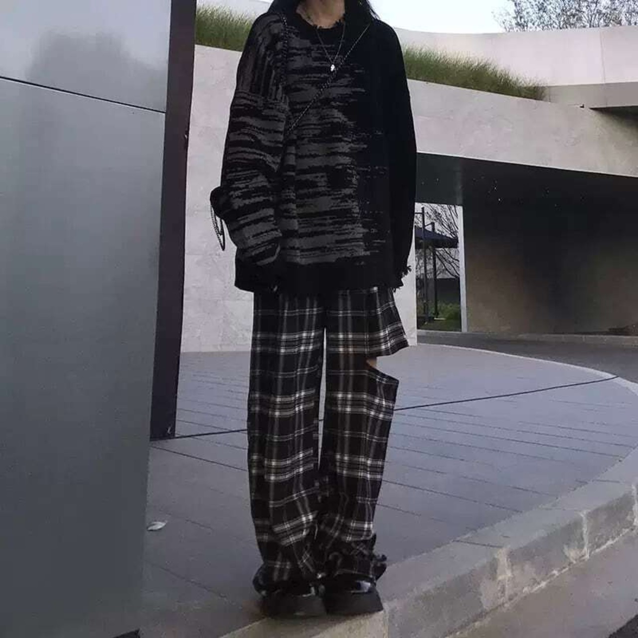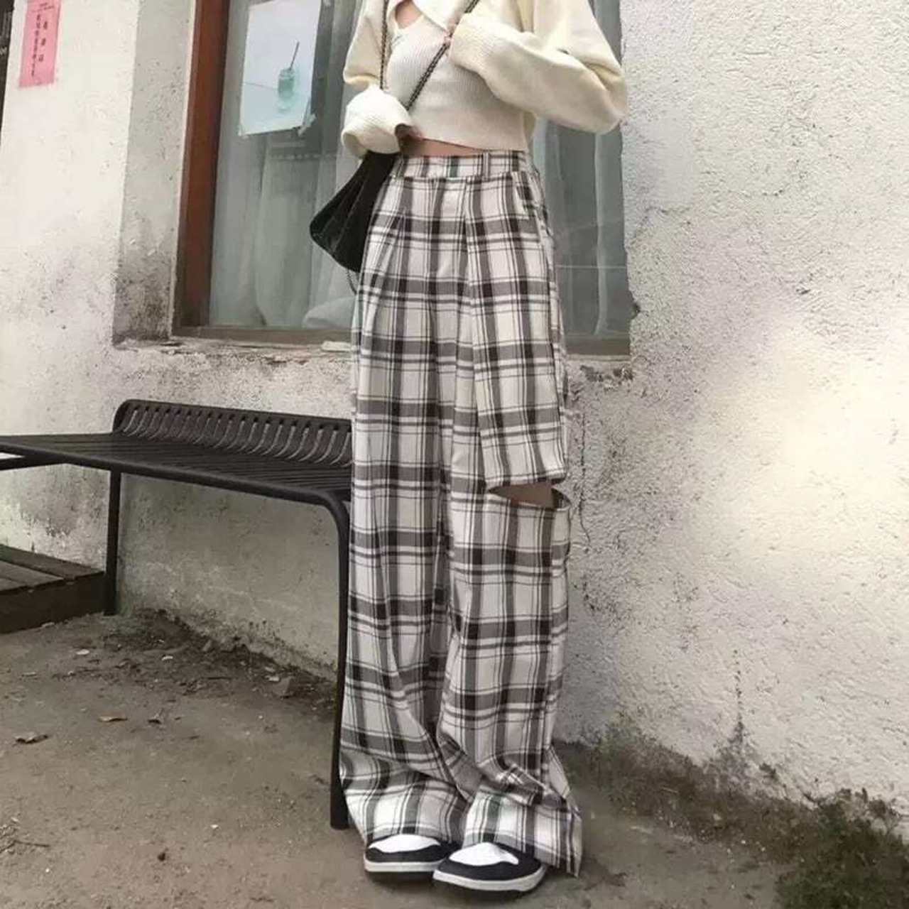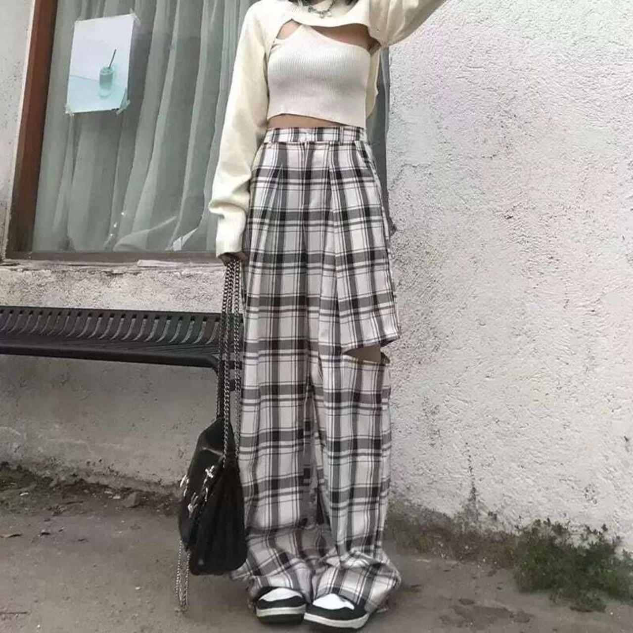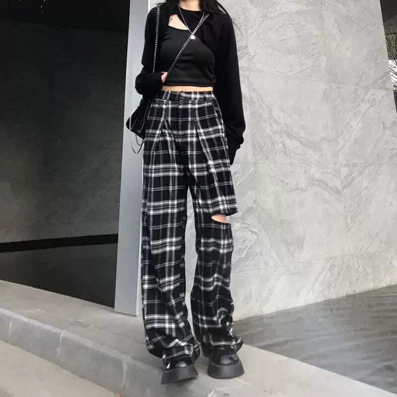 チェックパンツ ハイウエスト ロングパンツ ワイドパンツ カットアウト チェック柄 カットデザイン オープンデザイン カジュアル メンズライク ストリート クラシカル 韓国ファッション 2color S-4XL