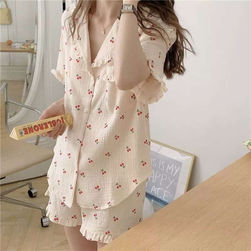 さらりと夏も快適おうち時間♡ チェリーが可愛い ツーピース パジャマ 上下2点セット シャツ パンツ ショートパンツ セットアップ フリル 襟付き ルームウェア おうち フルーツ柄