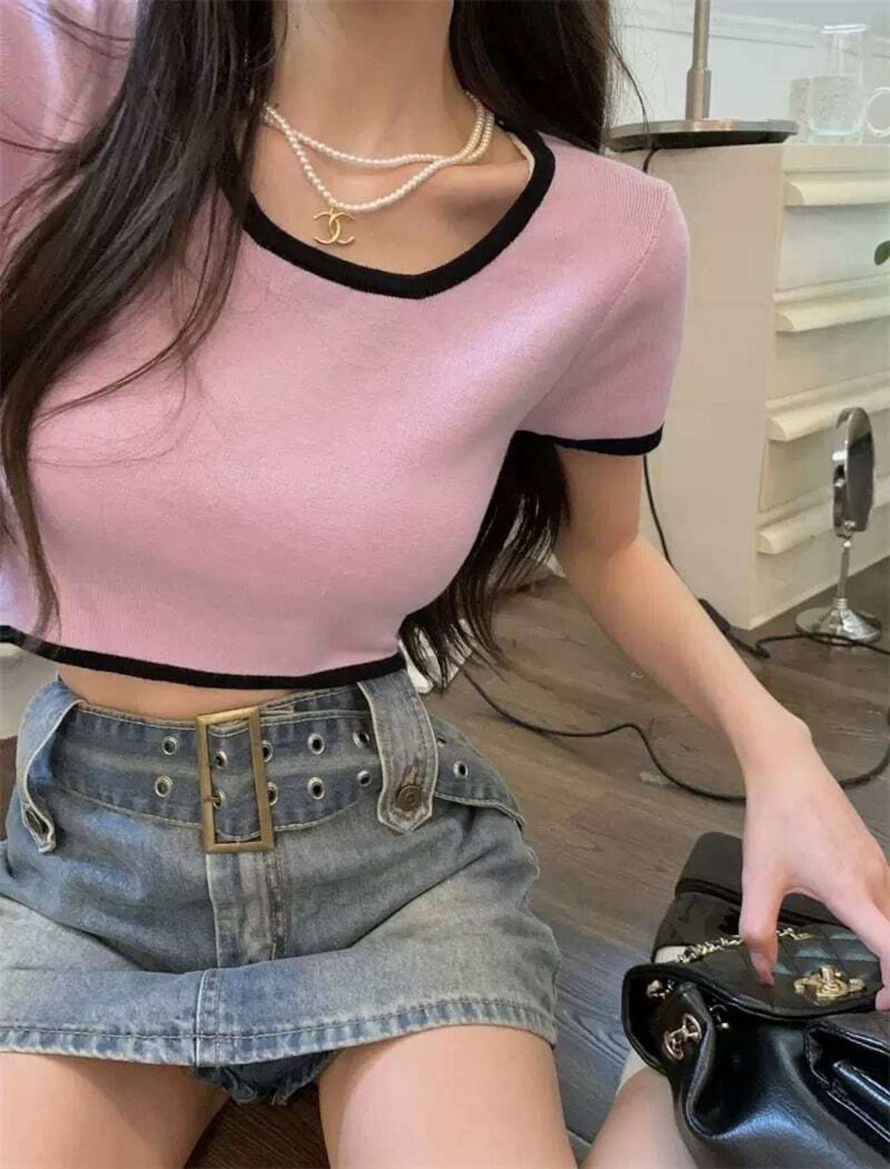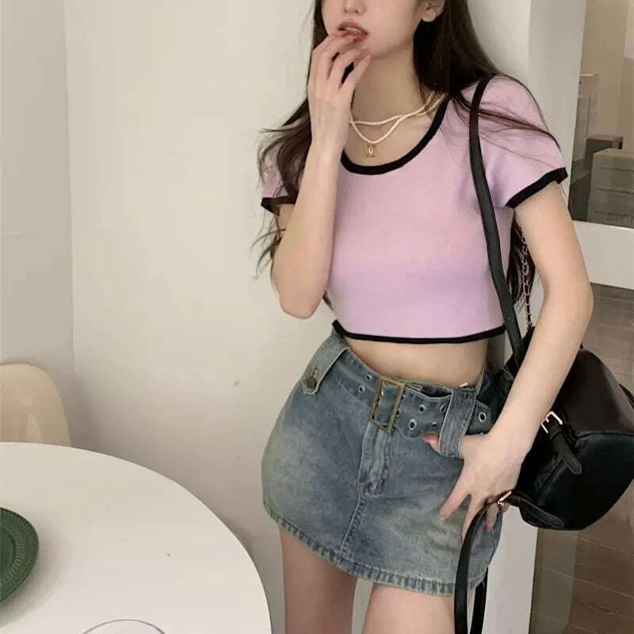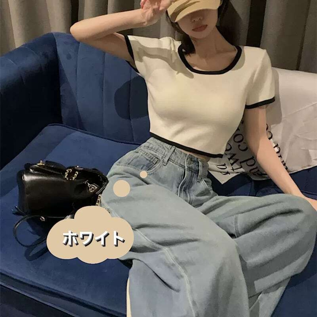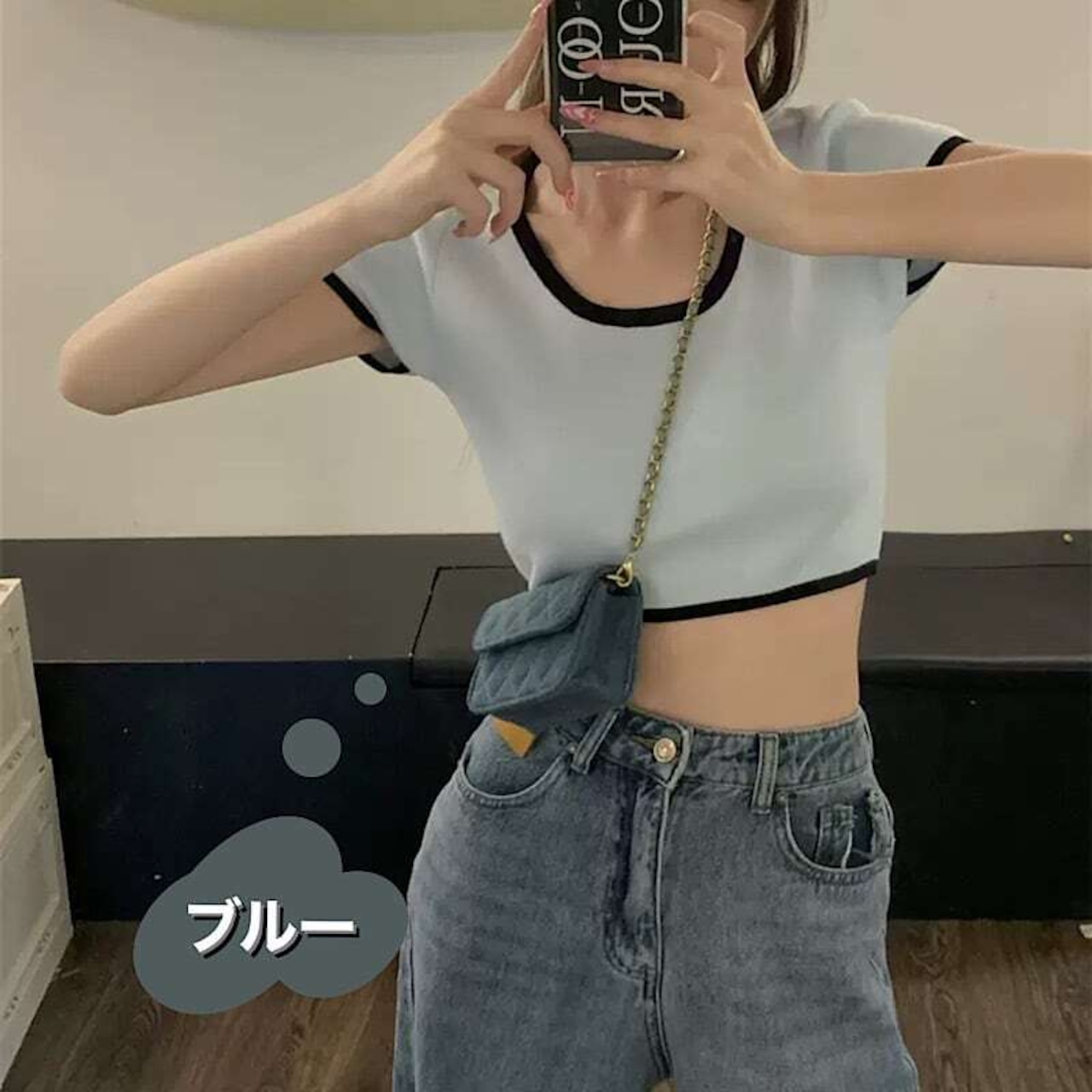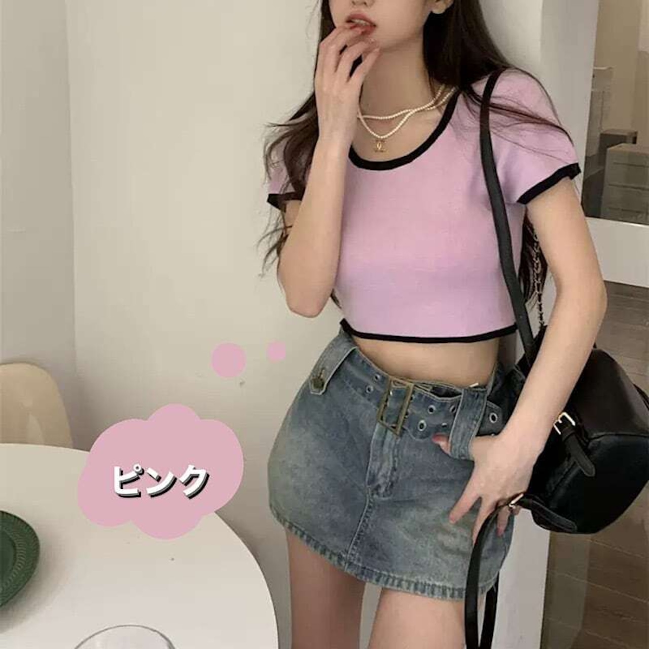 垢抜けファッションにはショート丈が◎ 韓国っぽ バイカラー トップス 半袖 リンガーデザイン Tシャツ カットソー クロップド丈 女っぽ カジュアル 脚長効果