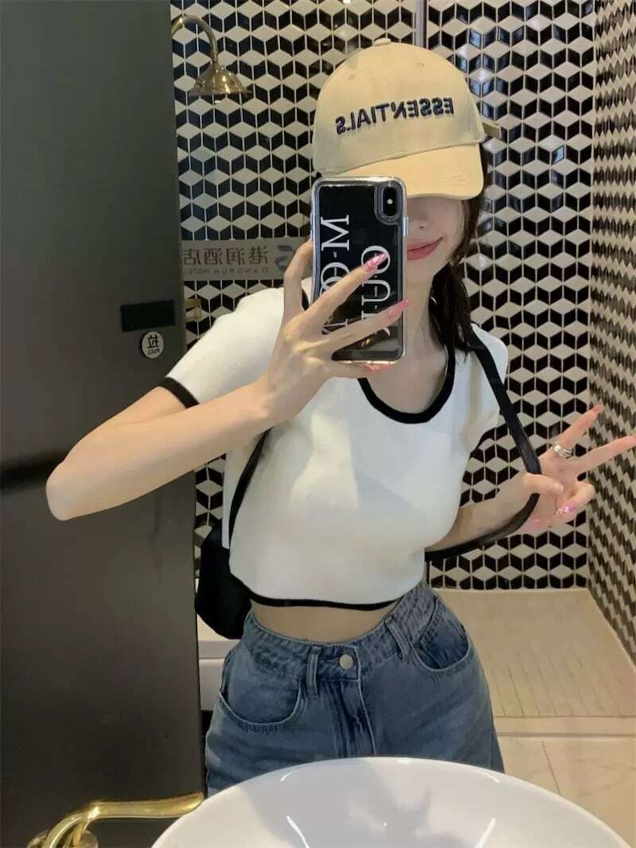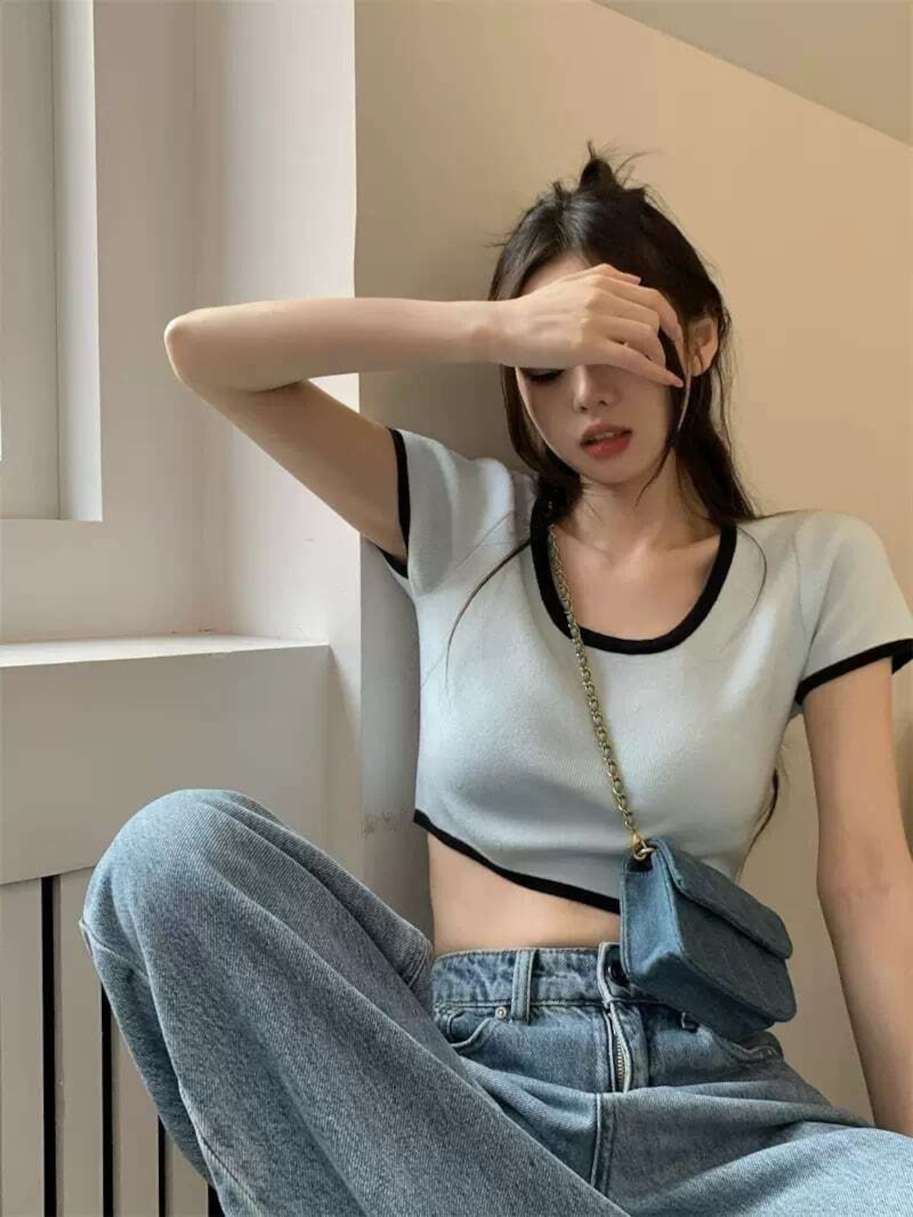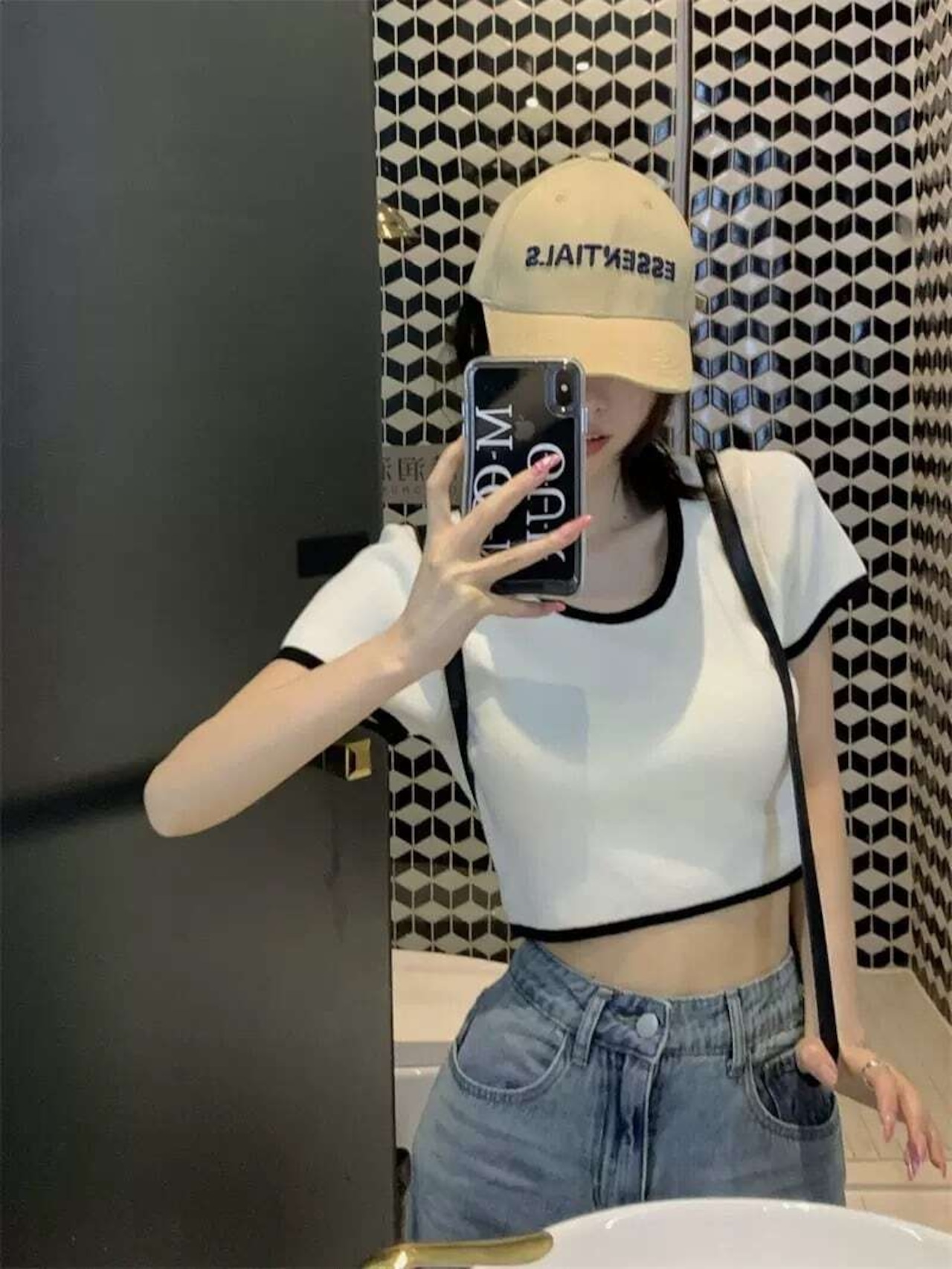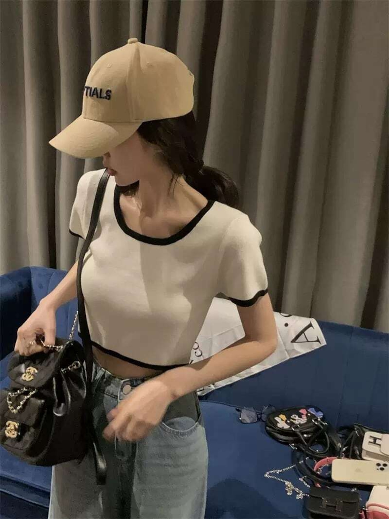 垢抜けファッションにはショート丈が◎ 韓国っぽ バイカラー トップス 半袖 リンガーデザイン Tシャツ カットソー クロップド丈 女っぽ カジュアル 脚長効果