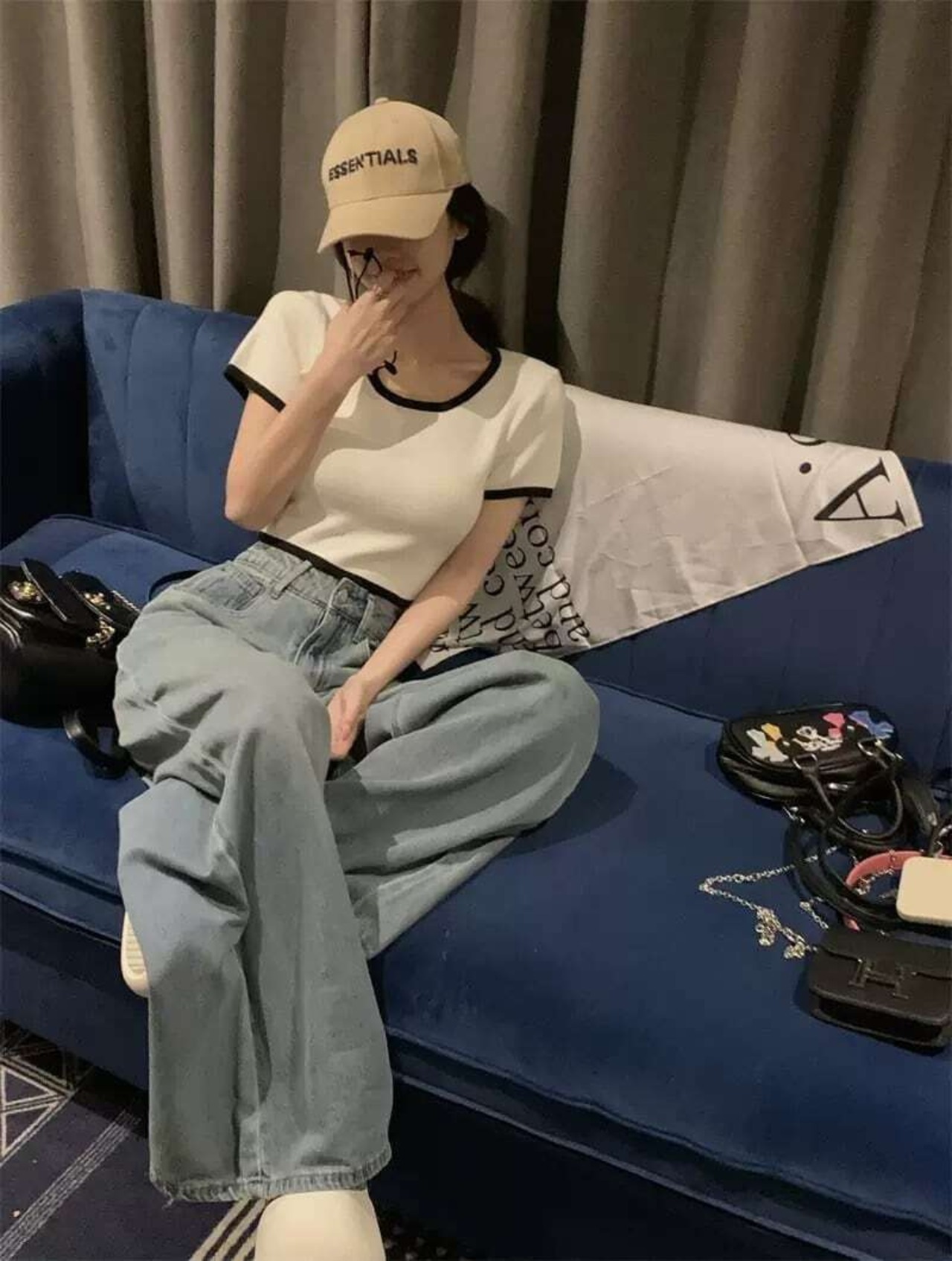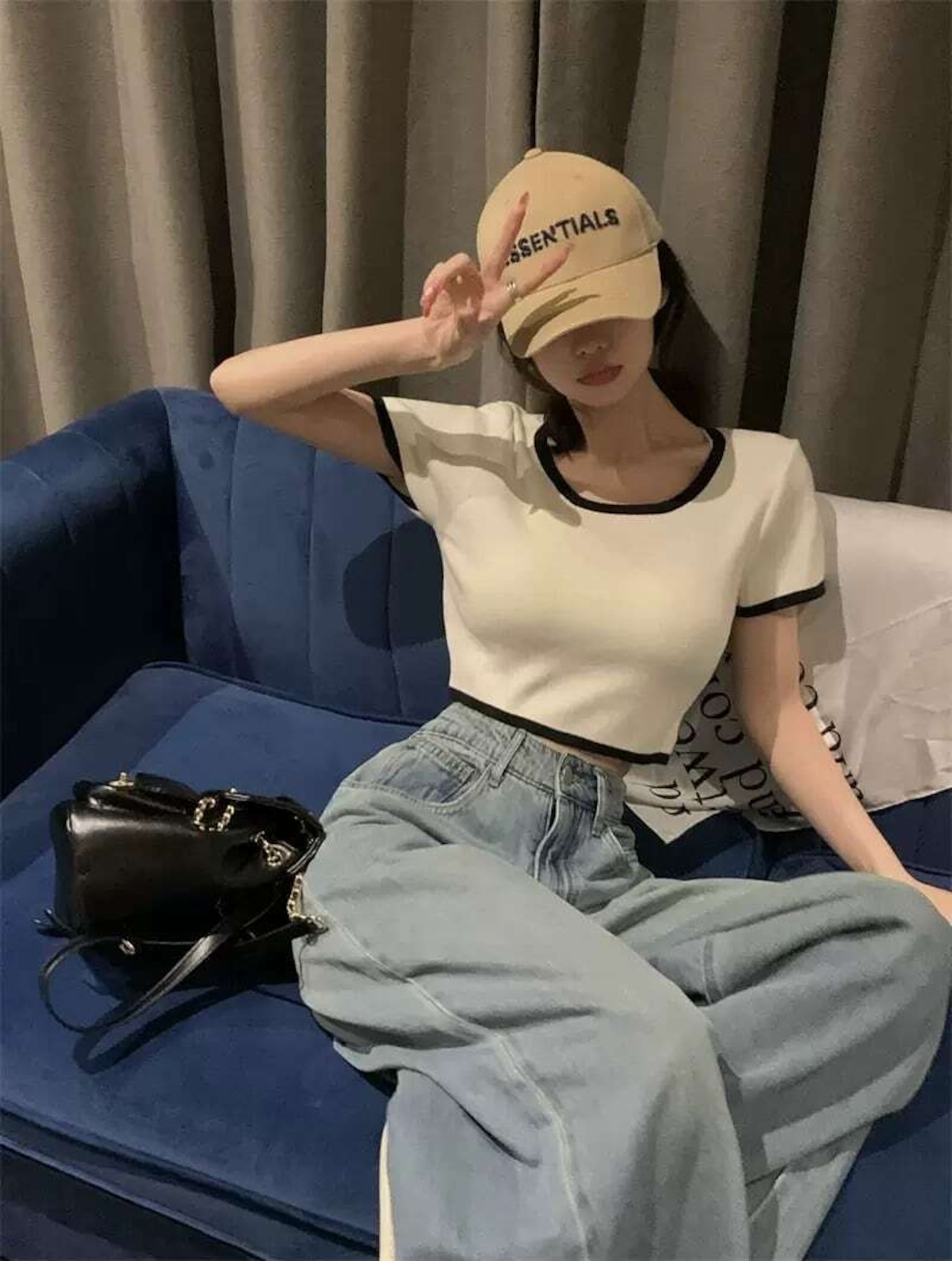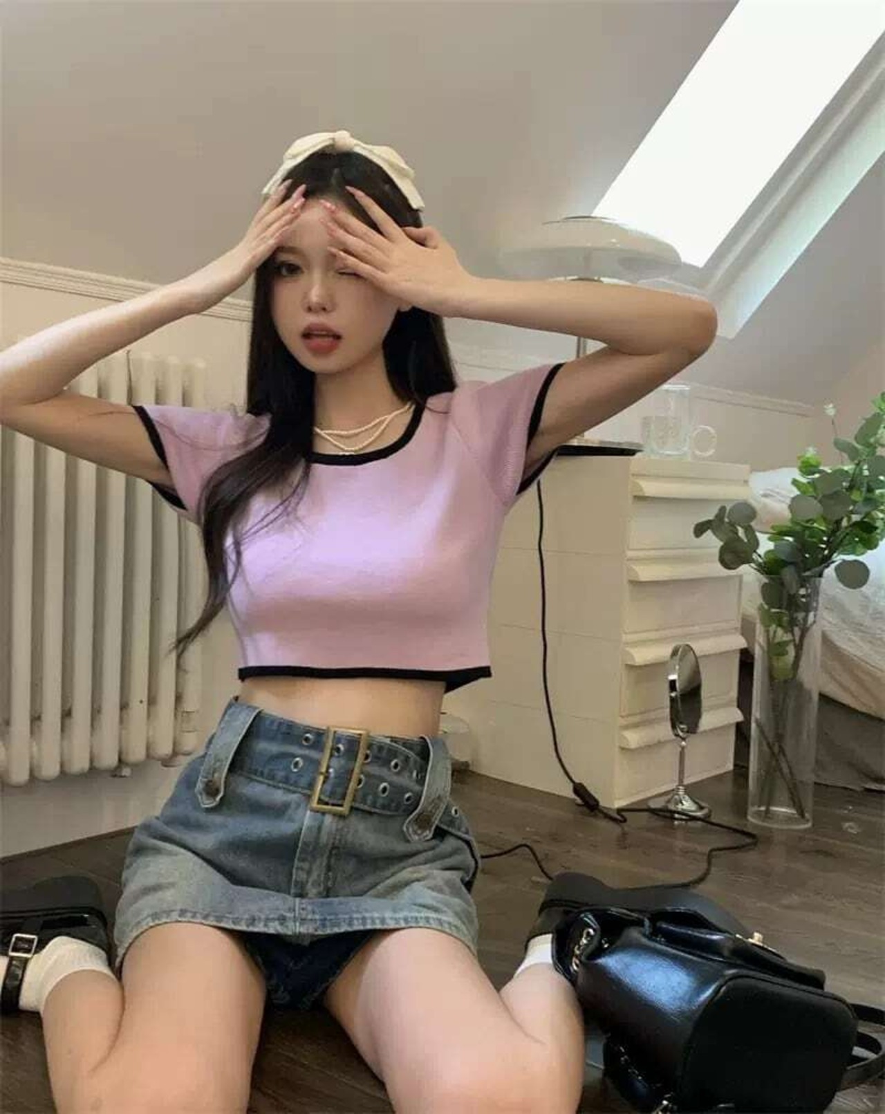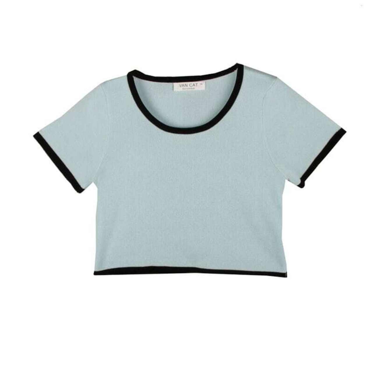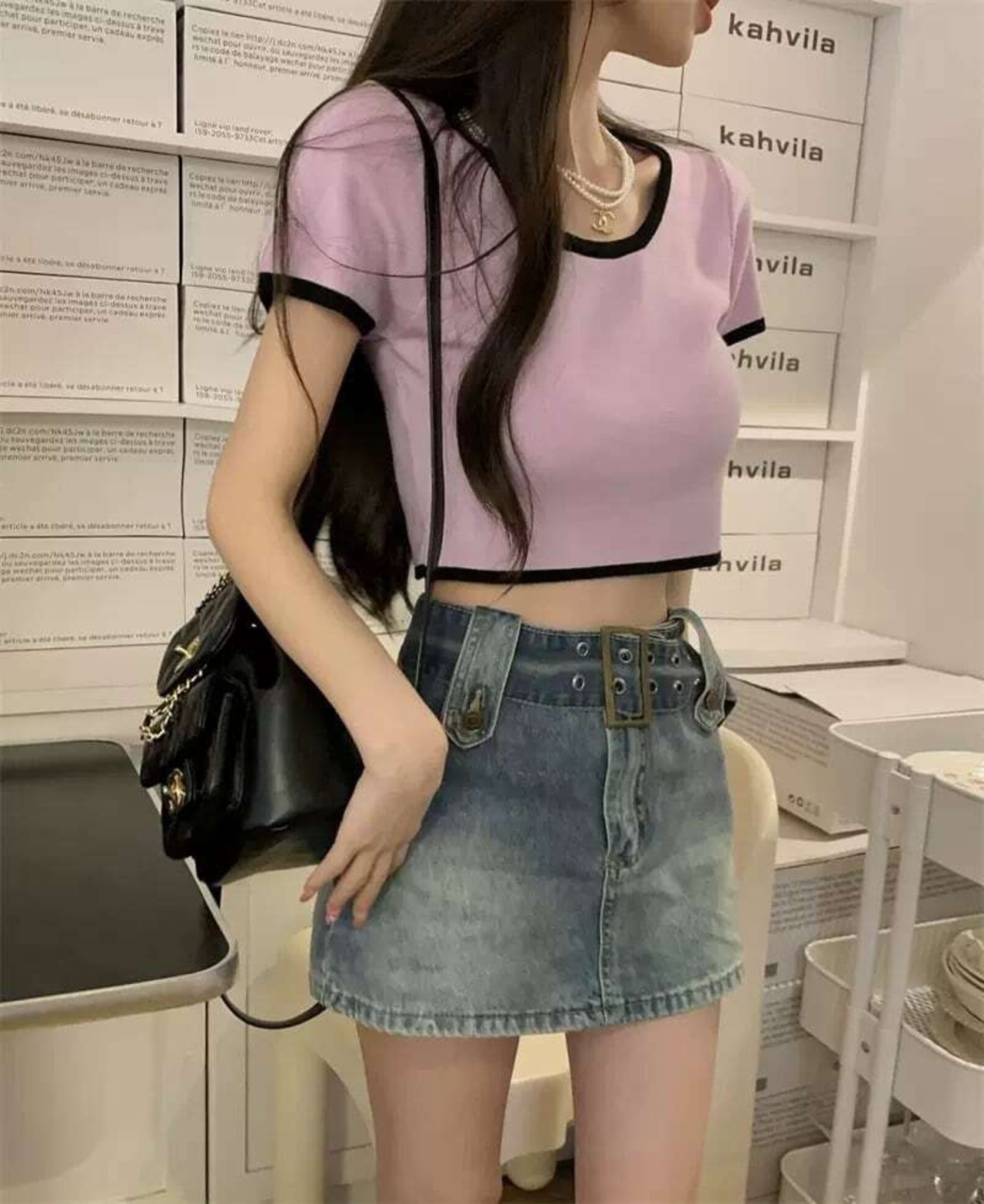 垢抜けファッションにはショート丈が◎ 韓国っぽ バイカラー トップス 半袖 リンガーデザイン Tシャツ カットソー クロップド丈 女っぽ カジュアル 脚長効果