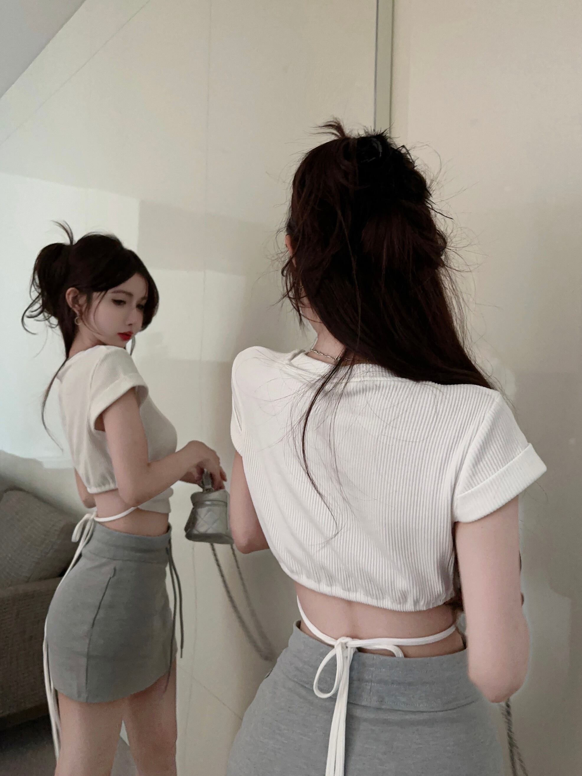 スリムトップス 半袖 Tシャツ タイト 無地 リボン クロップド シンプル 韓国ファッション 2color S-L