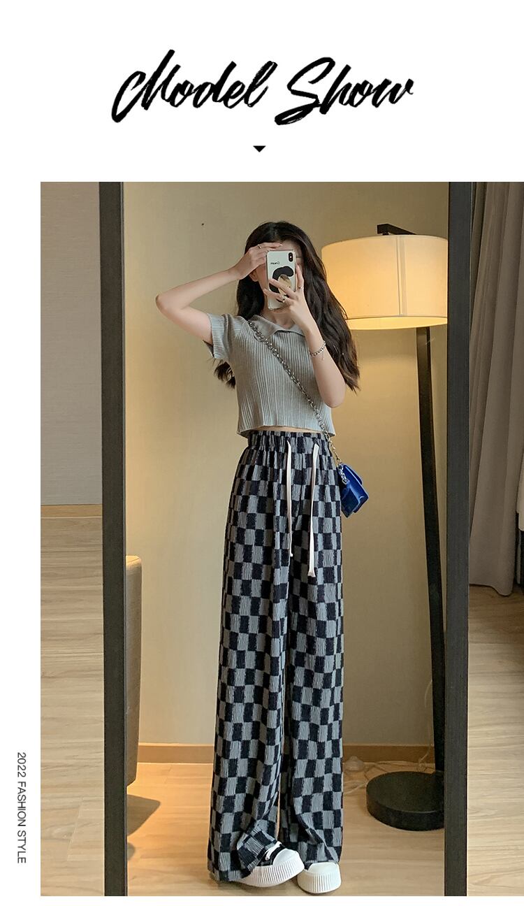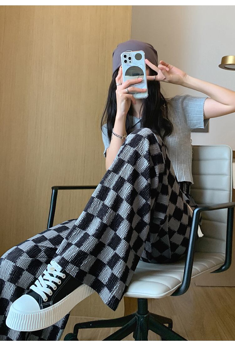 チェックパンツ カジュアルパンツ ロングパンツ ブロックチェック ボトム ハイウエスト ルーズ シンプル カジュアル 韓国ファッション S-XL 2color