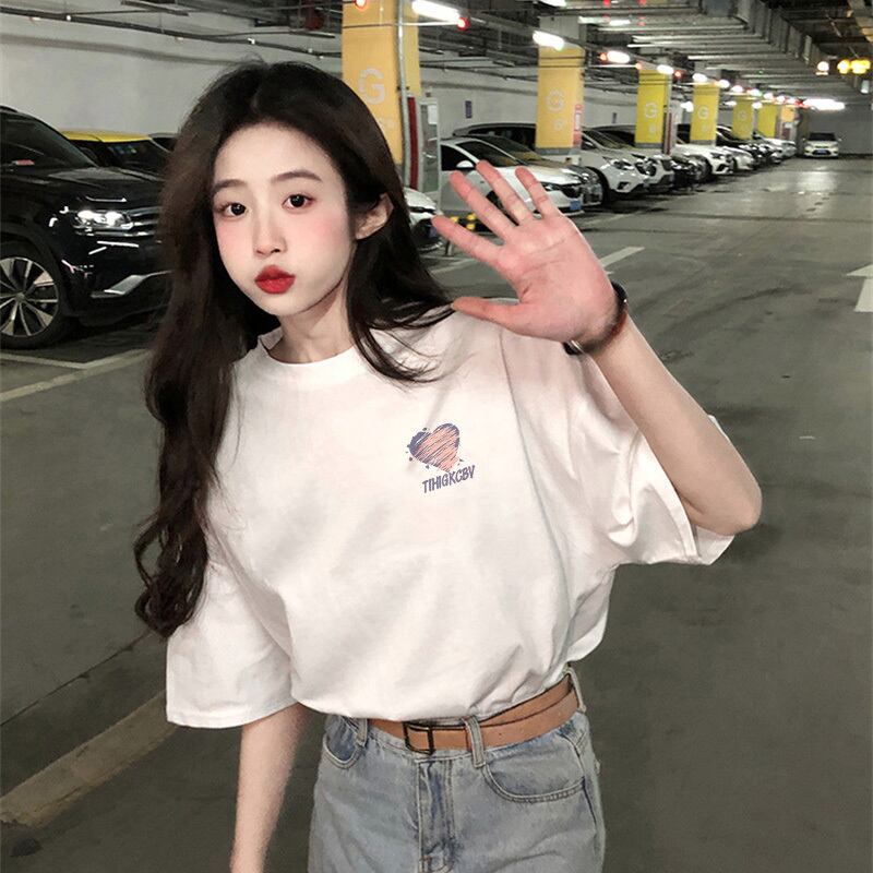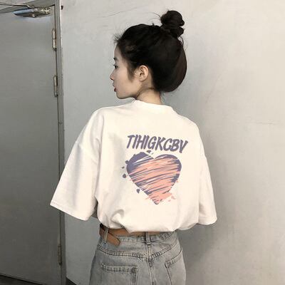 バックプリントTシャツ ハート トップス 半袖 ゆったり ルーズ 着回し シンプル カジュアル レトロ 韓国ファッション 2color S-2XL